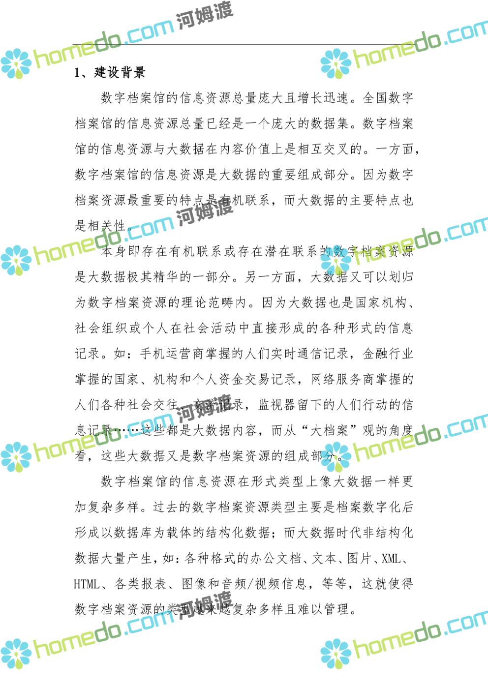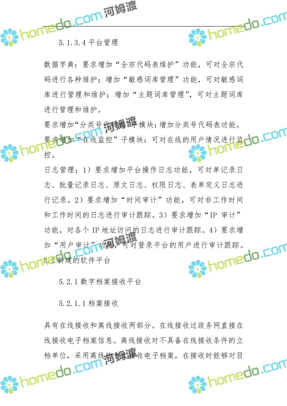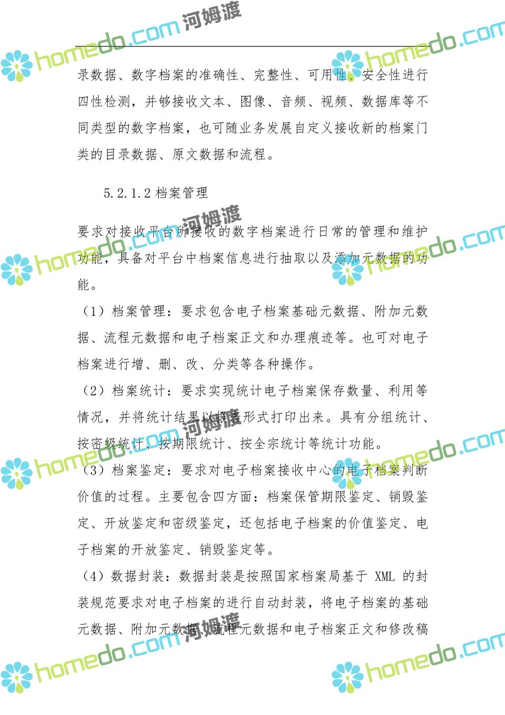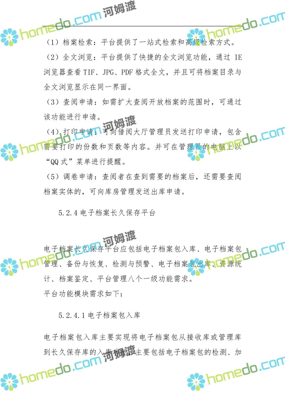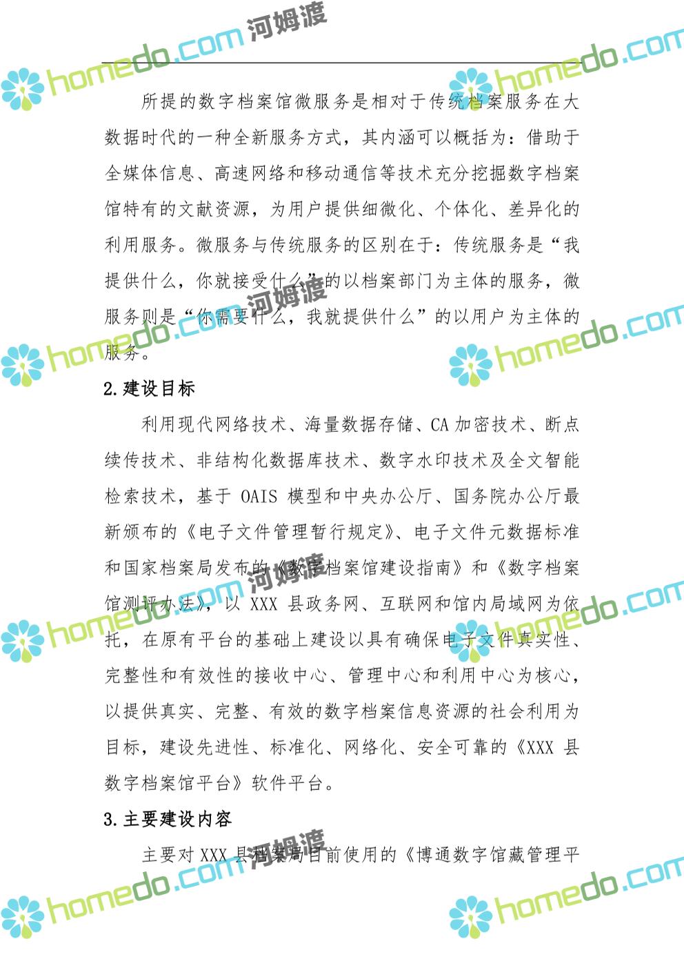 方案简介 利用现代网络技术、海量数据存储、CA加密技术、断点续传技术、非结构化数据库技术、数字水印技术及全文智能检索技术,基于OAIS模型和中央办公厅、国务院办公厅最新颁布的《电子文件管理暂行规定》、电子文件元数据标准和国家档案局发布的《数字档案馆建设指南》和《数字档案馆测评办法》,以XXX县政务网、互联网和馆内局域网为依托,在原有平台的基础上建设以具有确保电子文件真实性、完整性和有效性的接收中心、管理中心和利用中心为核心,以提供真实、完整、有效的数字档案信息资源的社会利用为目标,建设先进性、标准化、网络化、安全可靠的《XXX县数字档案馆平台》软件平台。
