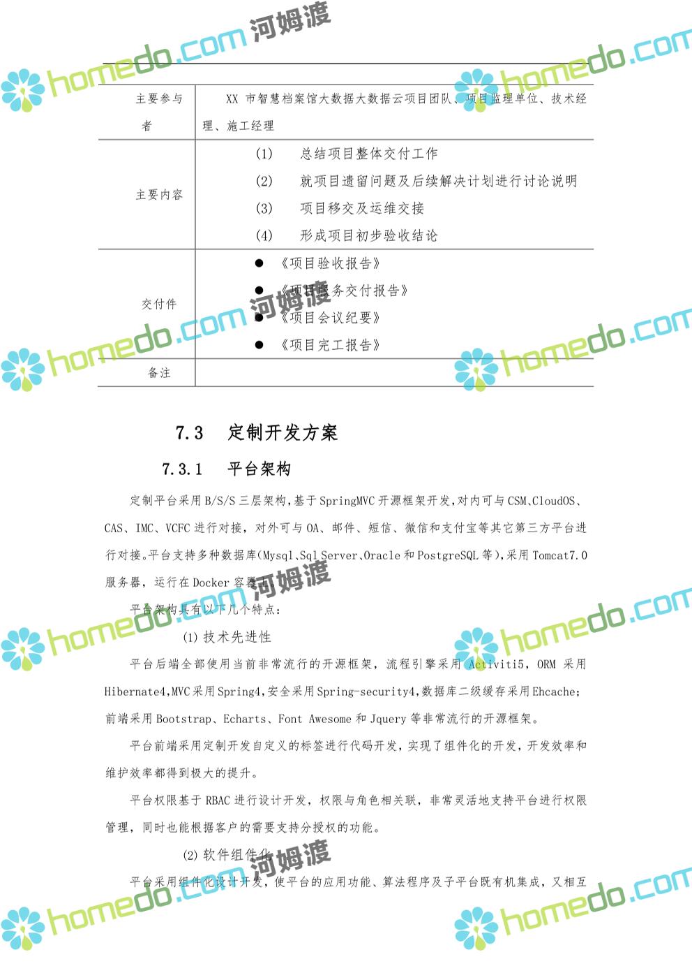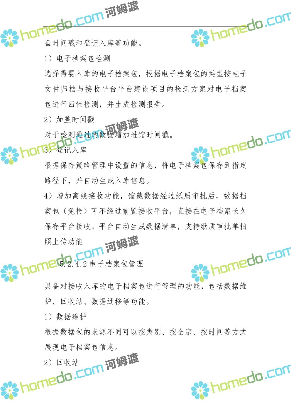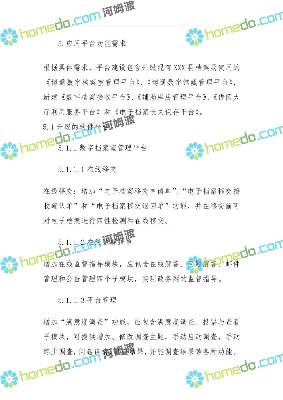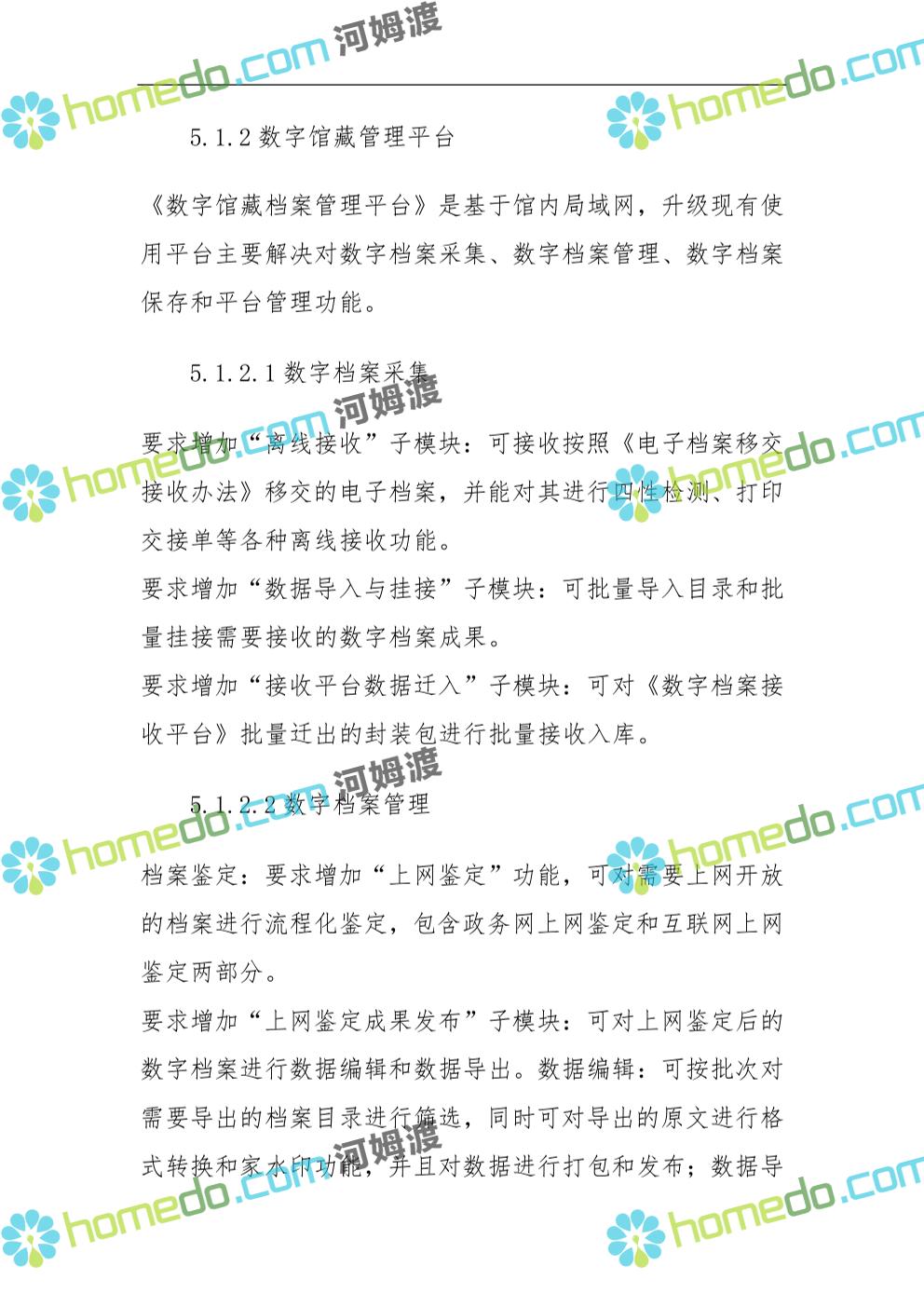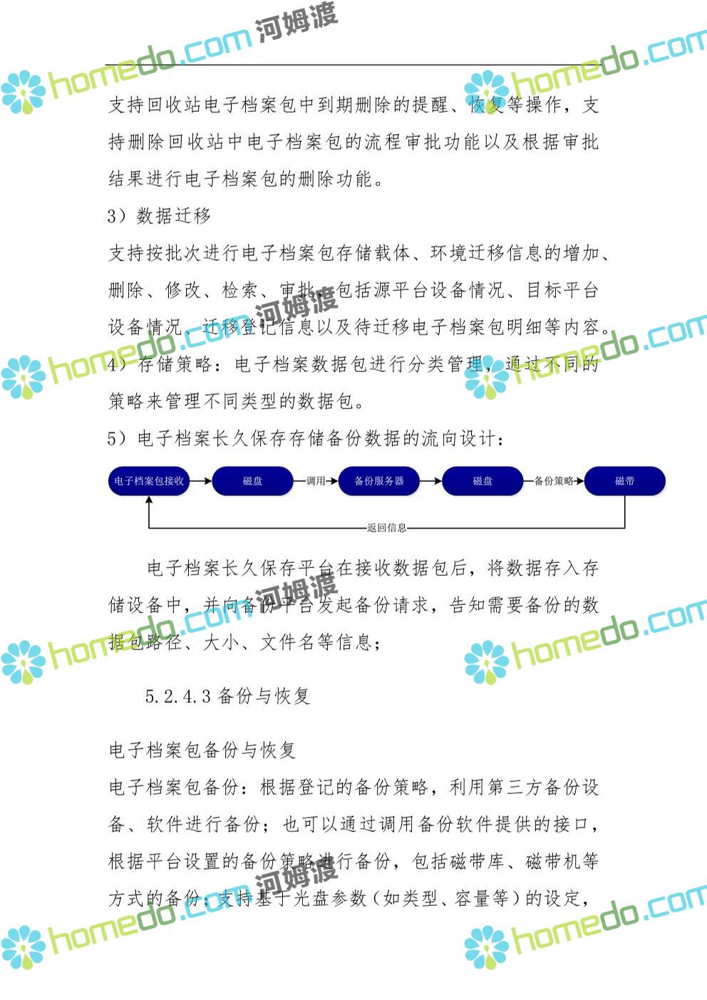 方案简介 利用现代网络技术、海量数据存储、CA加密技术、断点续传技术、非结构化数据库技术、数字水印技术及全文智能检索技术,基于OAIS模型和中央办公厅、国务院办公厅最新颁布的《电子文件管理暂行规定》、电子文件元数据标准和国家档案局发布的《数字档案馆建设指南》和《数字档案馆测评办法》,以XXX县政务网、互联网和馆内局域网为依托,在原有平台的基础上建设以具有确保电子文件真实性、完整性和有效性的接收中心、管理中心和利用中心为核心,以提供真实、完整、有效的数字档案信息资源的社会利用为目标,建设先进性、标准化、网络化、安全可靠的《XXX县数字档案馆平台》软件平台。