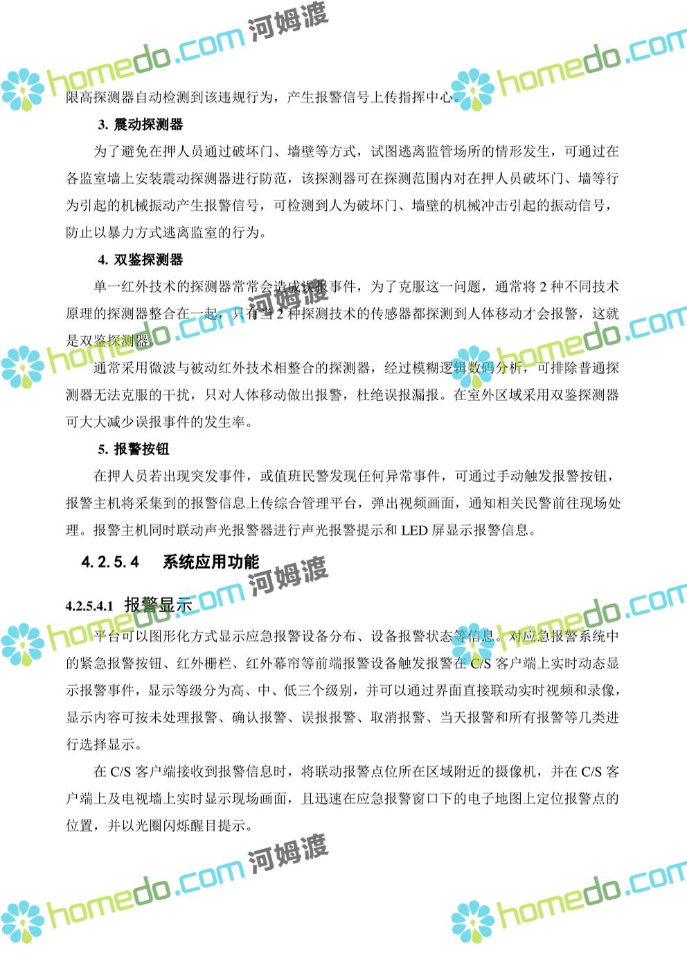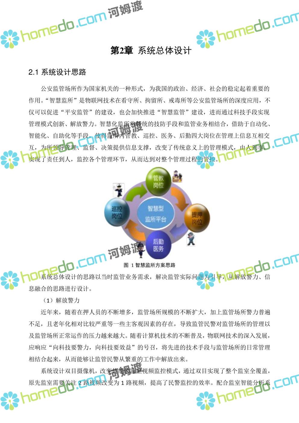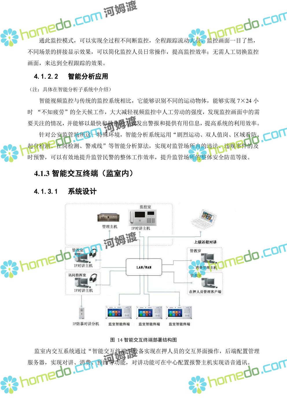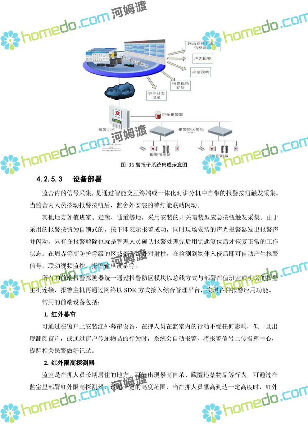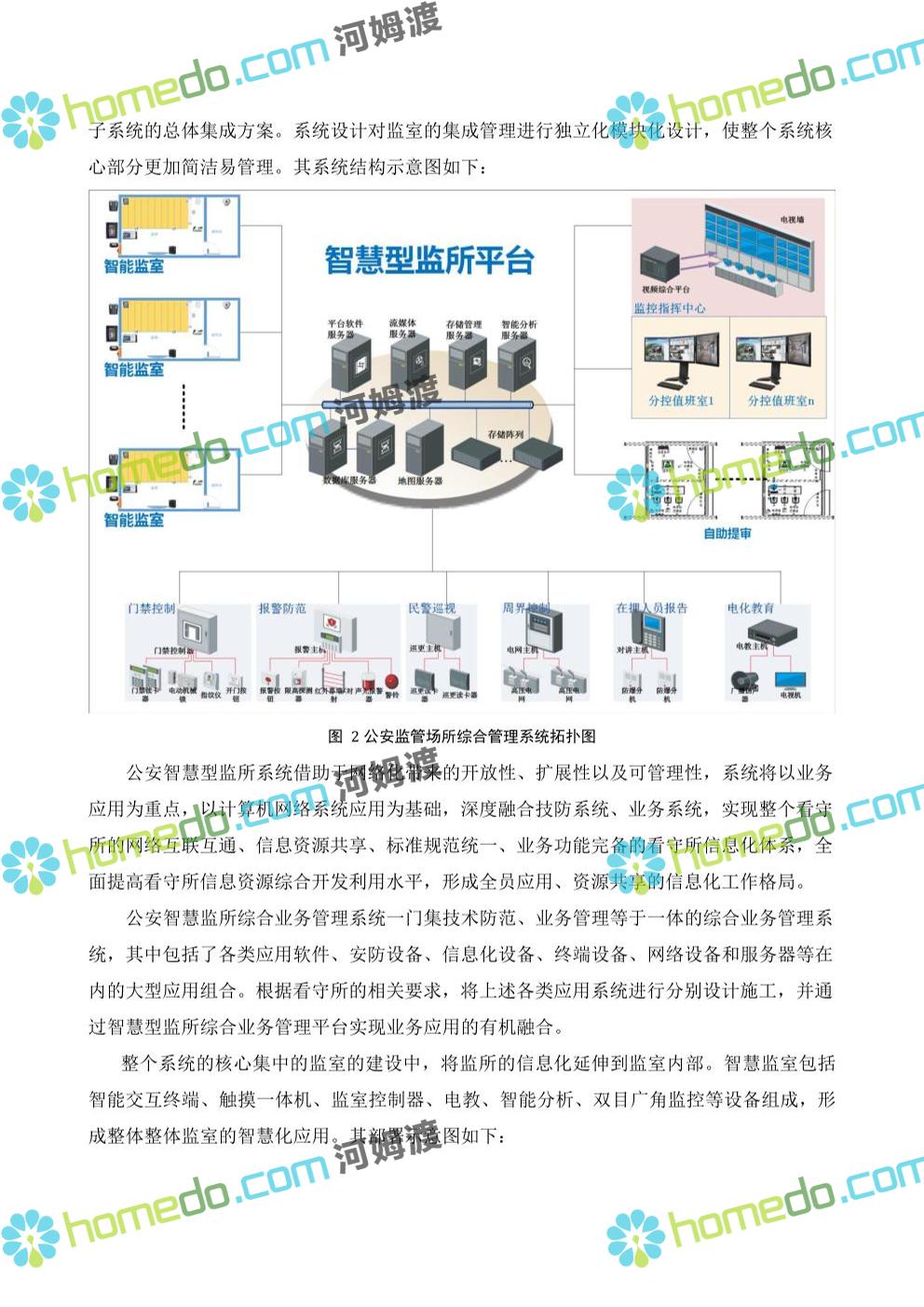 方案简介 根据实际工作需求,以及看守所技术建设规范,此项目建设 个子系统,分别为智能监室系统、应急警报系统、周界控制系统、违禁物品检测系统、监区门禁系统、监控系统、在押人员报告系统、会见管理系统、电化教育(广播)系统、民警巡视管理系统、讯问指挥系统、智能巡视系统、在押人员消费系统、公共区域监控系统、监控中心等系统。
