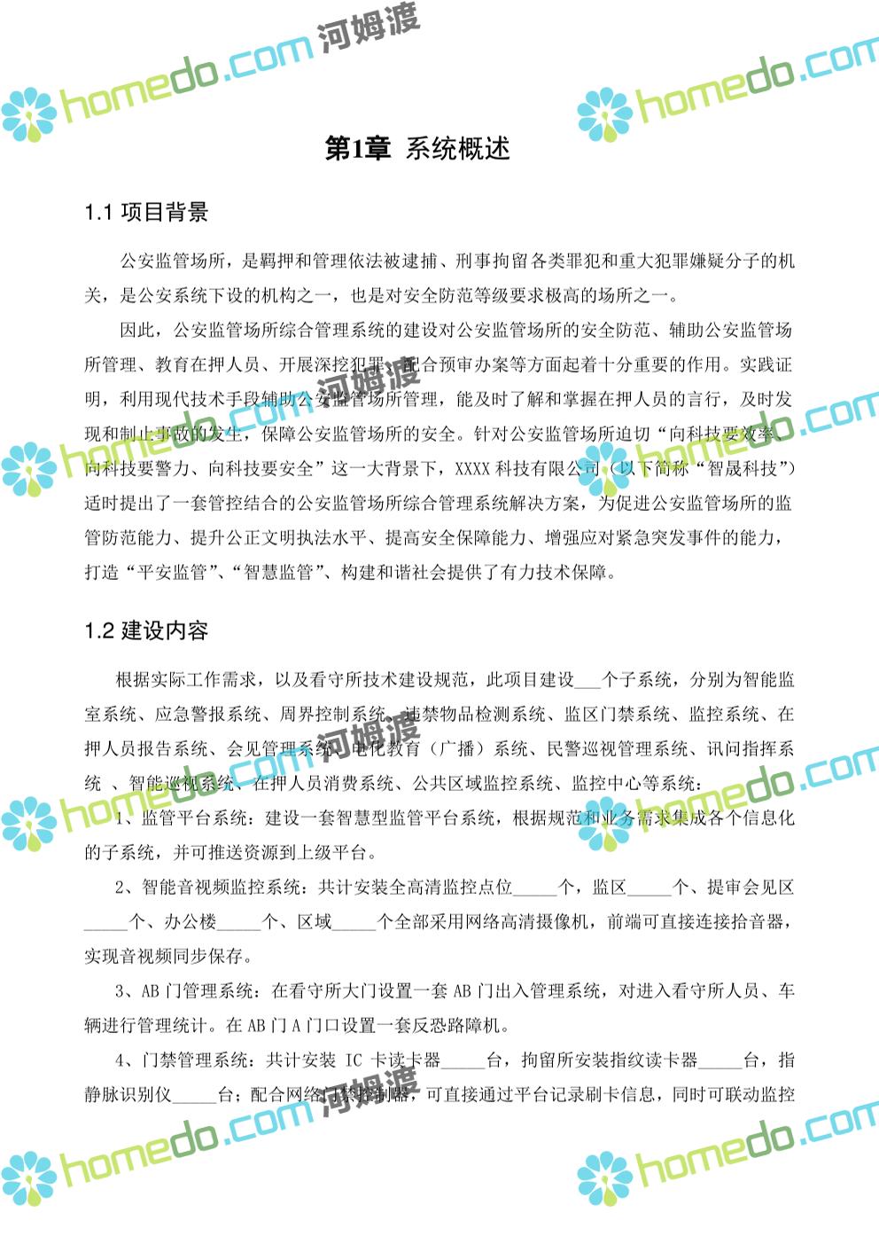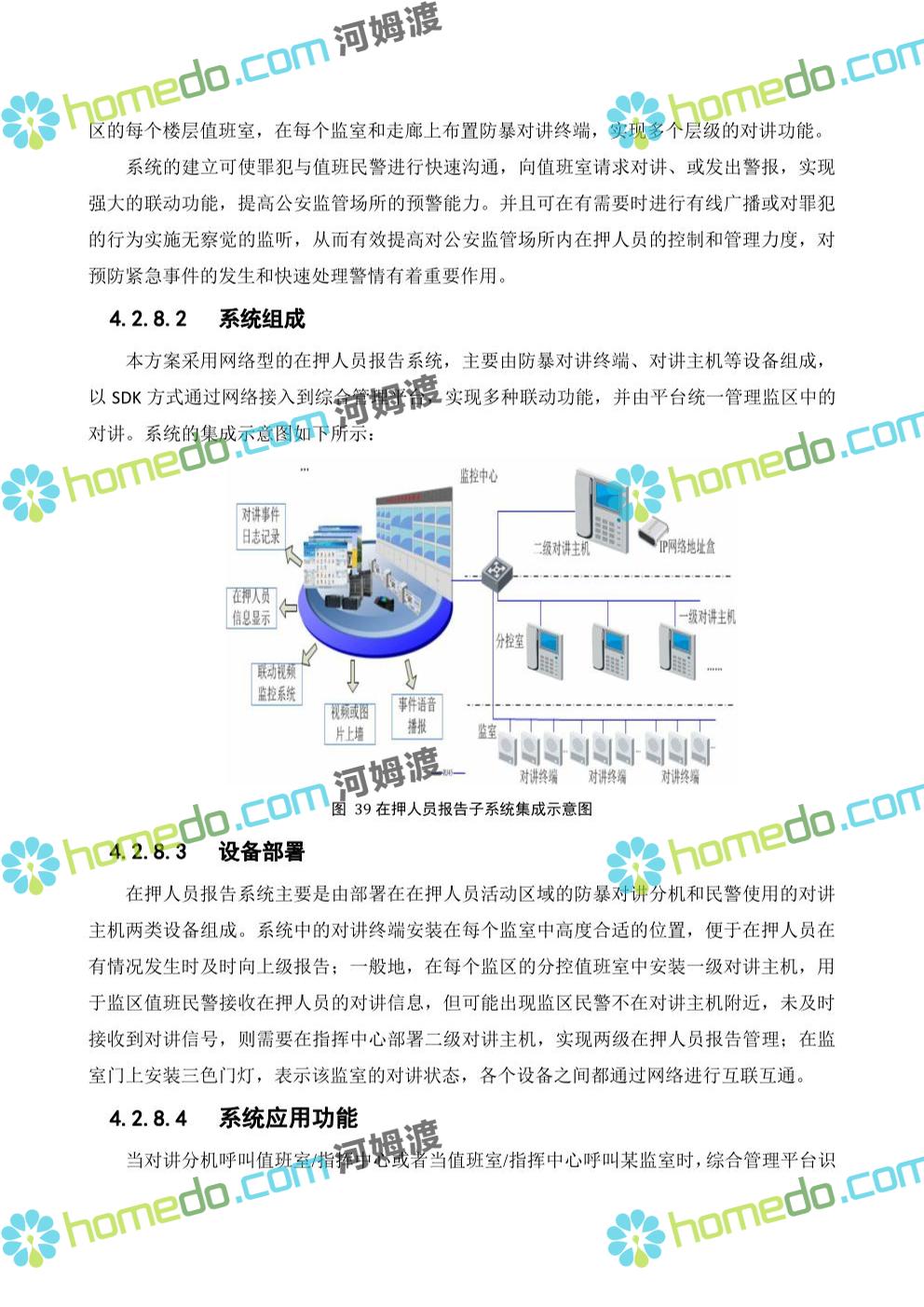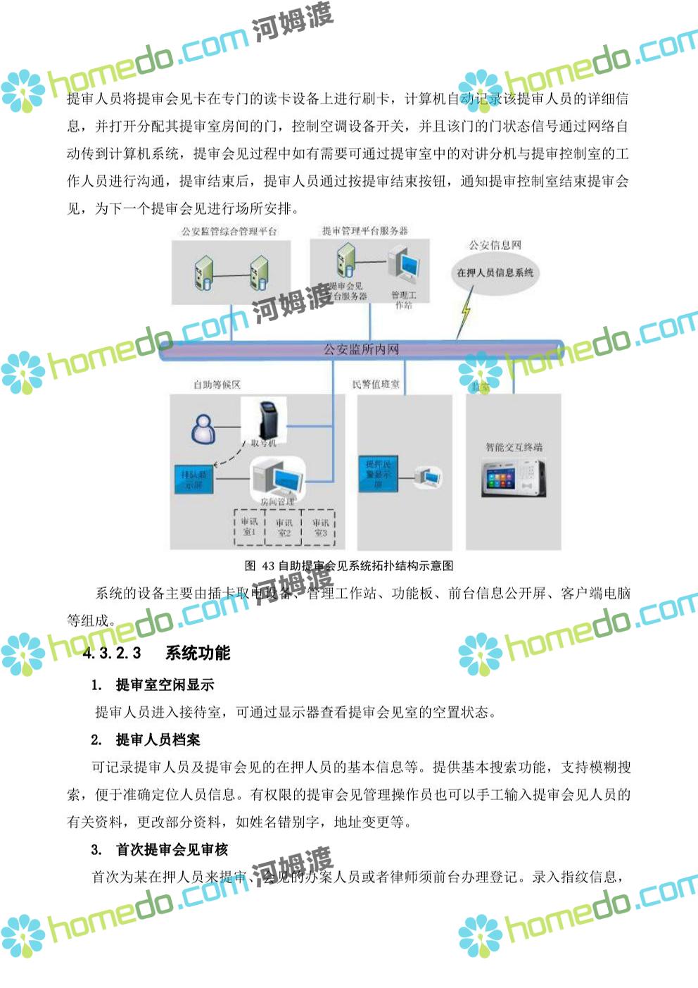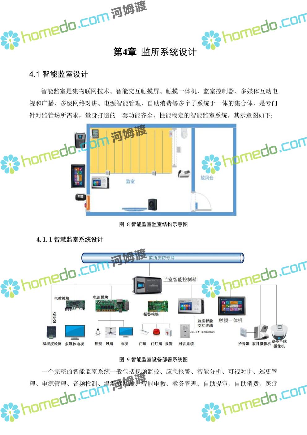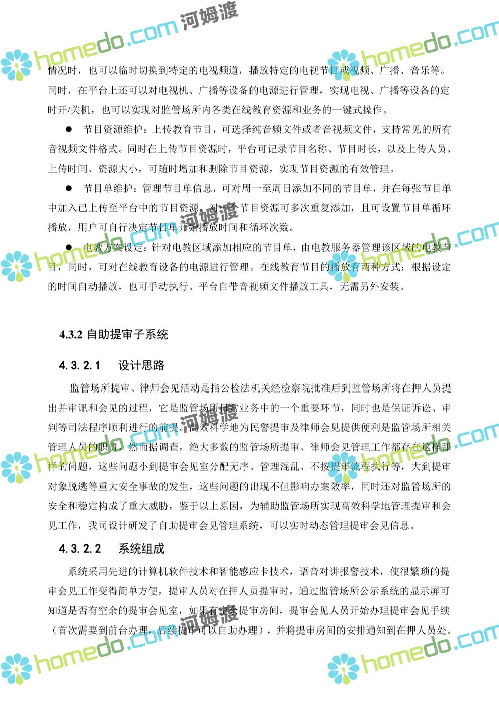 方案简介 根据实际工作需求,以及看守所技术建设规范,此项目建设 个子系统,分别为智能监室系统、应急警报系统、周界控制系统、违禁物品检测系统、监区门禁系统、监控系统、在押人员报告系统、会见管理系统、电化教育(广播)系统、民警巡视管理系统、讯问指挥系统、智能巡视系统、在押人员消费系统、公共区域监控系统、监控中心等系统。