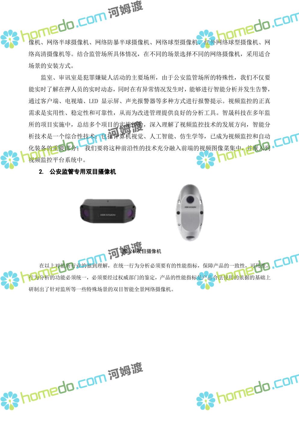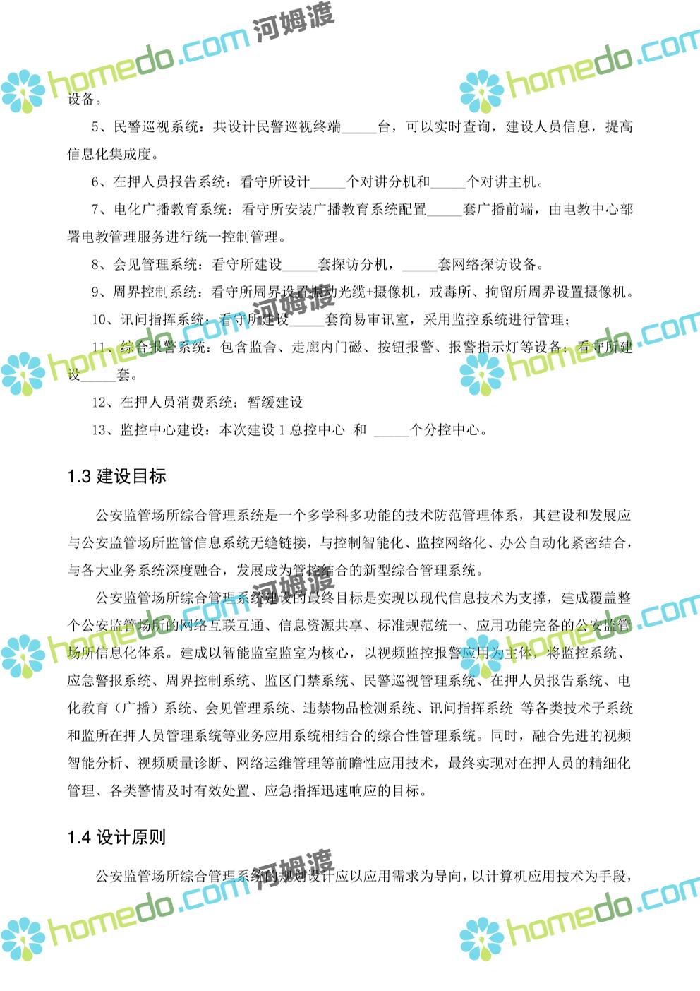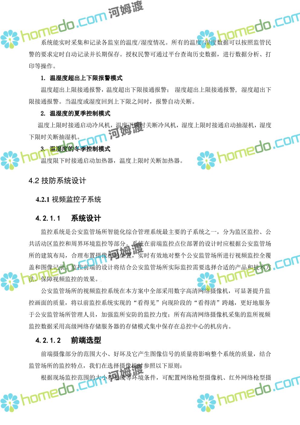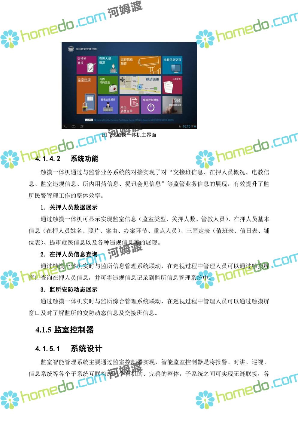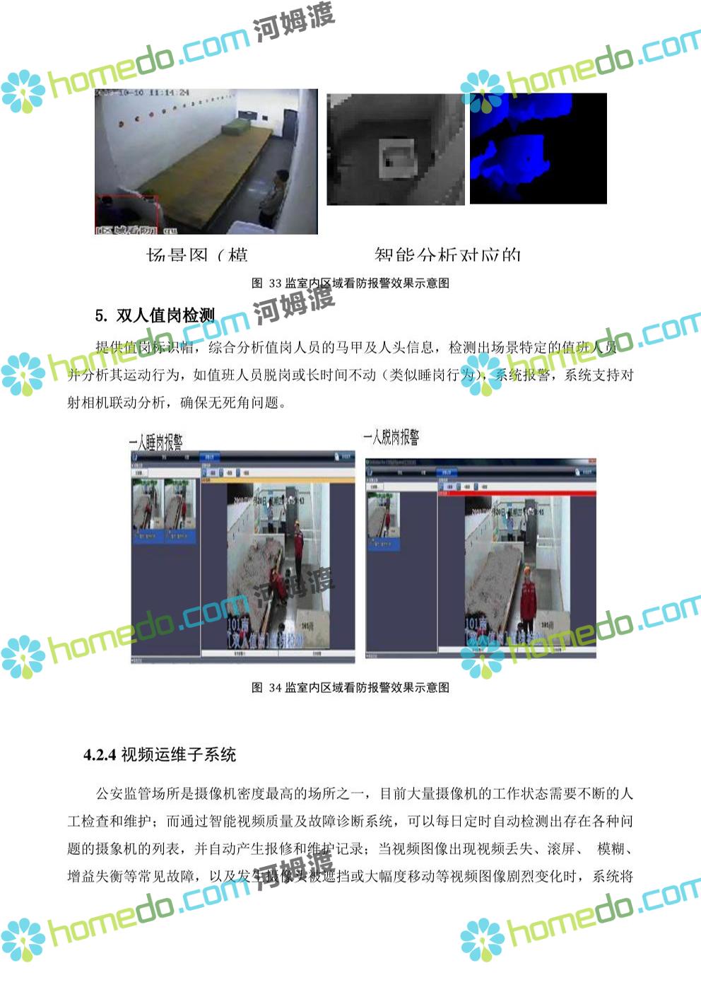 方案简介 根据实际工作需求,以及看守所技术建设规范,此项目建设 个子系统,分别为智能监室系统、应急警报系统、周界控制系统、违禁物品检测系统、监区门禁系统、监控系统、在押人员报告系统、会见管理系统、电化教育(广播)系统、民警巡视管理系统、讯问指挥系统、智能巡视系统、在押人员消费系统、公共区域监控系统、监控中心等系统。
