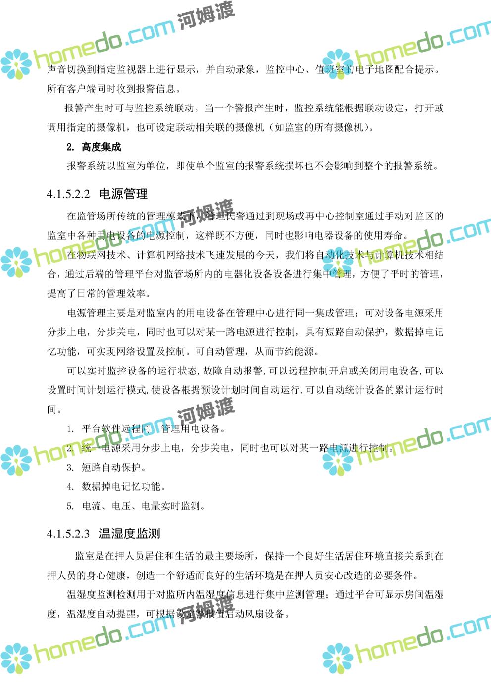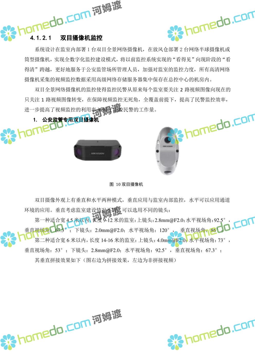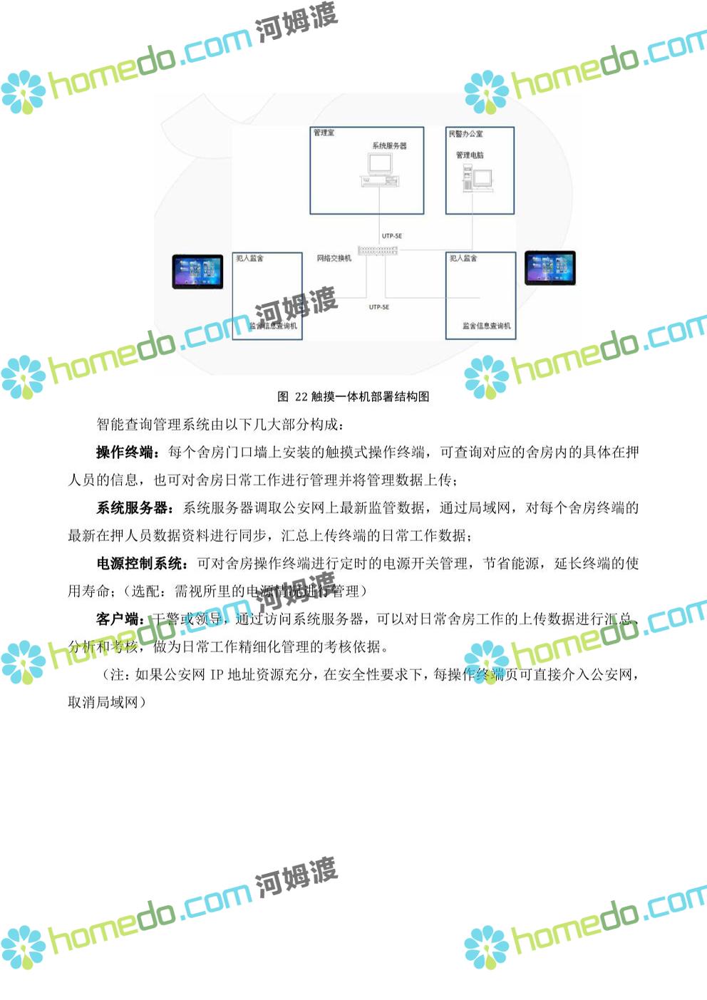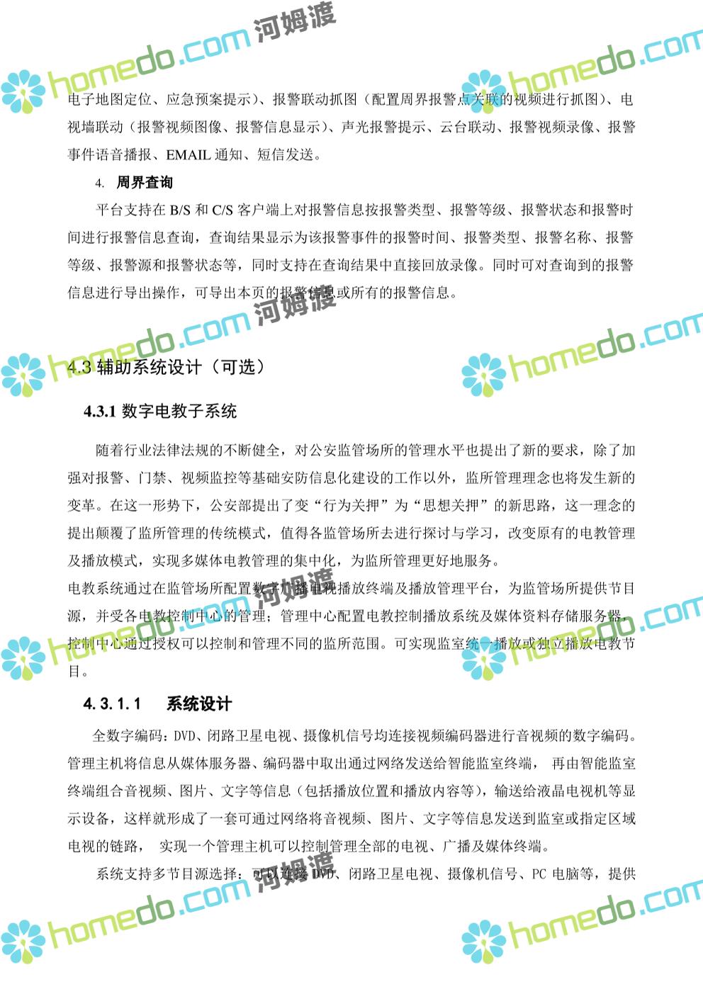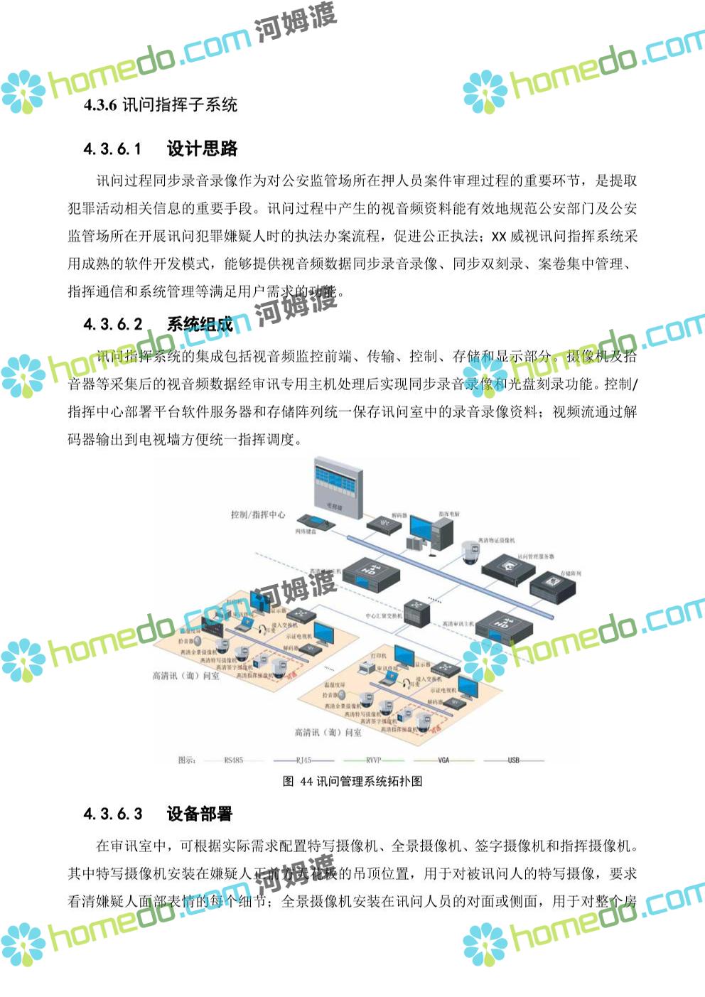 方案简介 根据实际工作需求,以及看守所技术建设规范,此项目建设 个子系统,分别为智能监室系统、应急警报系统、周界控制系统、违禁物品检测系统、监区门禁系统、监控系统、在押人员报告系统、会见管理系统、电化教育(广播)系统、民警巡视管理系统、讯问指挥系统、智能巡视系统、在押人员消费系统、公共区域监控系统、监控中心等系统。