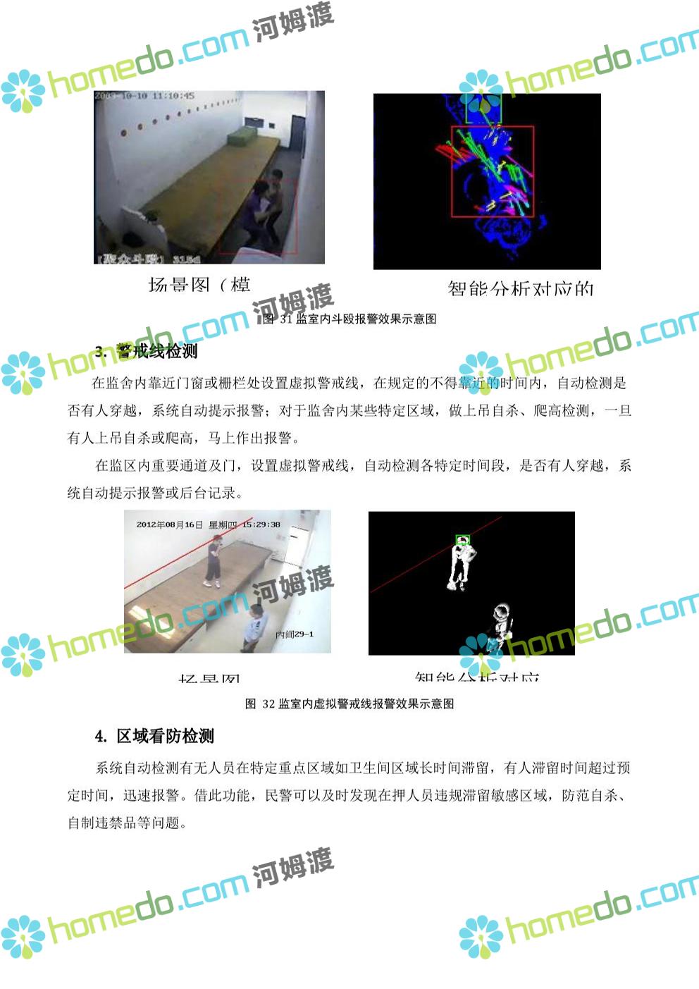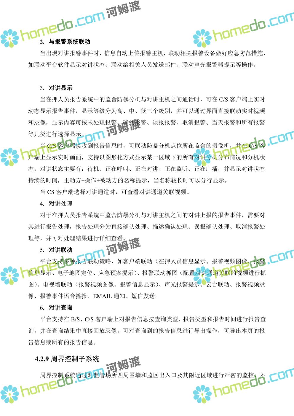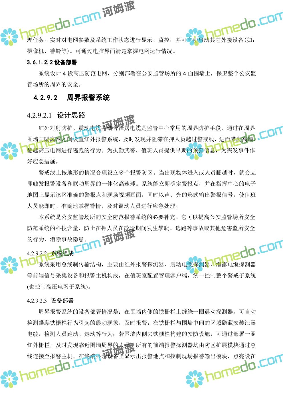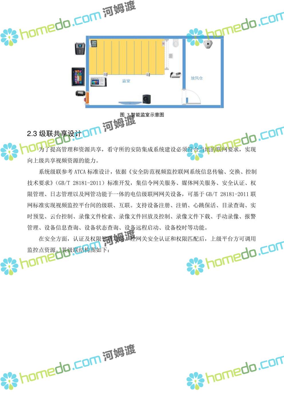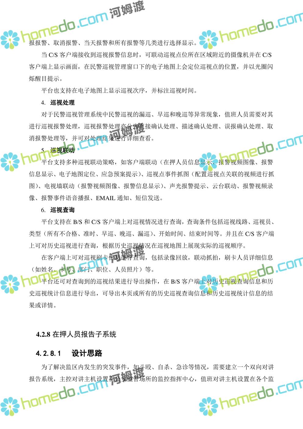 方案简介 根据实际工作需求,以及看守所技术建设规范,此项目建设 个子系统,分别为智能监室系统、应急警报系统、周界控制系统、违禁物品检测系统、监区门禁系统、监控系统、在押人员报告系统、会见管理系统、电化教育(广播)系统、民警巡视管理系统、讯问指挥系统、智能巡视系统、在押人员消费系统、公共区域监控系统、监控中心等系统。