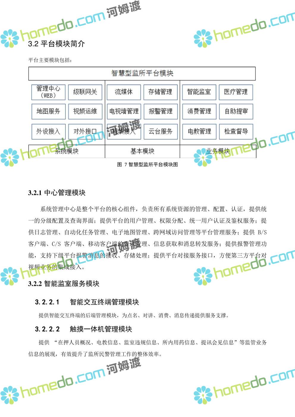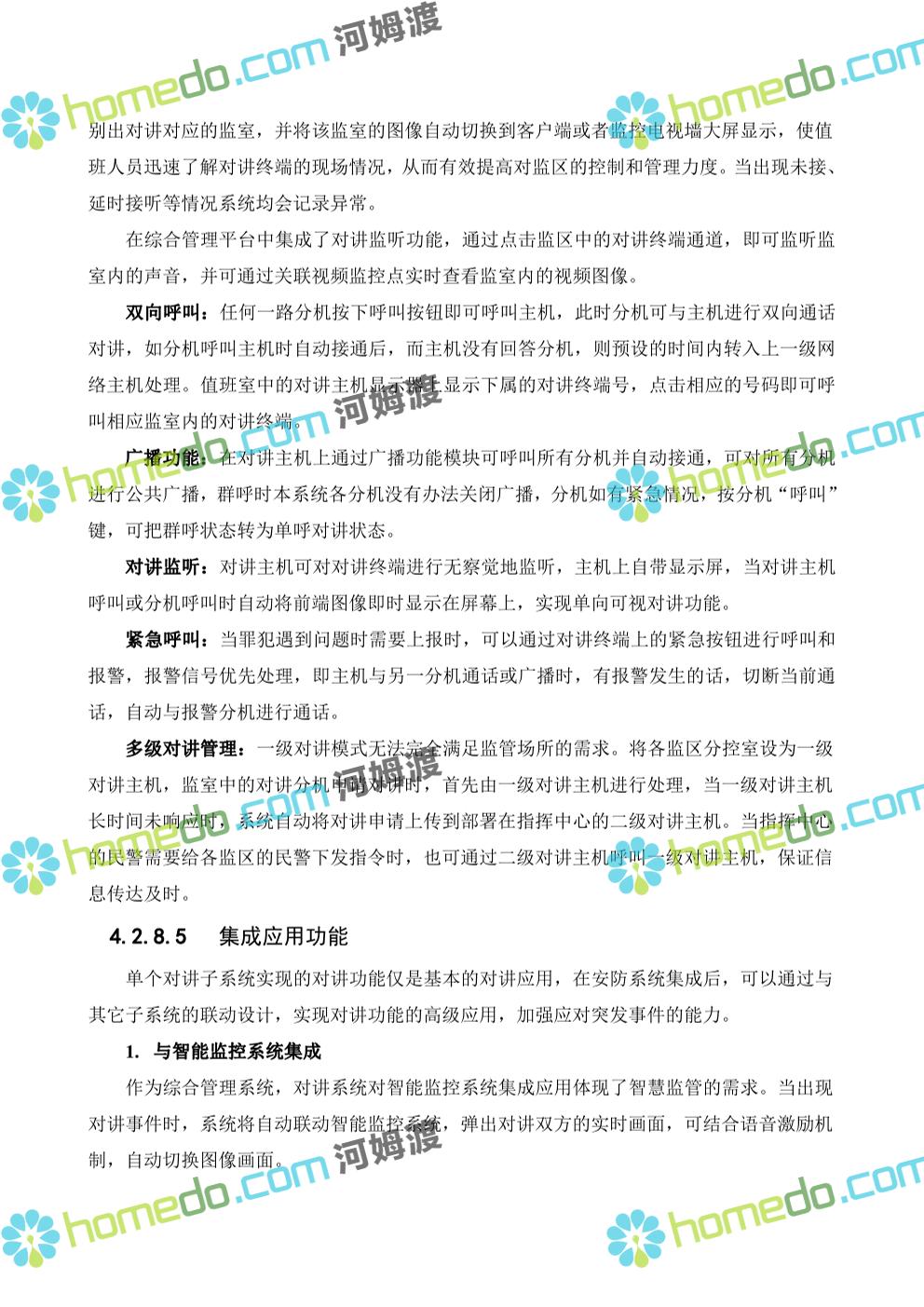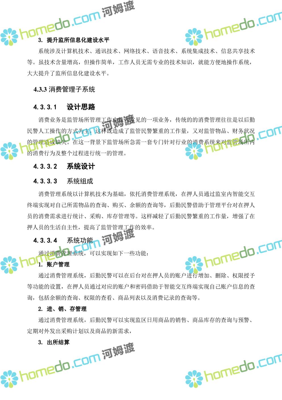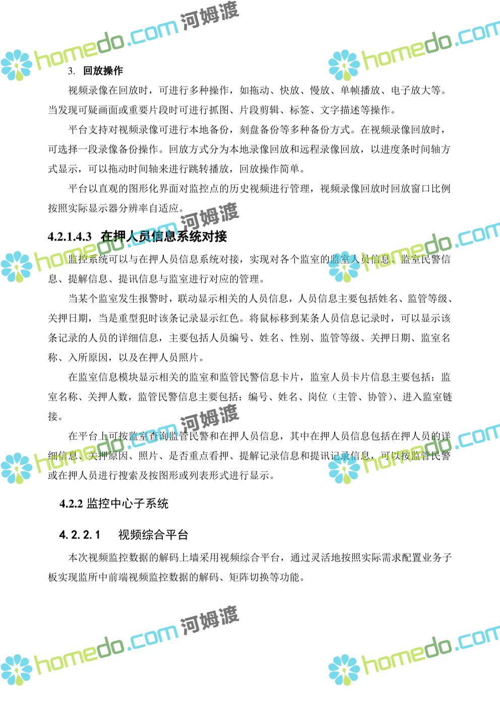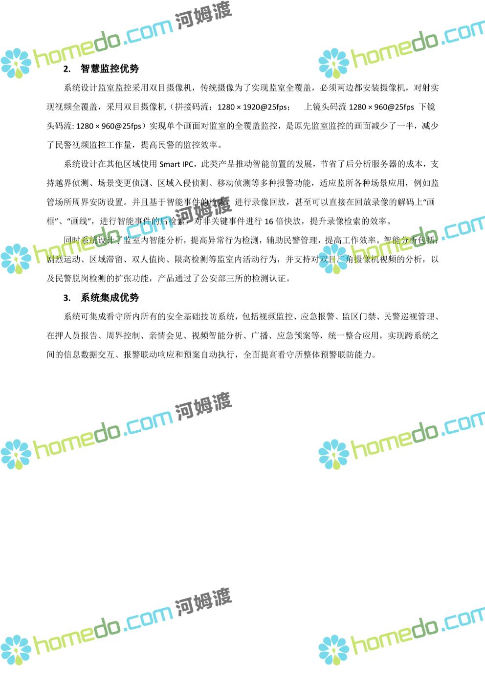 方案简介 根据实际工作需求,以及看守所技术建设规范,此项目建设 个子系统,分别为智能监室系统、应急警报系统、周界控制系统、违禁物品检测系统、监区门禁系统、监控系统、在押人员报告系统、会见管理系统、电化教育(广播)系统、民警巡视管理系统、讯问指挥系统、智能巡视系统、在押人员消费系统、公共区域监控系统、监控中心等系统。