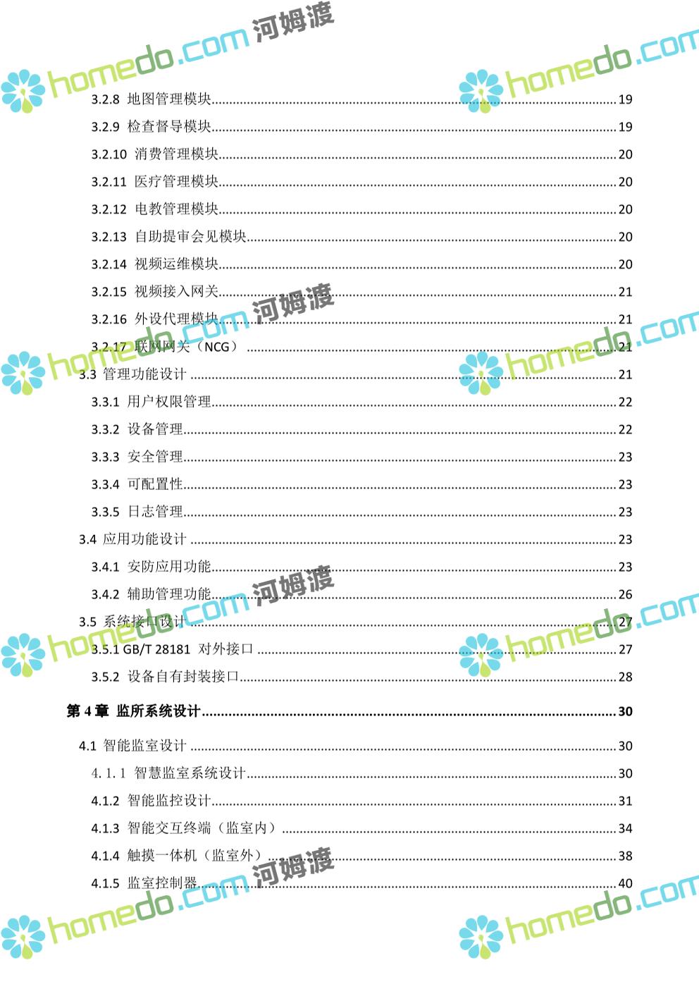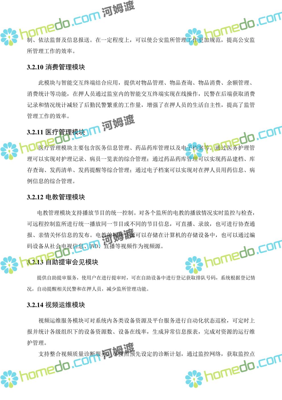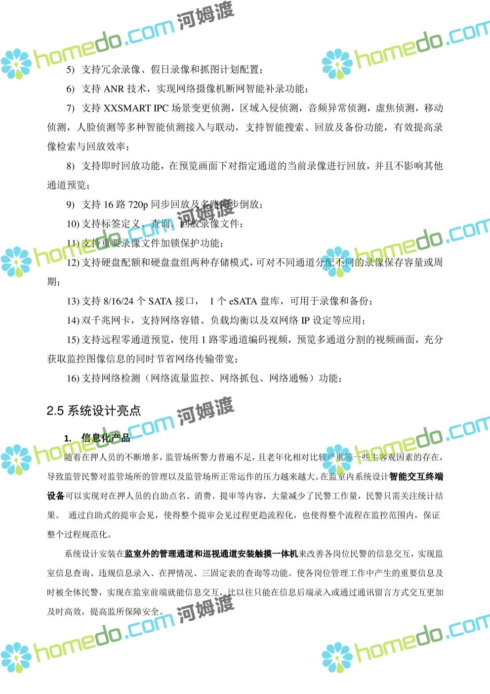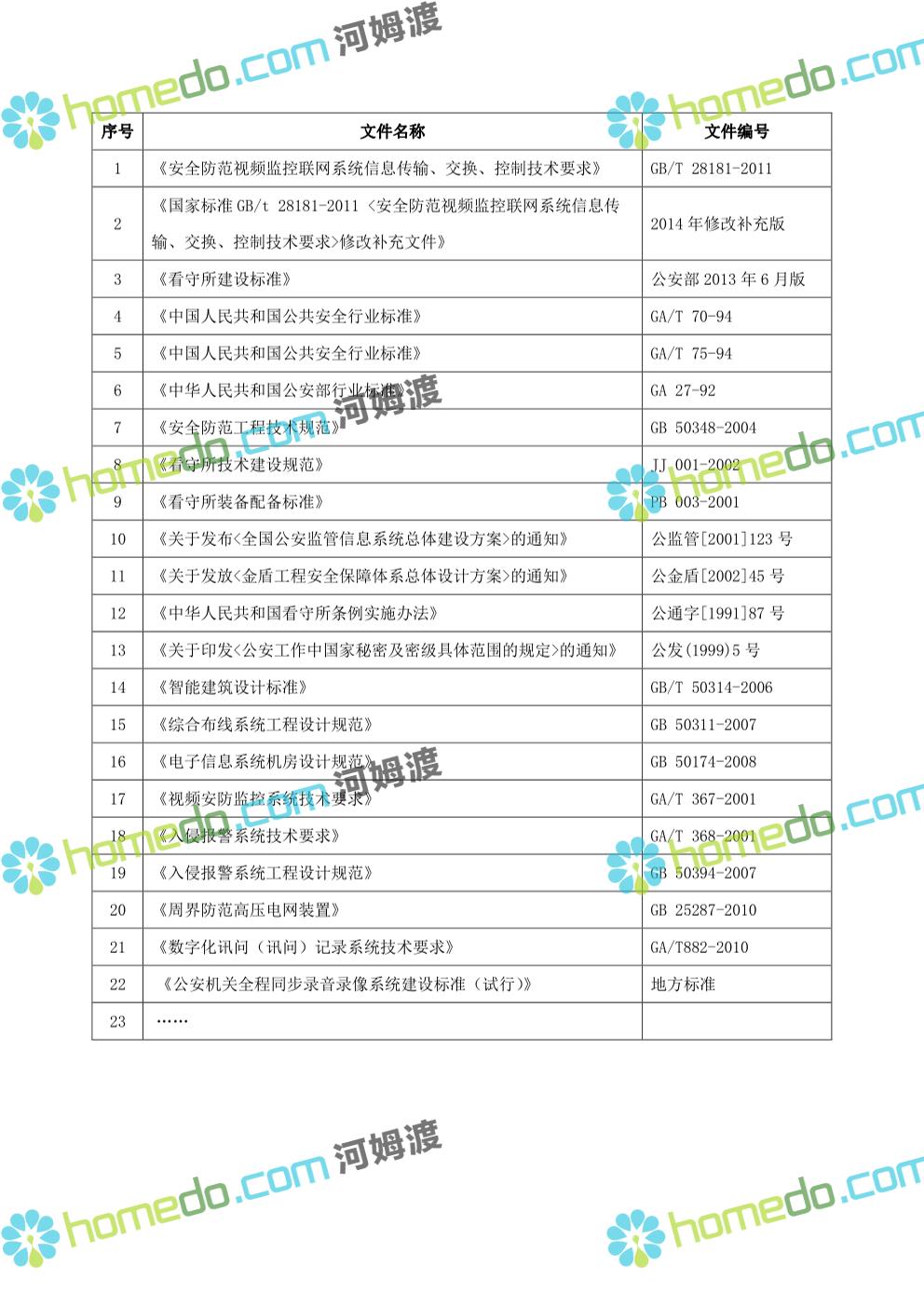 方案简介 根据实际工作需求,以及看守所技术建设规范,此项目建设 个子系统,分别为智能监室系统、应急警报系统、周界控制系统、违禁物品检测系统、监区门禁系统、监控系统、在押人员报告系统、会见管理系统、电化教育(广播)系统、民警巡视管理系统、讯问指挥系统、智能巡视系统、在押人员消费系统、公共区域监控系统、监控中心等系统。