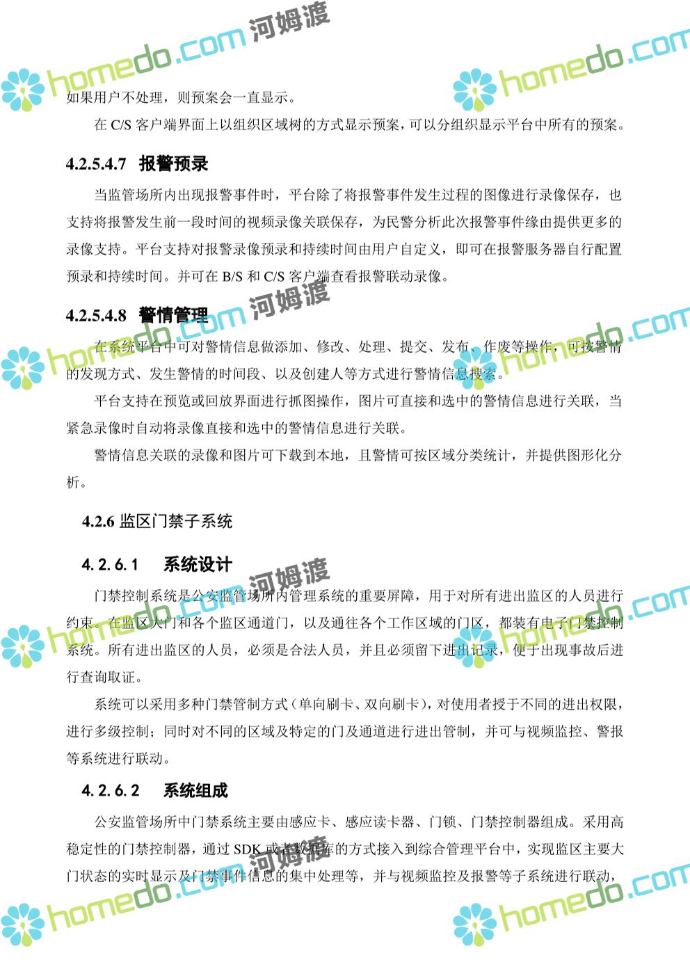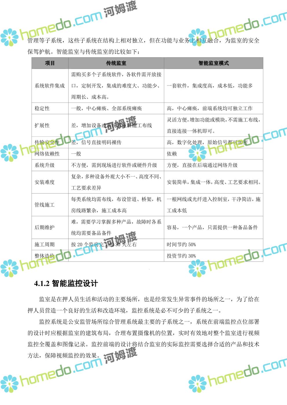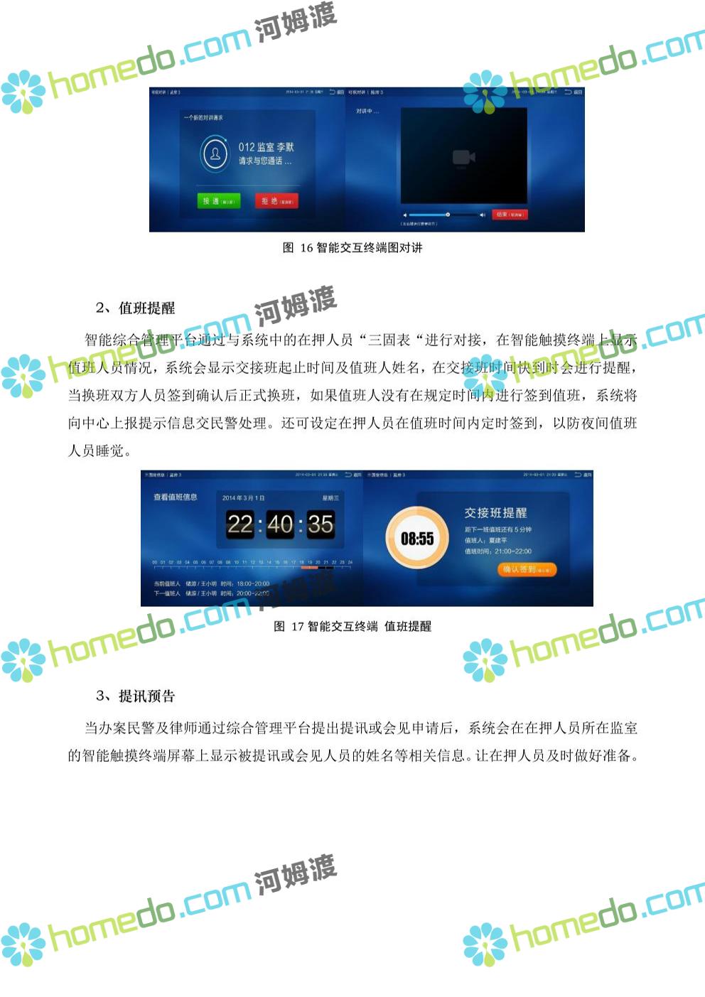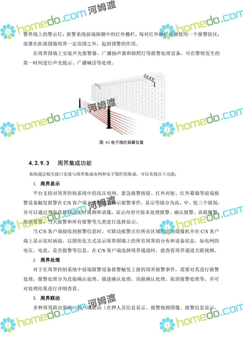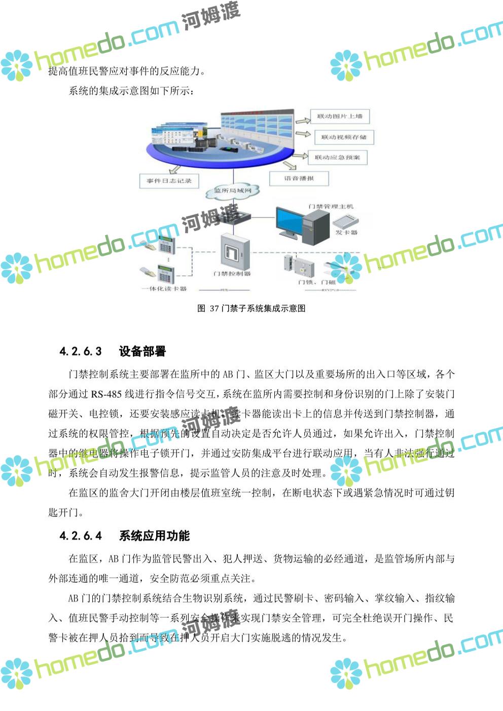 方案简介 根据实际工作需求,以及看守所技术建设规范,此项目建设 个子系统,分别为智能监室系统、应急警报系统、周界控制系统、违禁物品检测系统、监区门禁系统、监控系统、在押人员报告系统、会见管理系统、电化教育(广播)系统、民警巡视管理系统、讯问指挥系统、智能巡视系统、在押人员消费系统、公共区域监控系统、监控中心等系统。