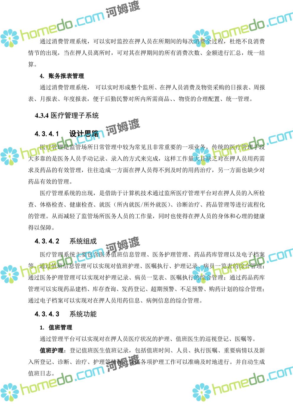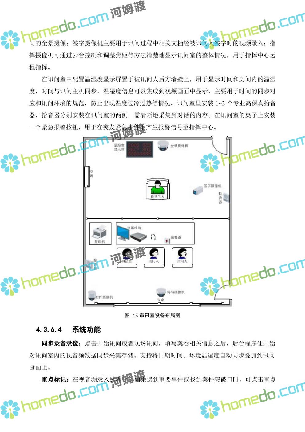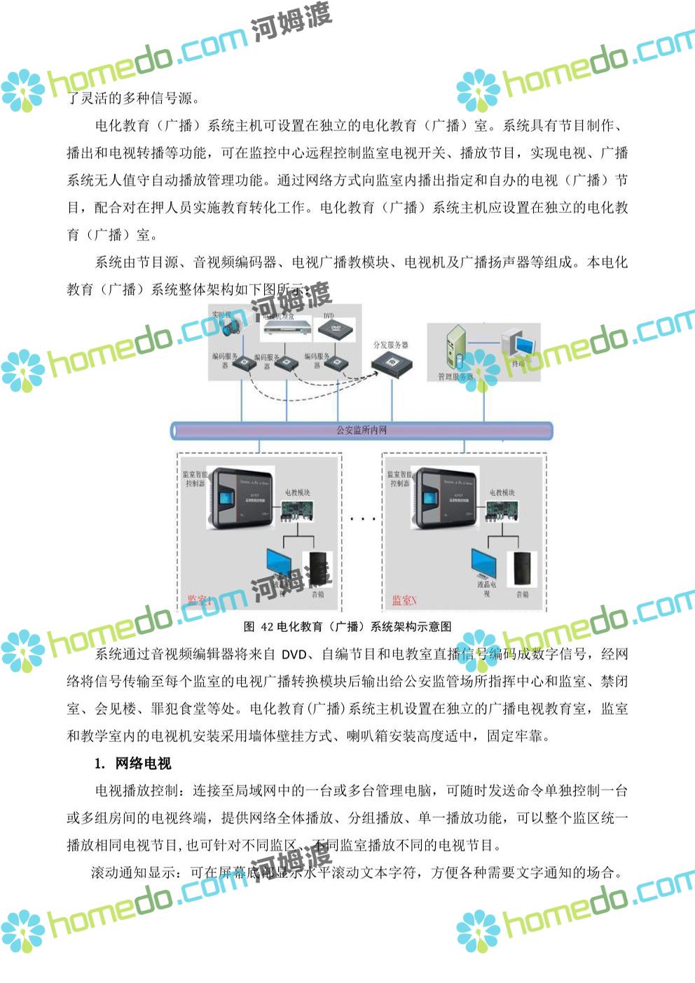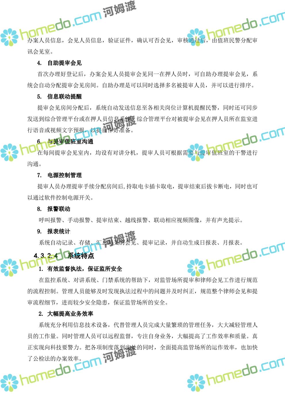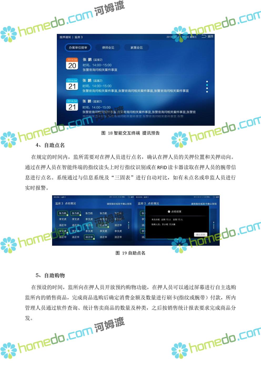 方案简介 根据实际工作需求,以及看守所技术建设规范,此项目建设 个子系统,分别为智能监室系统、应急警报系统、周界控制系统、违禁物品检测系统、监区门禁系统、监控系统、在押人员报告系统、会见管理系统、电化教育(广播)系统、民警巡视管理系统、讯问指挥系统、智能巡视系统、在押人员消费系统、公共区域监控系统、监控中心等系统。