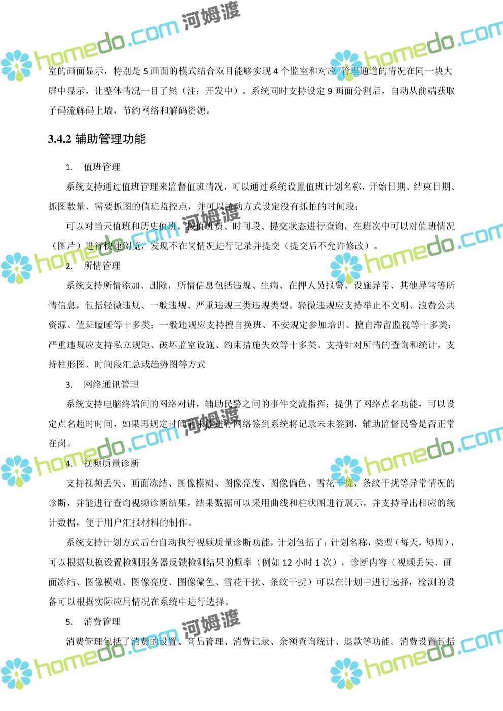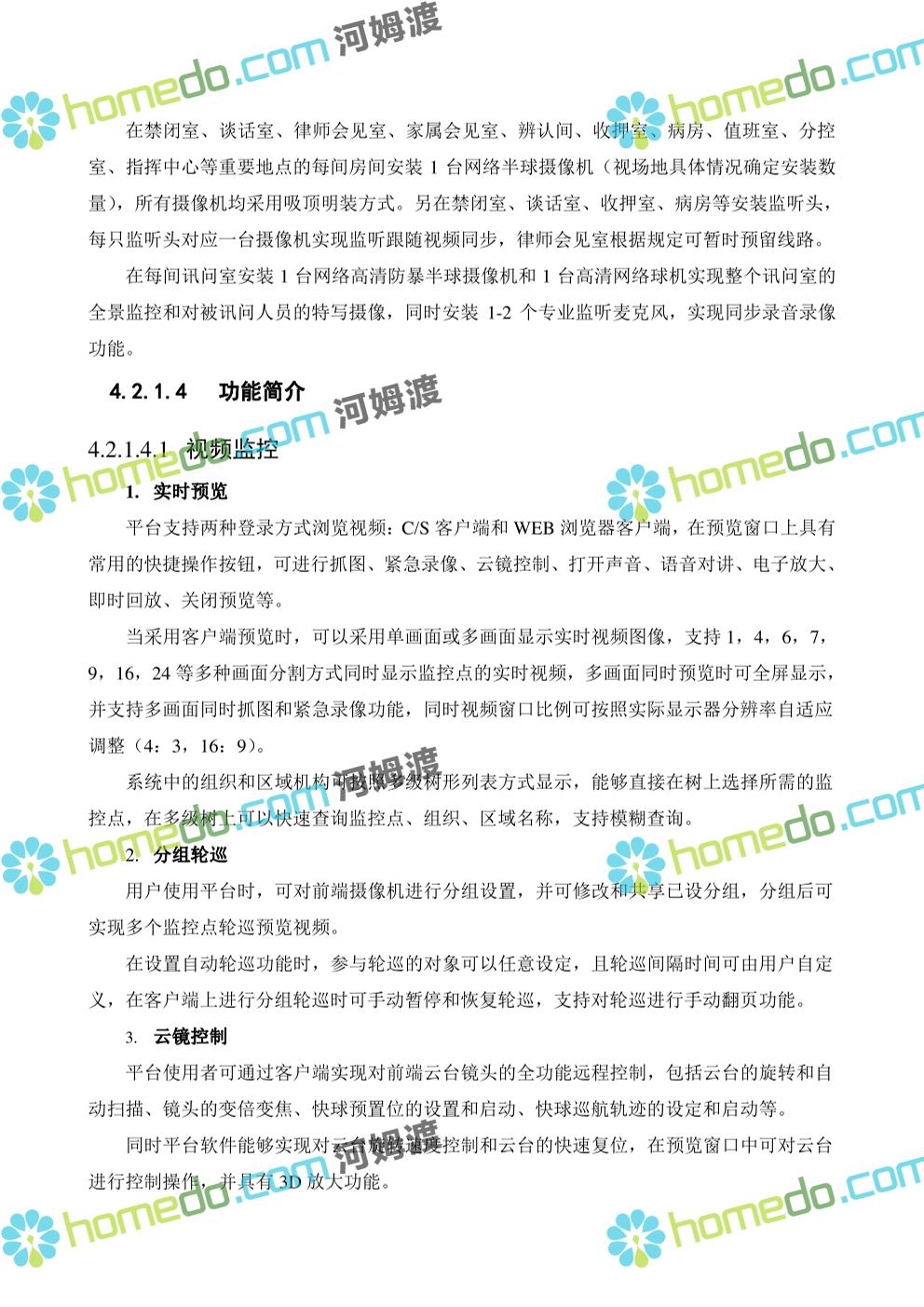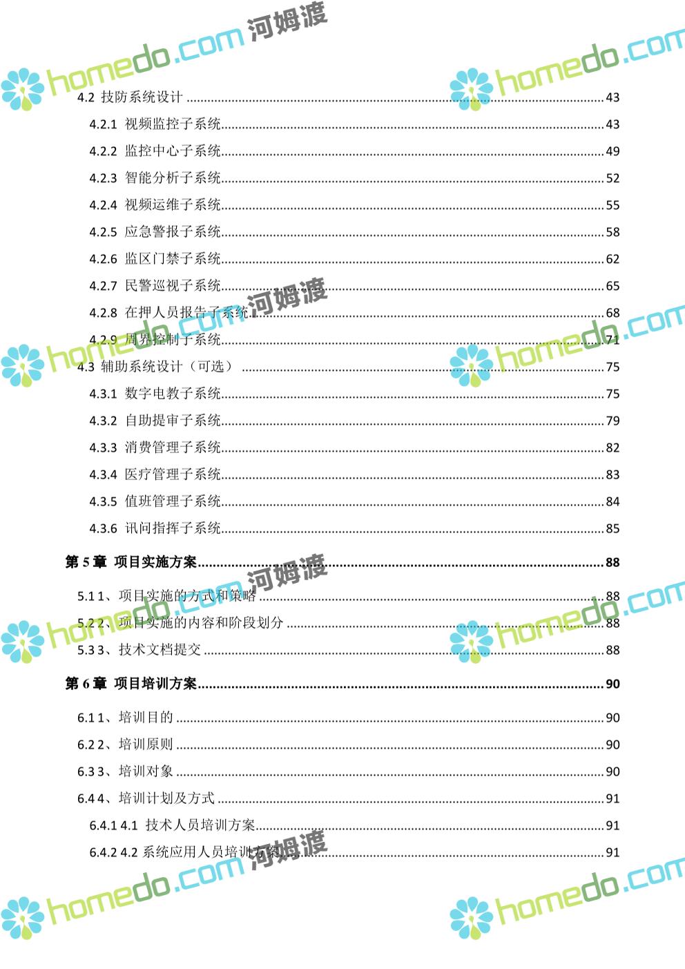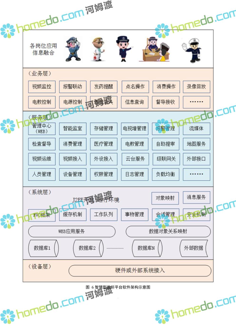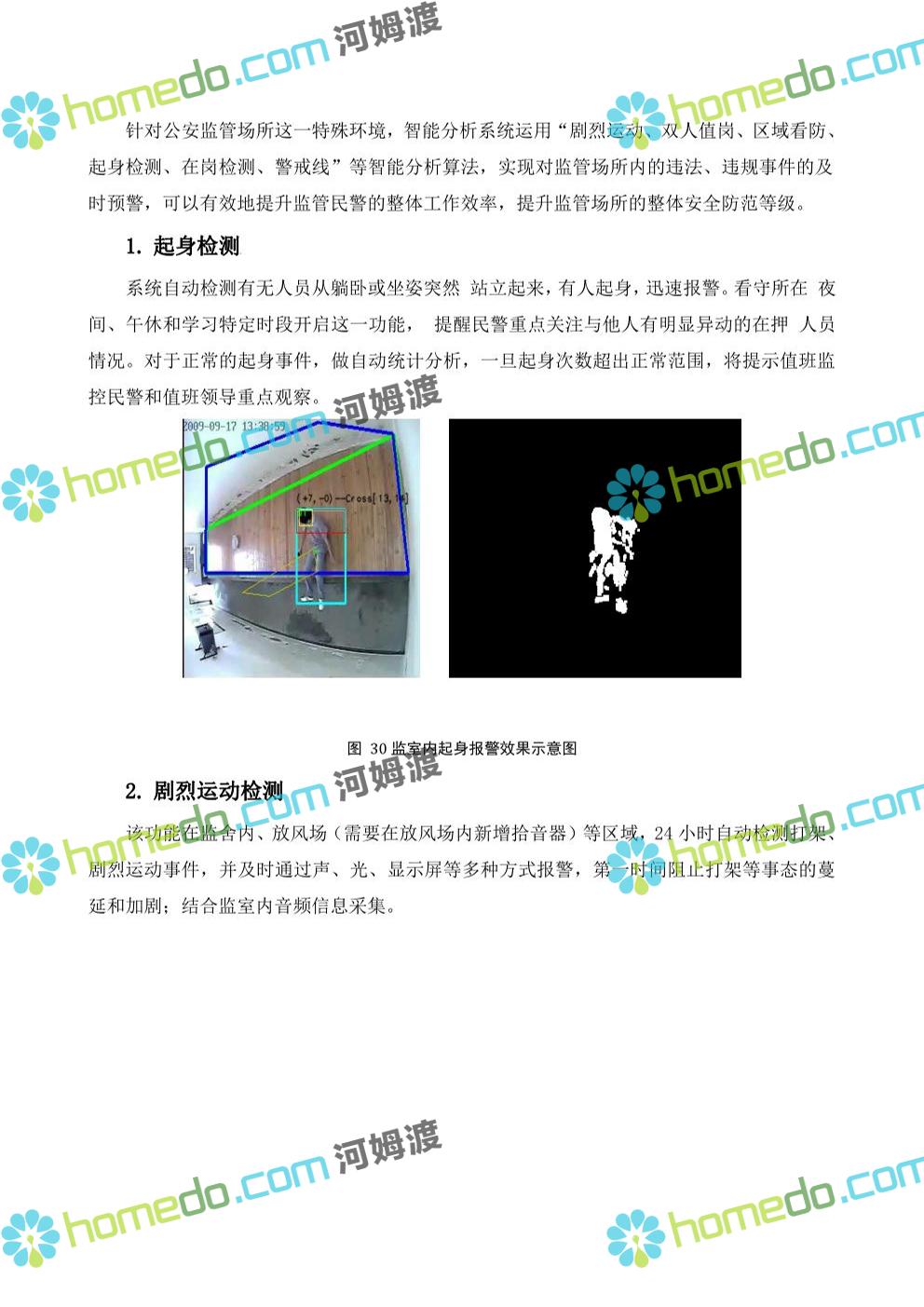 方案简介 根据实际工作需求,以及看守所技术建设规范,此项目建设 个子系统,分别为智能监室系统、应急警报系统、周界控制系统、违禁物品检测系统、监区门禁系统、监控系统、在押人员报告系统、会见管理系统、电化教育(广播)系统、民警巡视管理系统、讯问指挥系统、智能巡视系统、在押人员消费系统、公共区域监控系统、监控中心等系统。