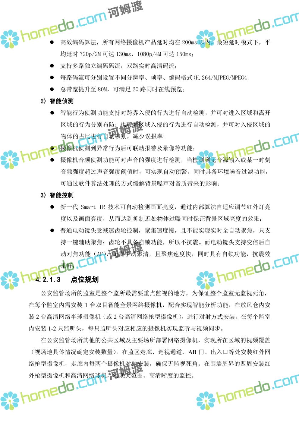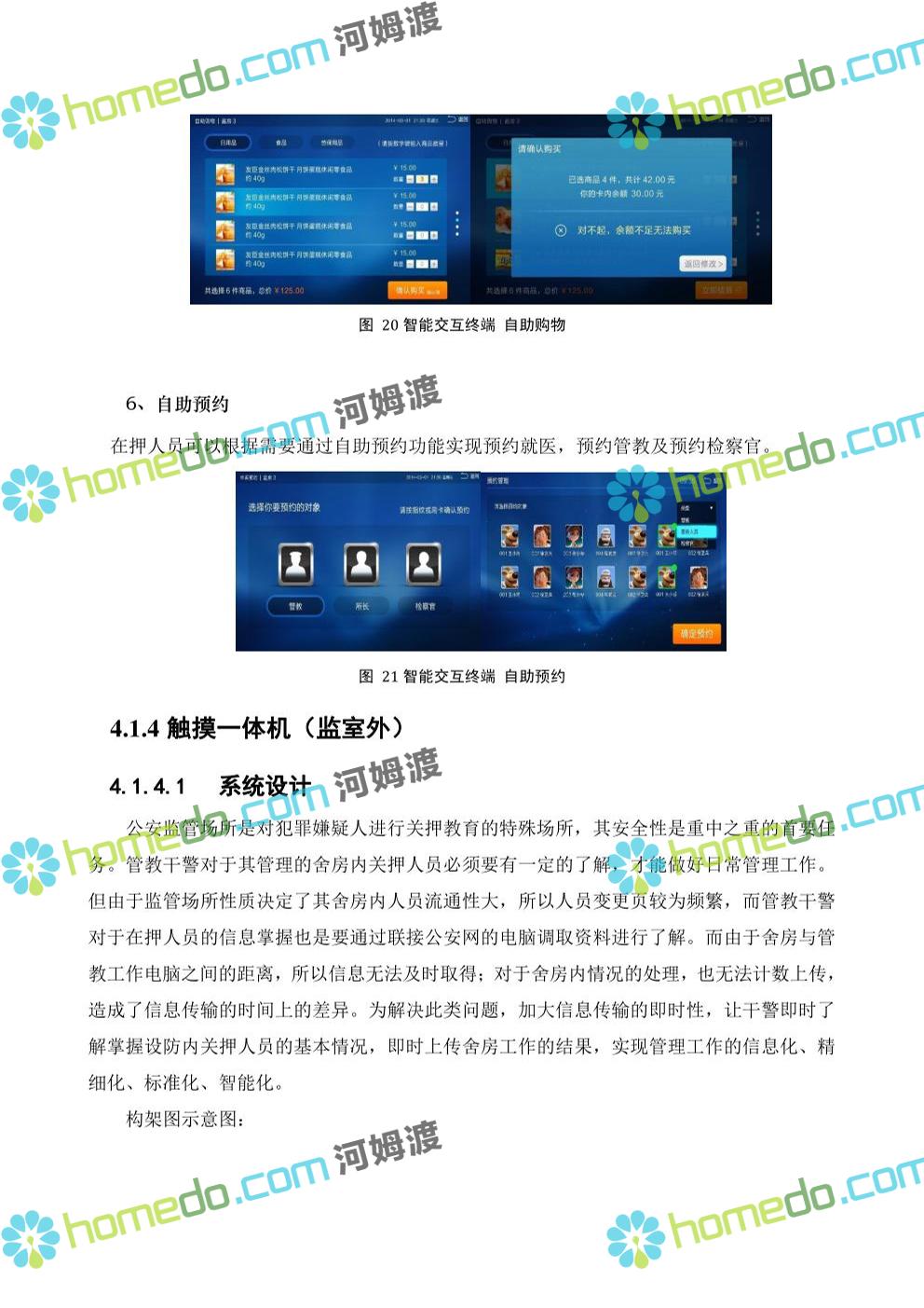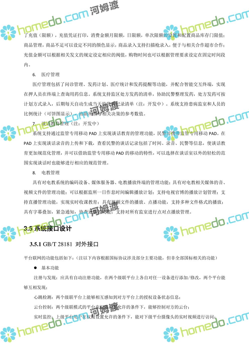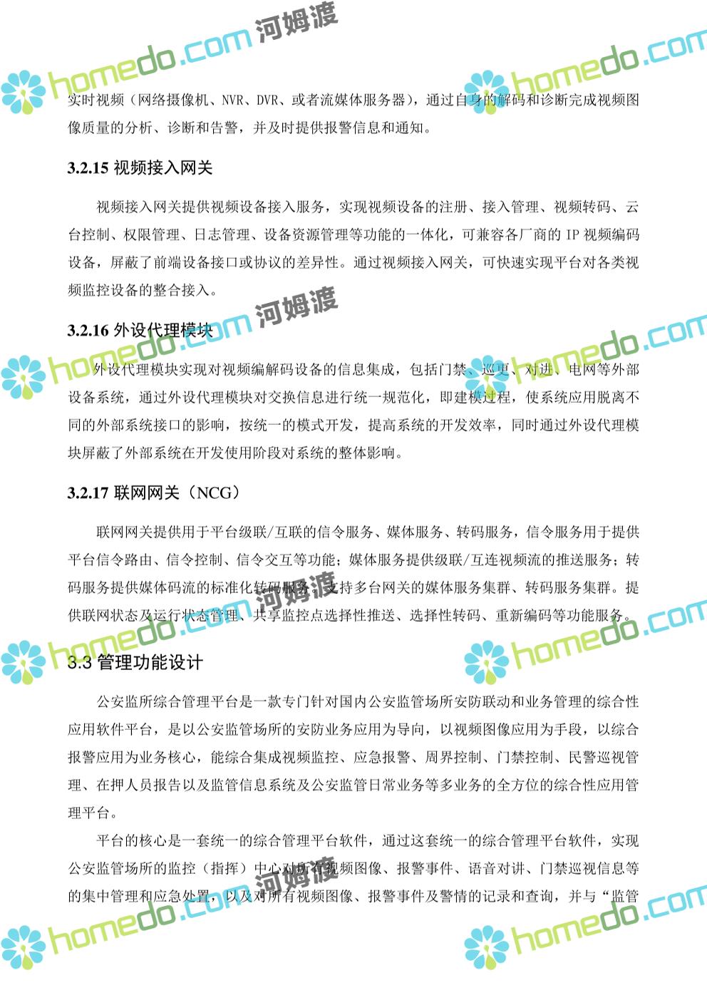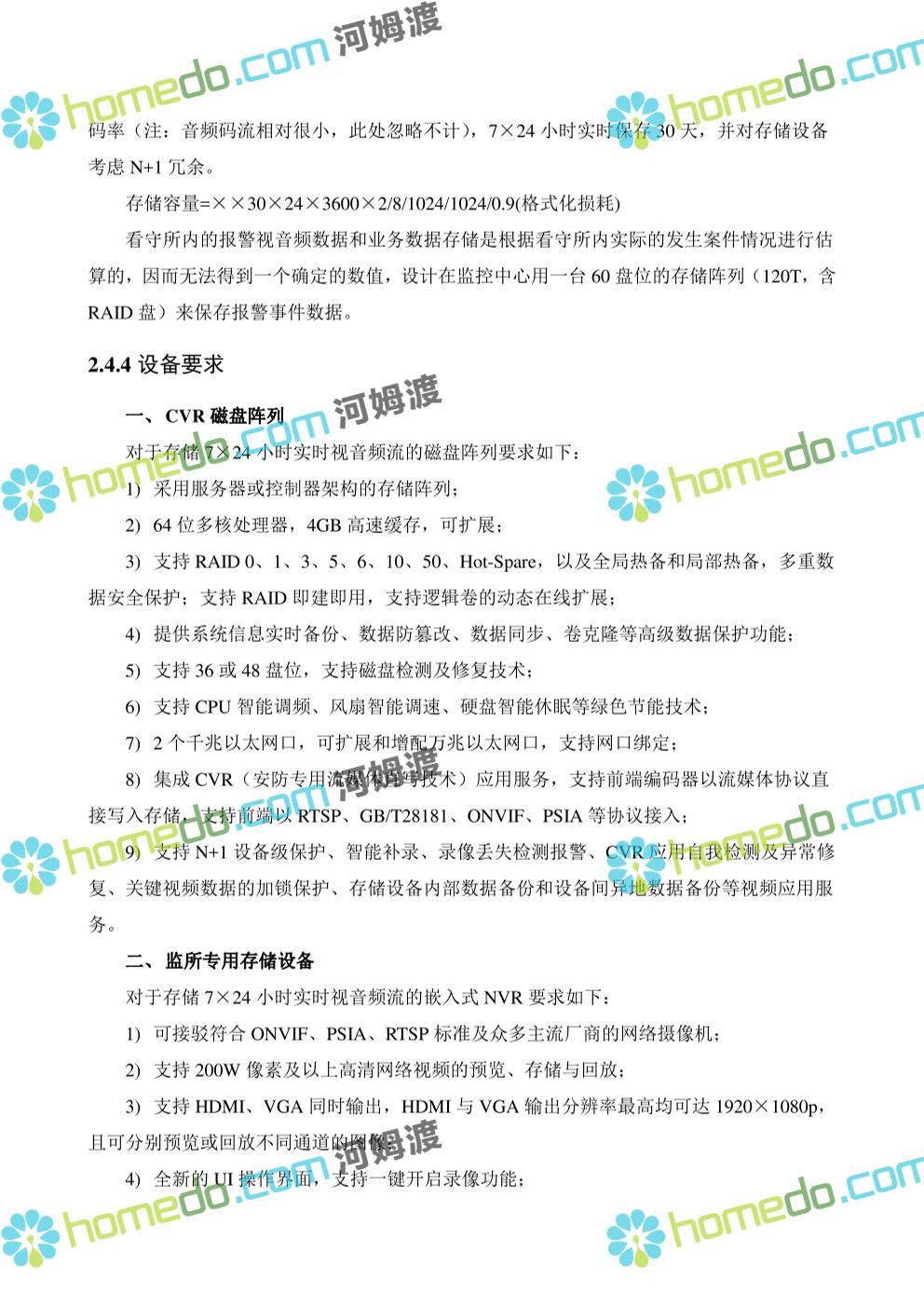 方案简介 根据实际工作需求,以及看守所技术建设规范,此项目建设 个子系统,分别为智能监室系统、应急警报系统、周界控制系统、违禁物品检测系统、监区门禁系统、监控系统、在押人员报告系统、会见管理系统、电化教育(广播)系统、民警巡视管理系统、讯问指挥系统、智能巡视系统、在押人员消费系统、公共区域监控系统、监控中心等系统。