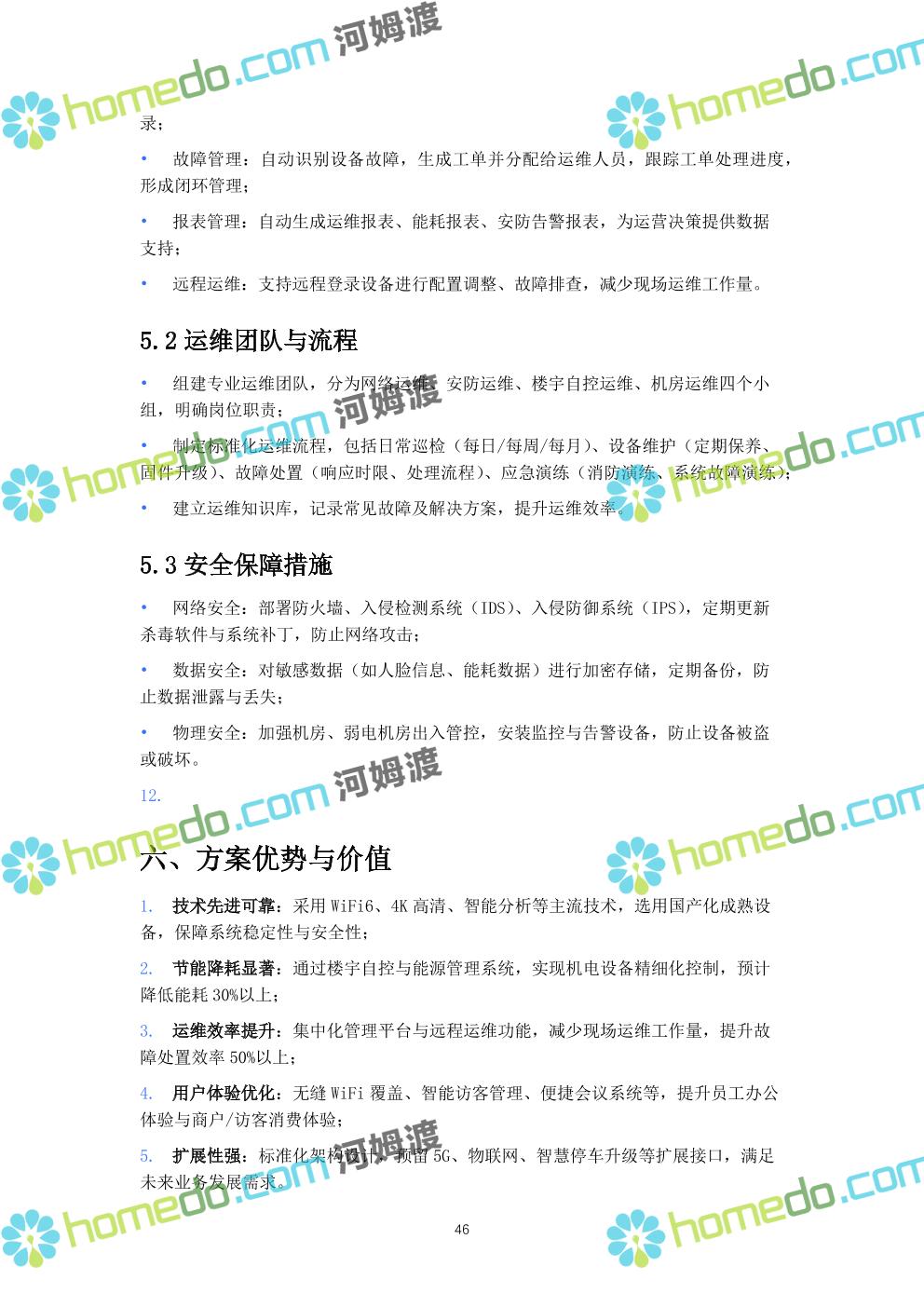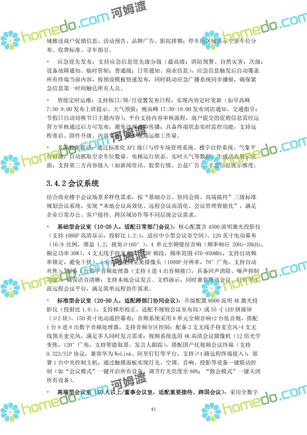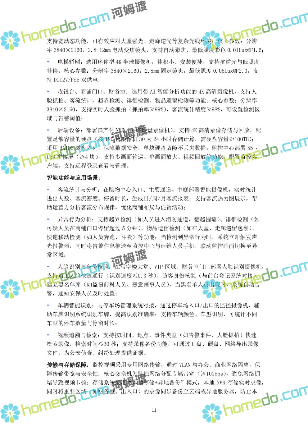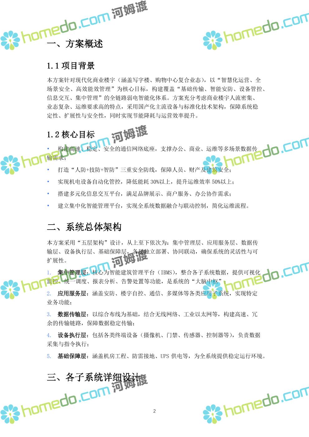方案简介 本方案针对现代化商业楼宇(涵盖写字楼、购物中心复合业态),以“智慧化运营、全场景安全、高效能效管理”为核心目标,构建覆盖“基础传输、智能安防、设备管控、信息交互、集中管理”的全链路弱电智能化体系。方案充分考虑商业楼宇人流密集、业态复杂、运维要求高的特点,采用国产化主流设备与标准化技术架构,保障系统稳定性、扩展性与安全性,同时实现节能降耗与运营效率提升。