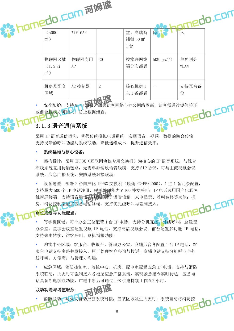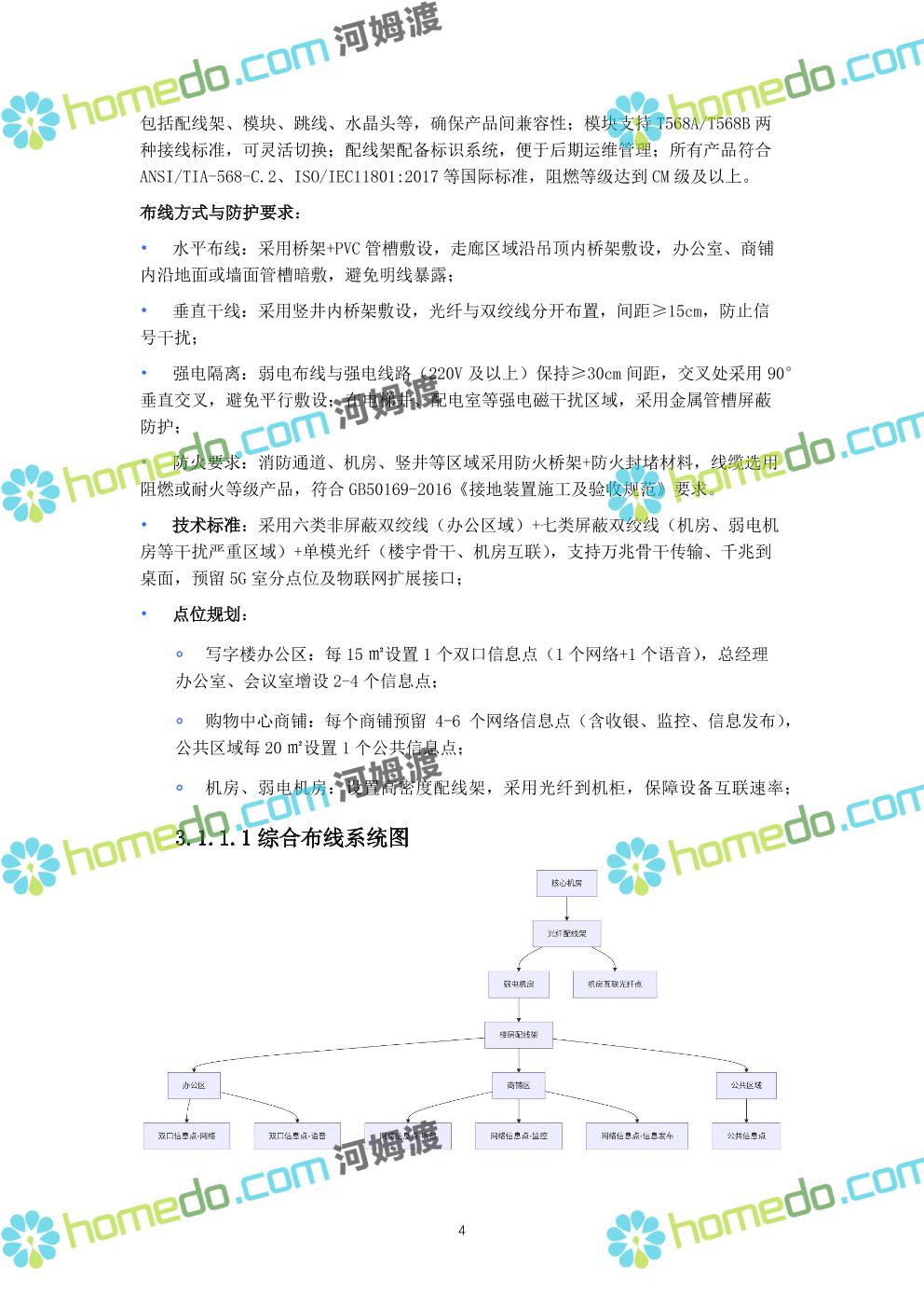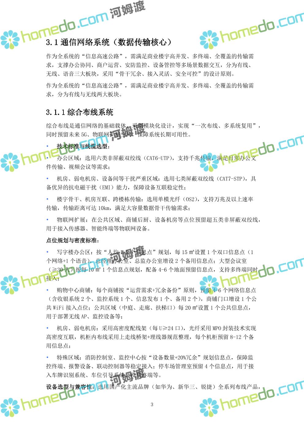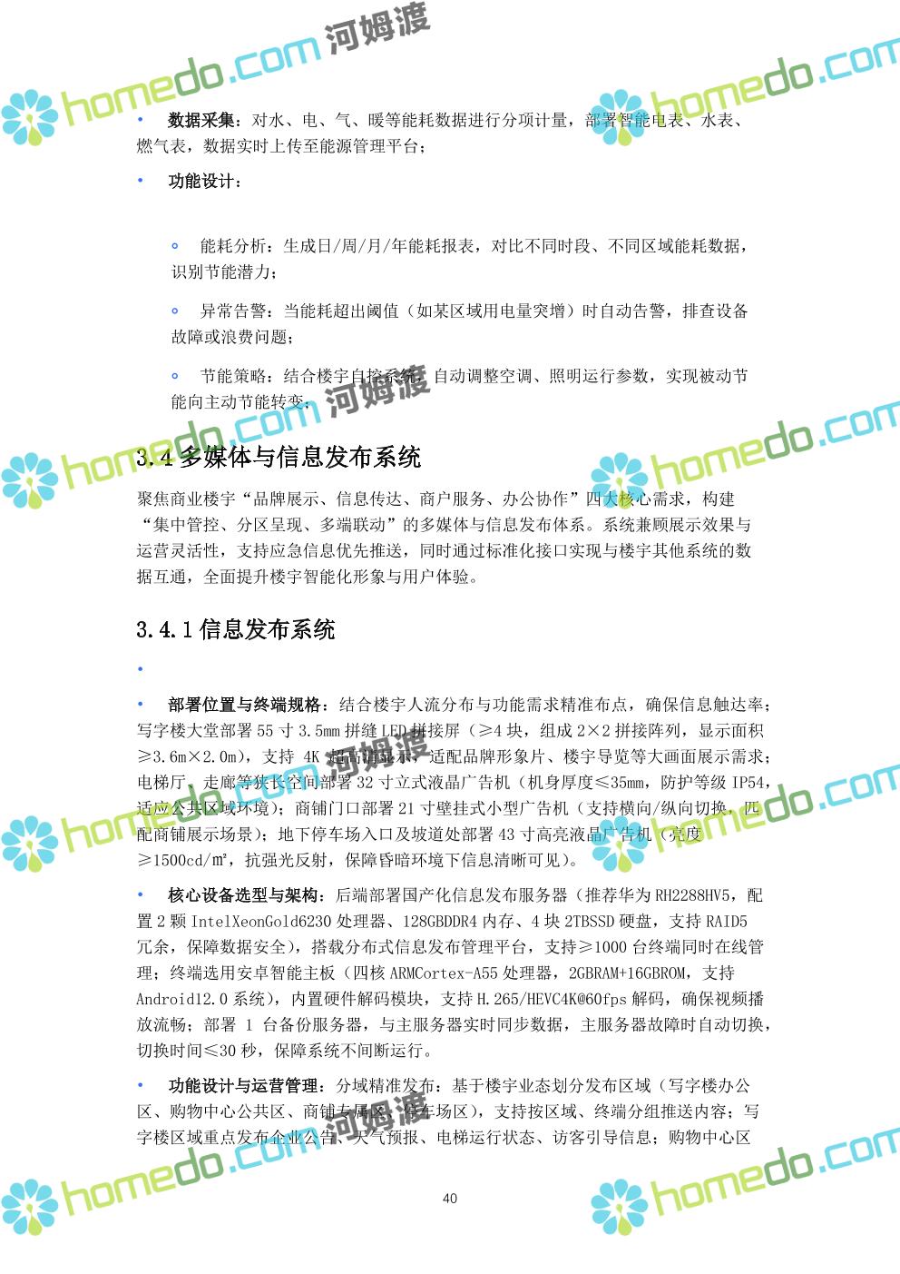 方案简介 本方案针对现代化商业楼宇(涵盖写字楼、购物中心复合业态),以“智慧化运营、全场景安全、高效能效管理”为核心目标,构建覆盖“基础传输、智能安防、设备管控、信息交互、集中管理”的全链路弱电智能化体系。方案充分考虑商业楼宇人流密集、业态复杂、运维要求高的特点,采用国产化主流设备与标准化技术架构,保障系统稳定性、扩展性与安全性,同时实现节能降耗与运营效率提升。