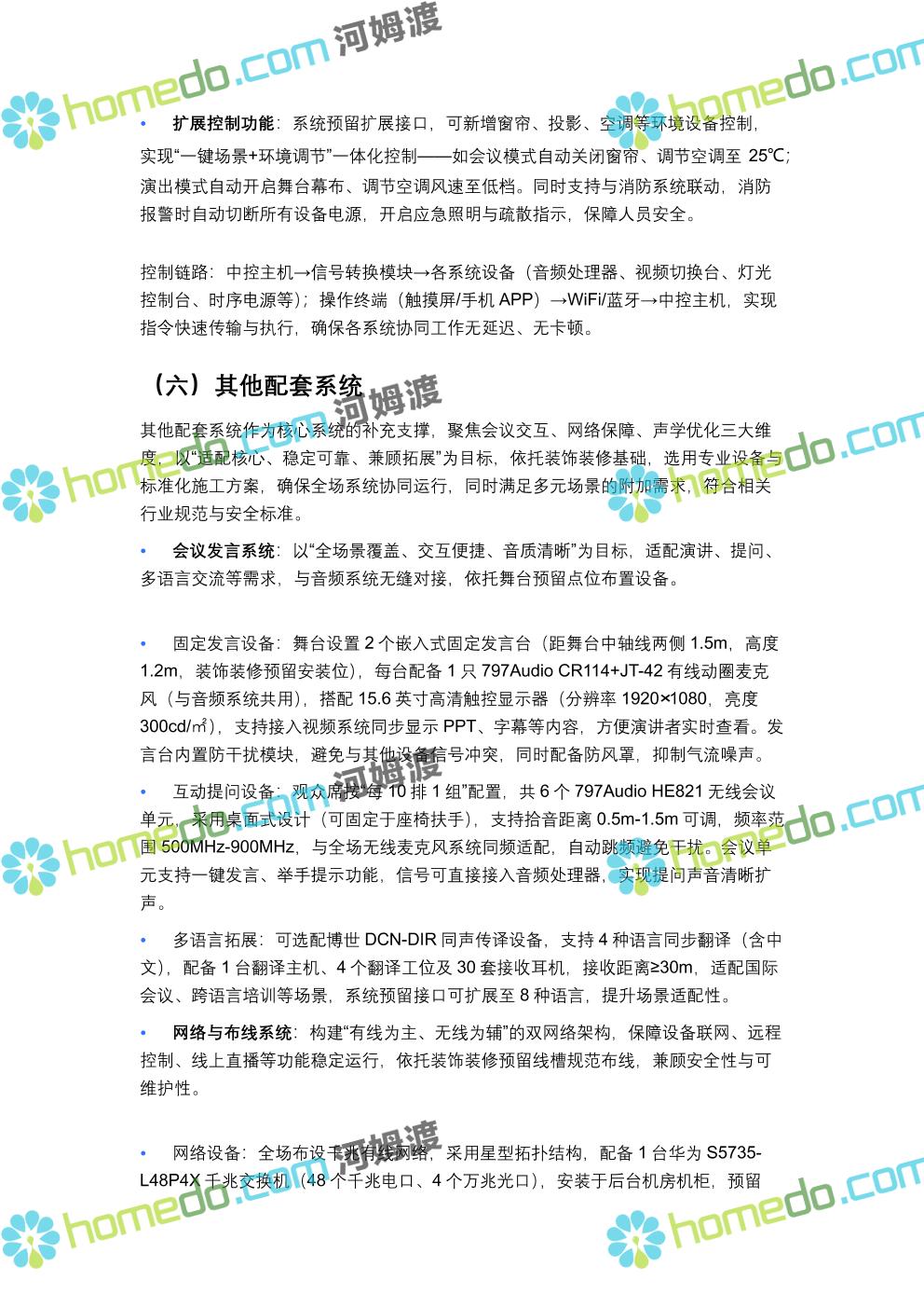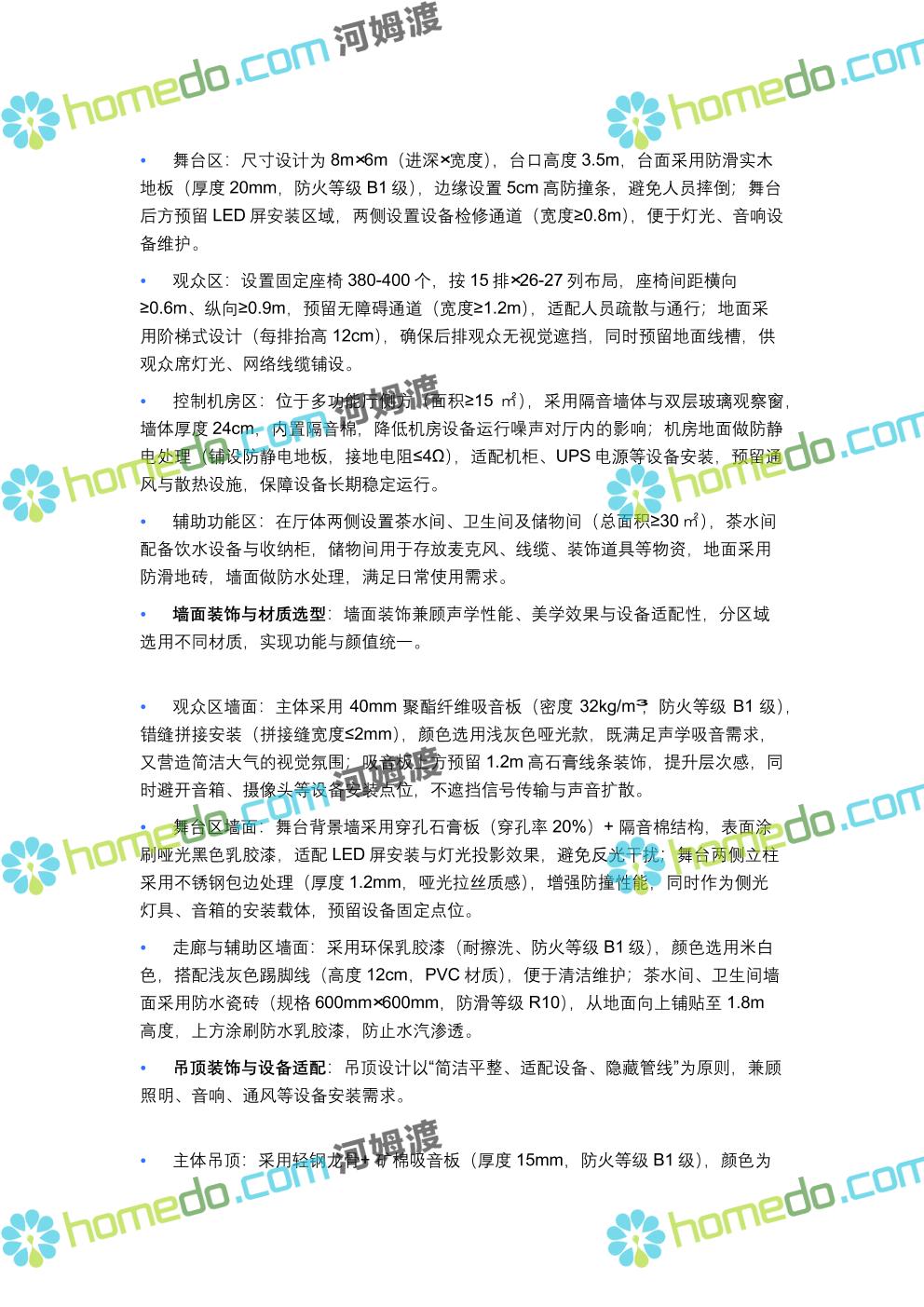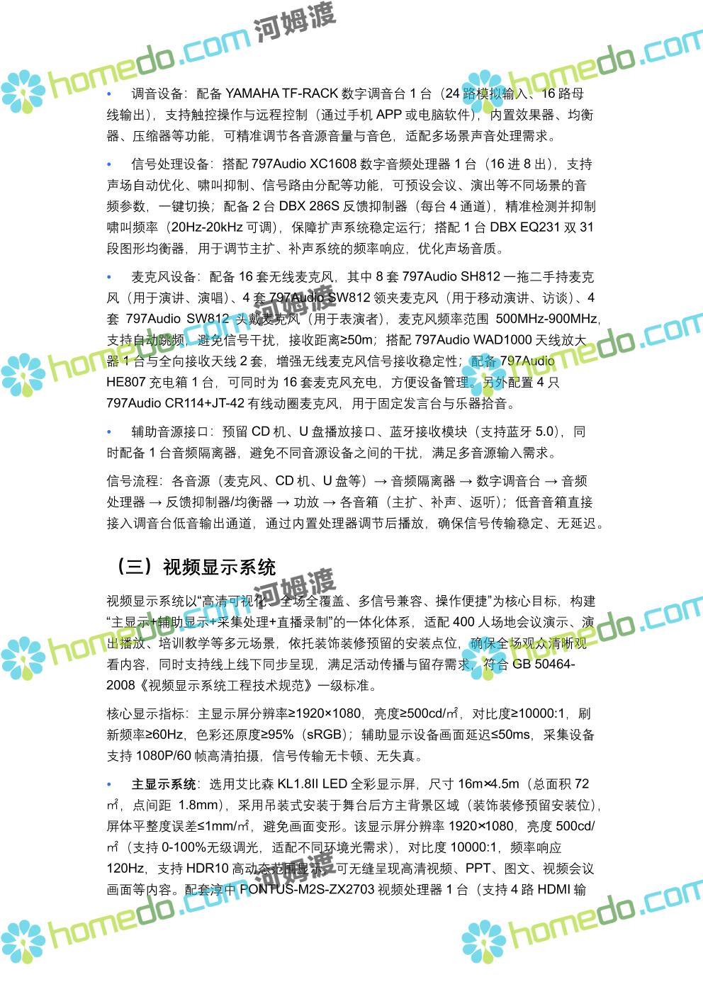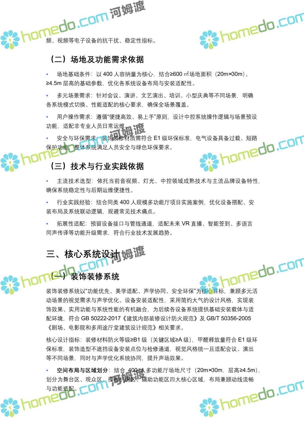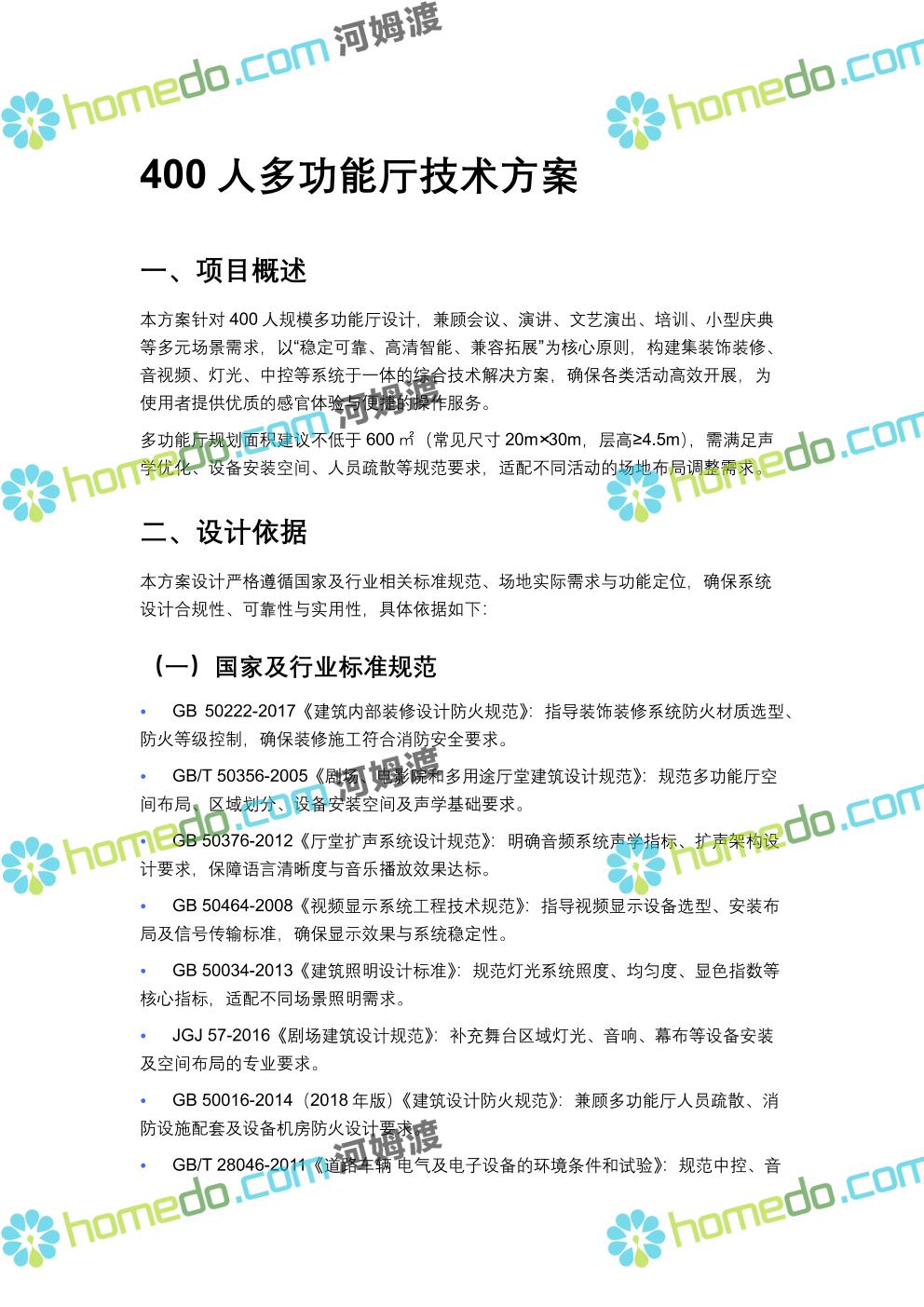 方案简介 方案针对400人规模多功能厅设计,兼顾会议、演讲、文艺演出、培训、小型庆典等多元场景需求,以“稳定可靠、高清智能、兼容拓展”为核心原则,构建集装饰装修、音视频、灯光、中控等系统于一体的综合技术解决方案,确保各类活动高效开展,为使用者提供优质的感官体验与便捷的操作服务。 多功能厅规划面积建议不低于600㎡(常见尺寸20m×30m,层高≥4.5m),需满足声学优化、设备安装空间、人员疏散等规范要求,适配不同活动的场地布局调整需求。