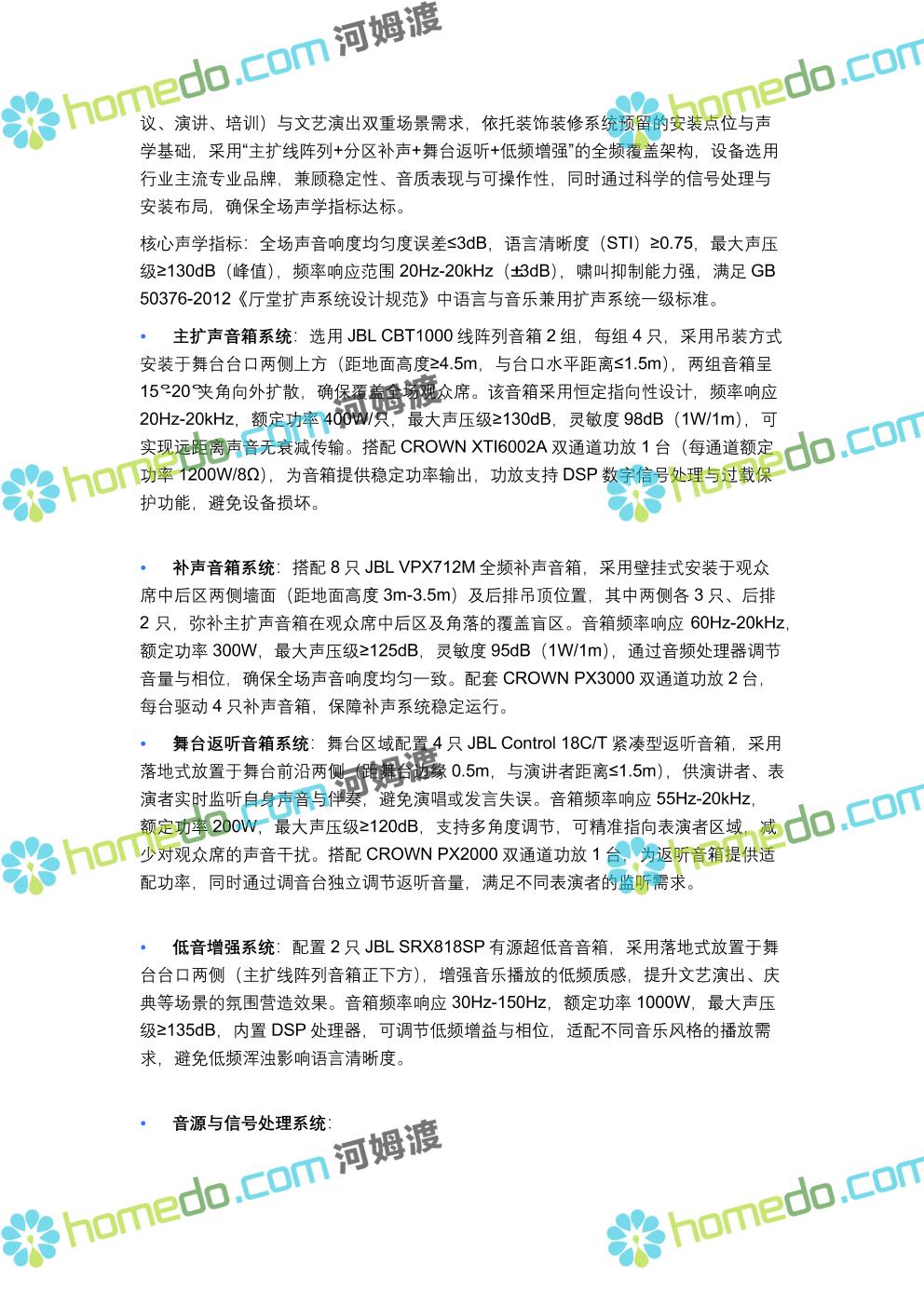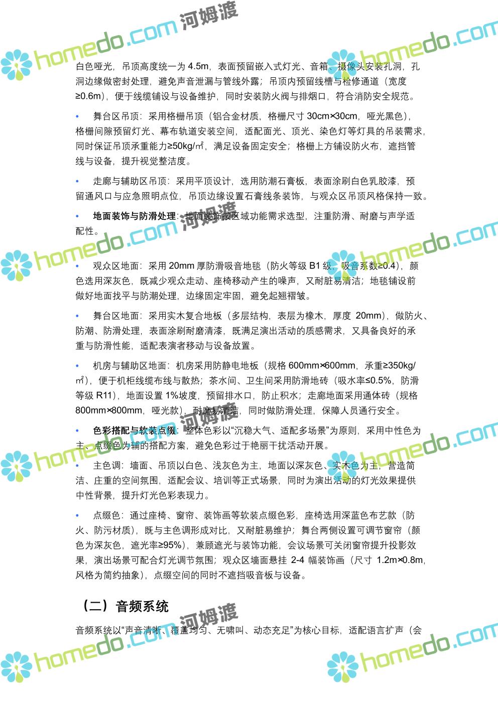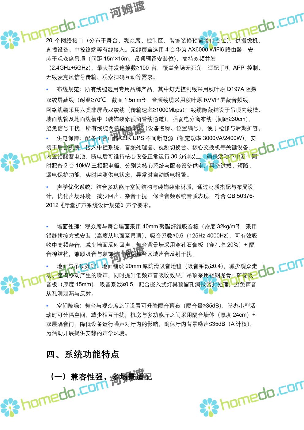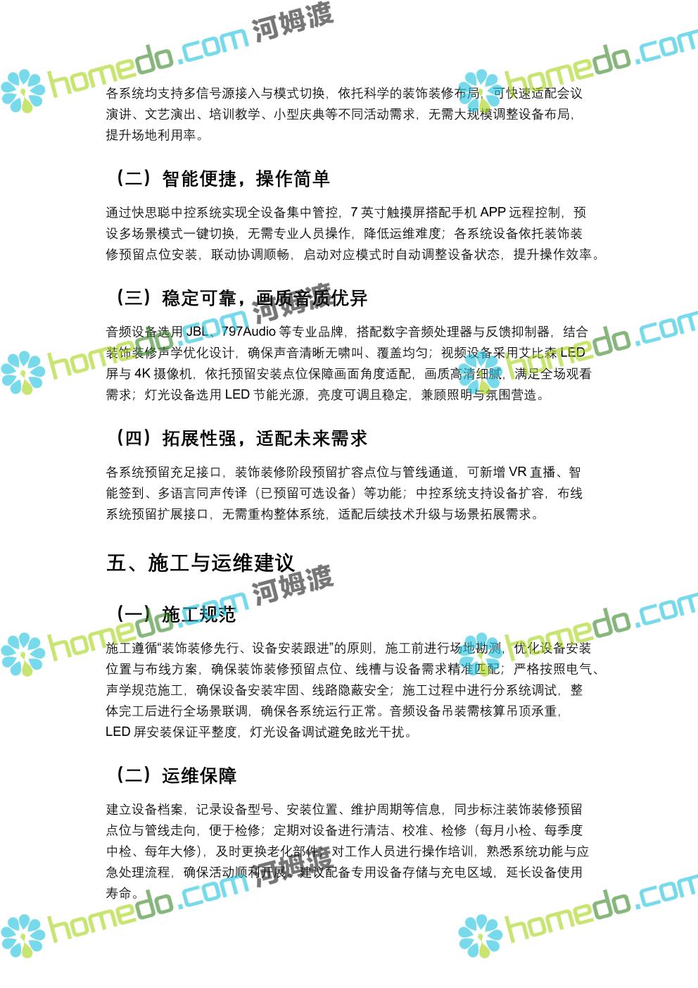 方案简介 方案针对400人规模多功能厅设计,兼顾会议、演讲、文艺演出、培训、小型庆典等多元场景需求,以“稳定可靠、高清智能、兼容拓展”为核心原则,构建集装饰装修、音视频、灯光、中控等系统于一体的综合技术解决方案,确保各类活动高效开展,为使用者提供优质的感官体验与便捷的操作服务。 多功能厅规划面积建议不低于600㎡(常见尺寸20m×30m,层高≥4.5m),需满足声学优化、设备安装空间、人员疏散等规范要求,适配不同活动的场地布局调整需求。
