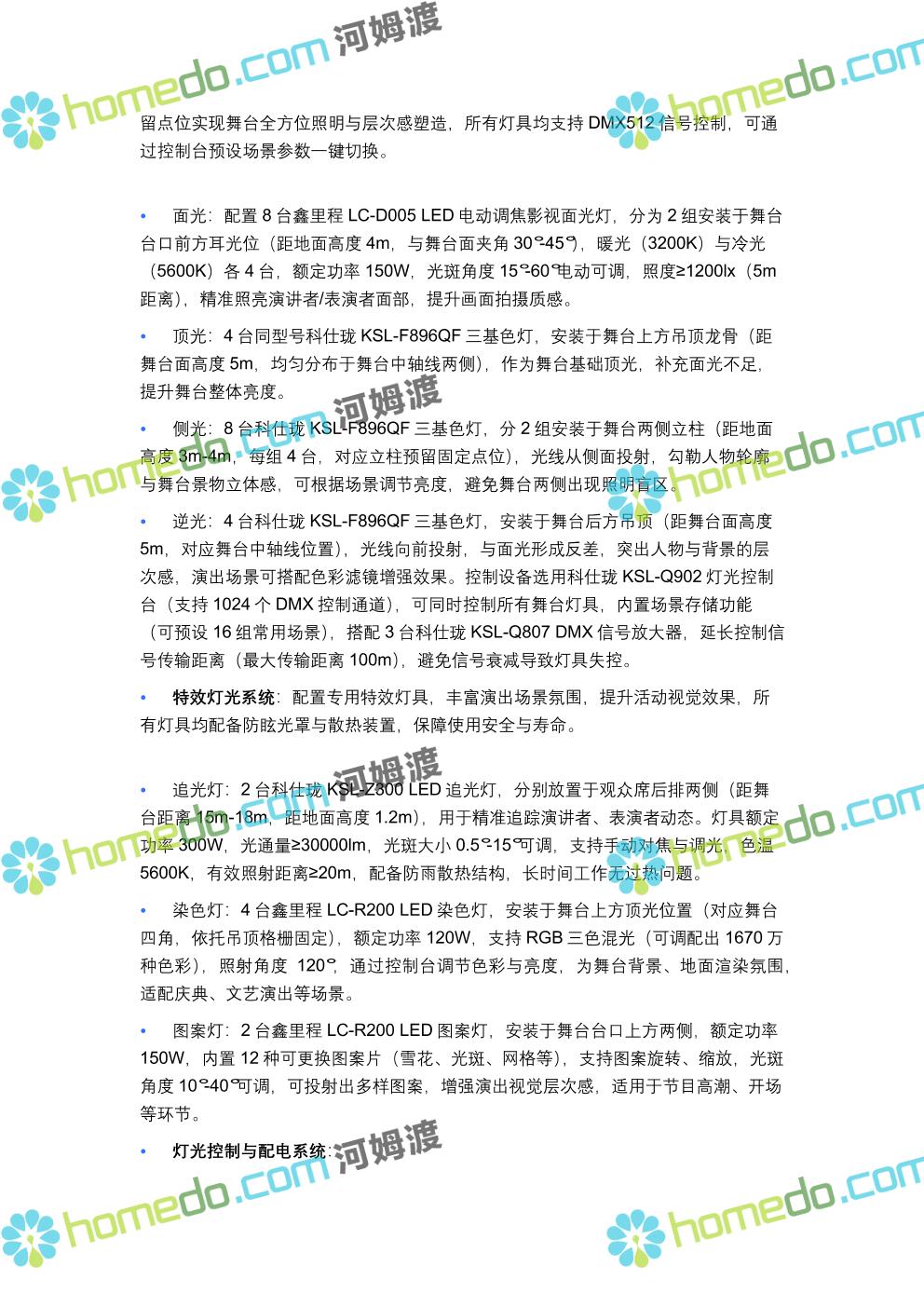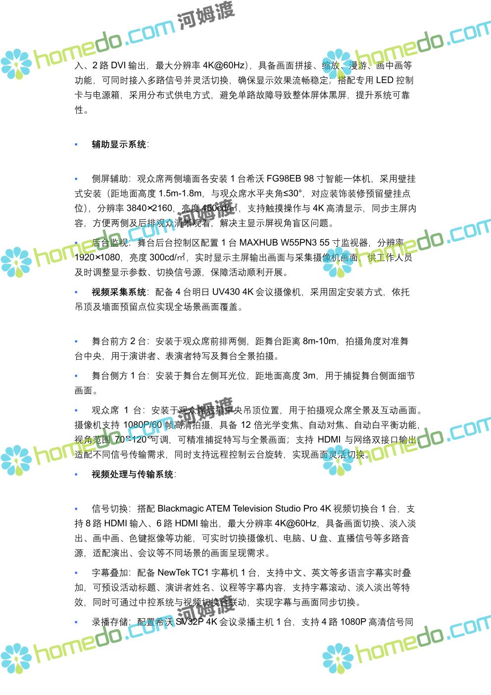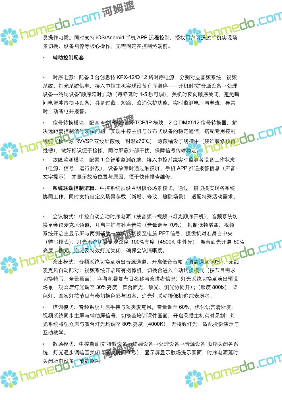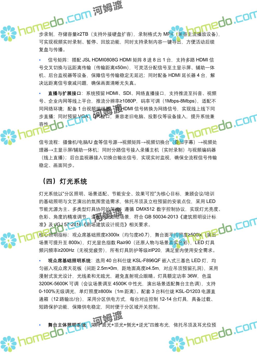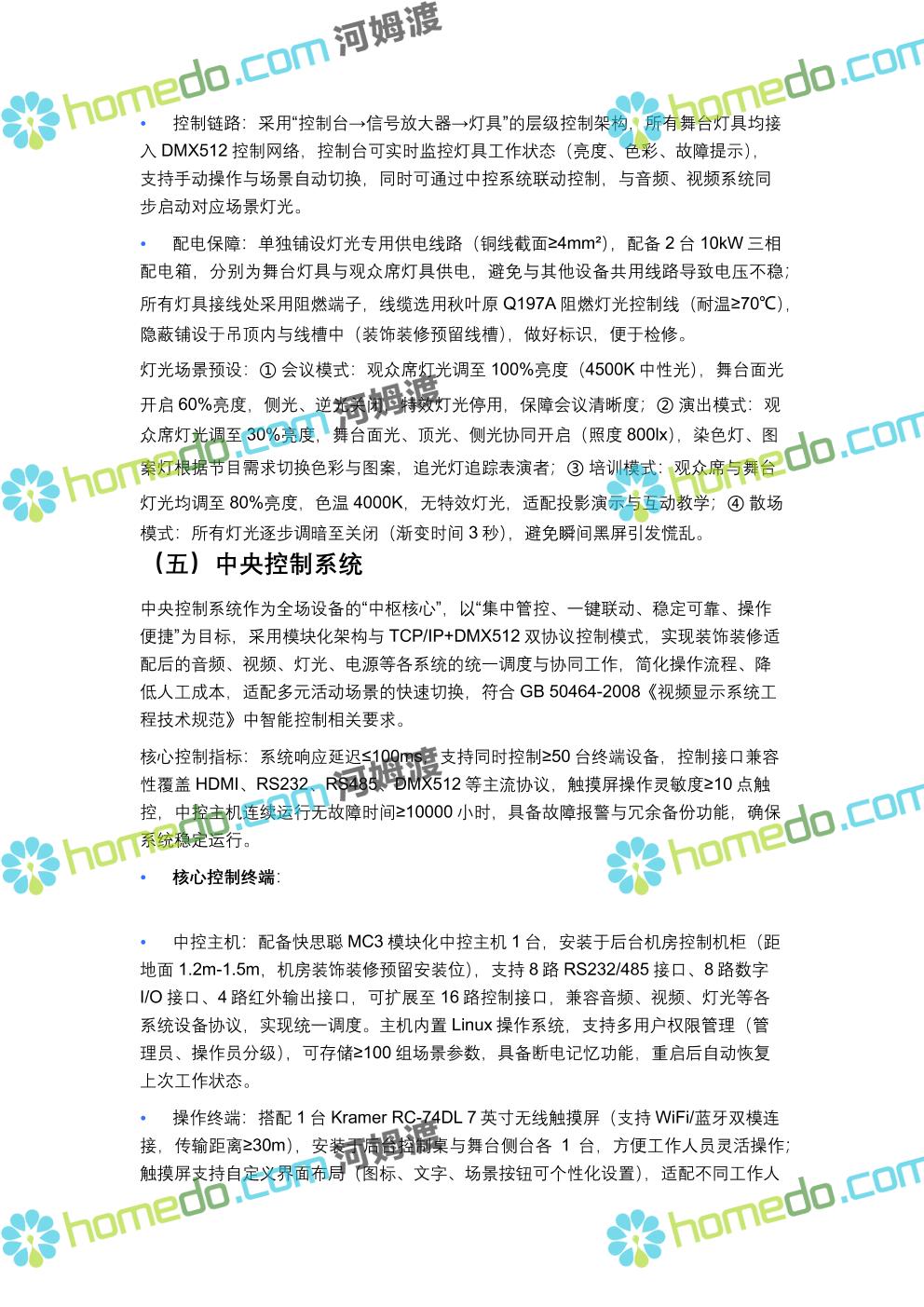 方案简介 方案针对400人规模多功能厅设计,兼顾会议、演讲、文艺演出、培训、小型庆典等多元场景需求,以“稳定可靠、高清智能、兼容拓展”为核心原则,构建集装饰装修、音视频、灯光、中控等系统于一体的综合技术解决方案,确保各类活动高效开展,为使用者提供优质的感官体验与便捷的操作服务。 多功能厅规划面积建议不低于600㎡(常见尺寸20m×30m,层高≥4.5m),需满足声学优化、设备安装空间、人员疏散等规范要求,适配不同活动的场地布局调整需求。