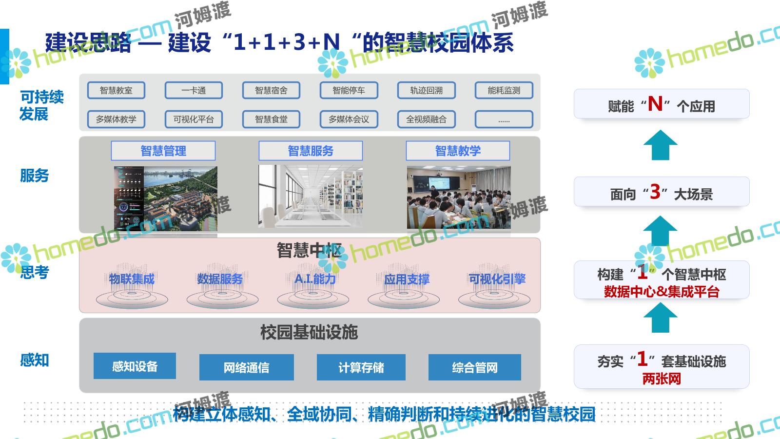 方案简介 建设“1+1+3+N“的智慧校园体系,构建立体感知、全域协同、精确判断和持续进化的智慧校园