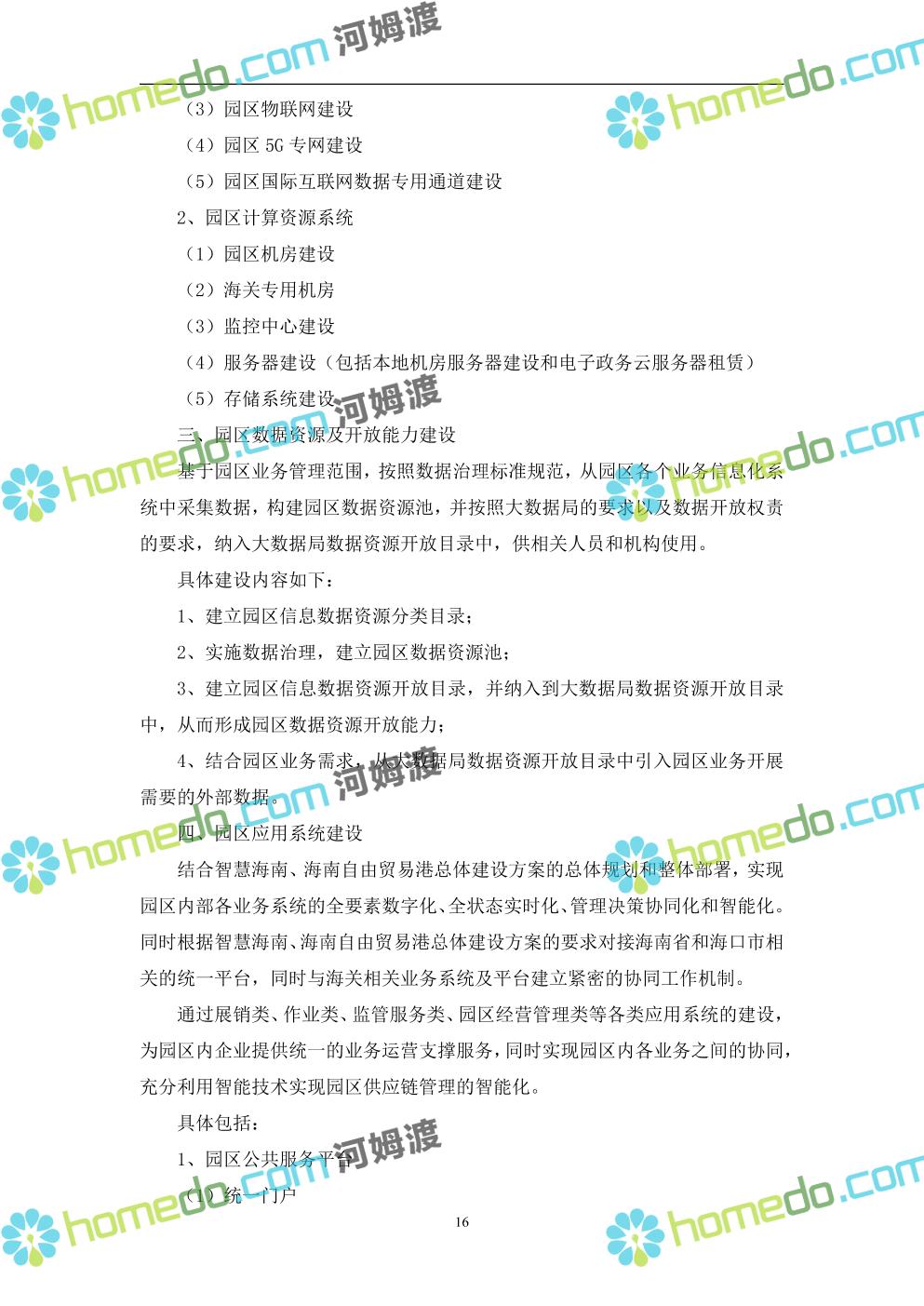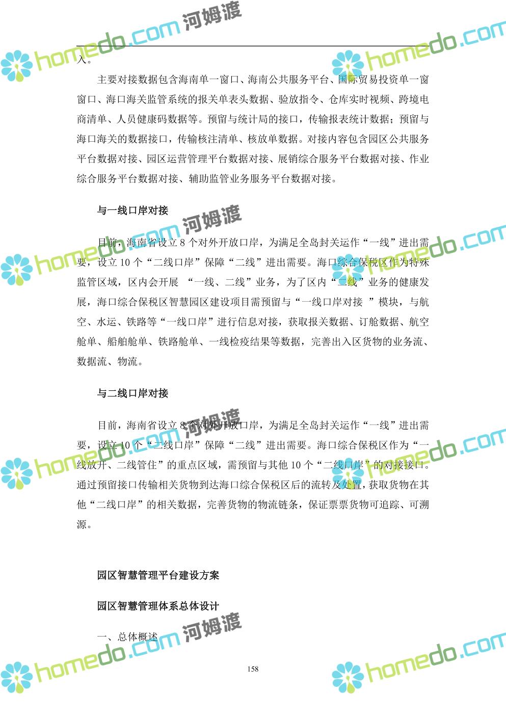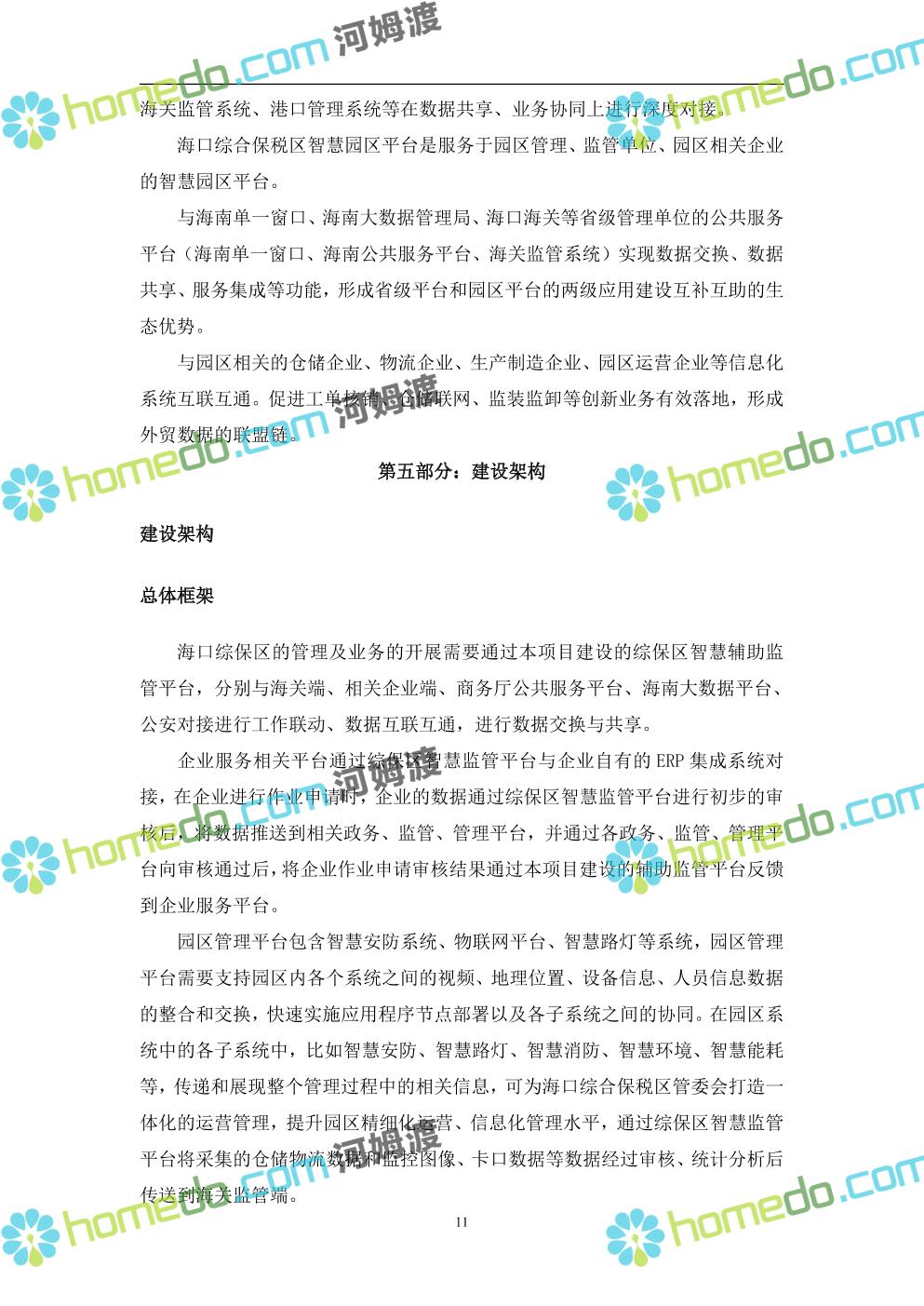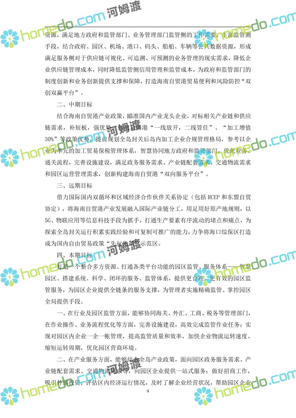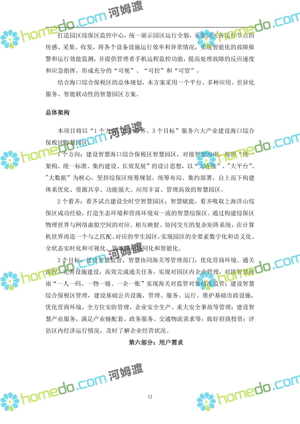 方案简介 本项目将以“1个方向、2个看齐、3个目标”服务六大产业建设海口综合保税区智慧园区: 1个方向:以“大连接”、”大平台”、”大数据”为核心,坚持综保区统筹规划、统筹布局、集约部署,自上而下构建体系优化、资源共享、功能强大、应用丰富、管理高效的智慧园区。 2个看齐:看齐试点建设全时空智慧园区;智慧赋能,看齐吸取上海洋山综保区成功经验,打造生态环境和营商环境双一流的智慧综保区。 3个目标:建设智慧监管,智慧协同海关等管理部门,优化营商环境、通关流程,完善设施建设,高效完成通关任务,实现对园区内企业管理,对接智慧海南“一人一码、一物一链、一企一账”实现海关对监管对象精准监管。