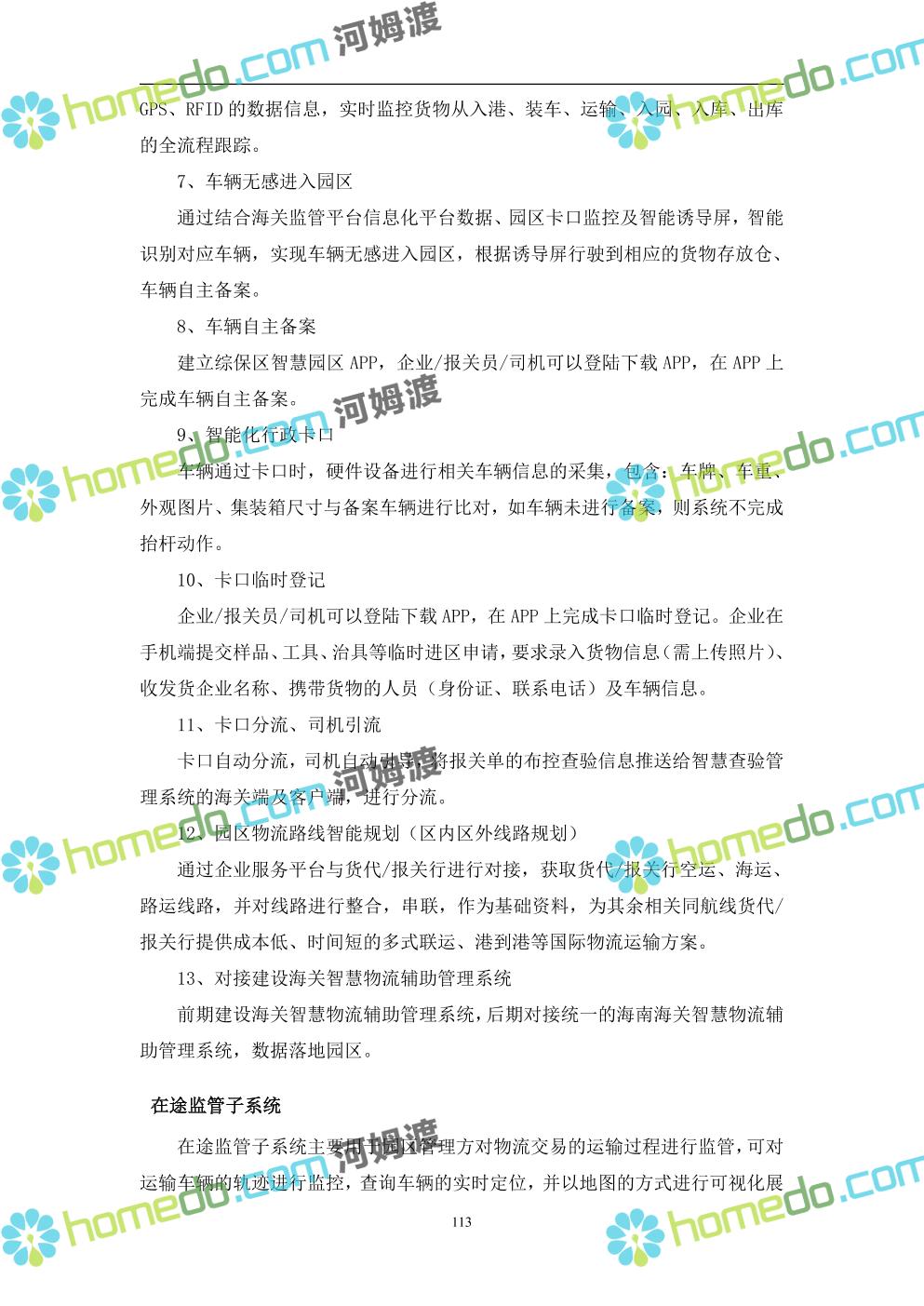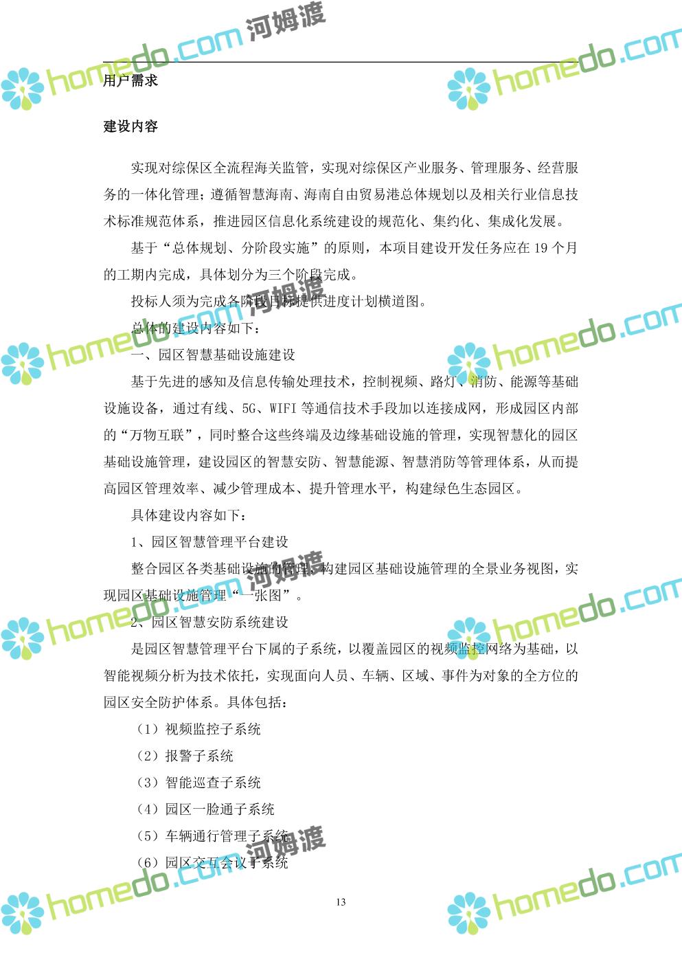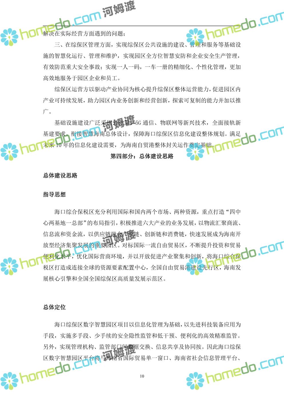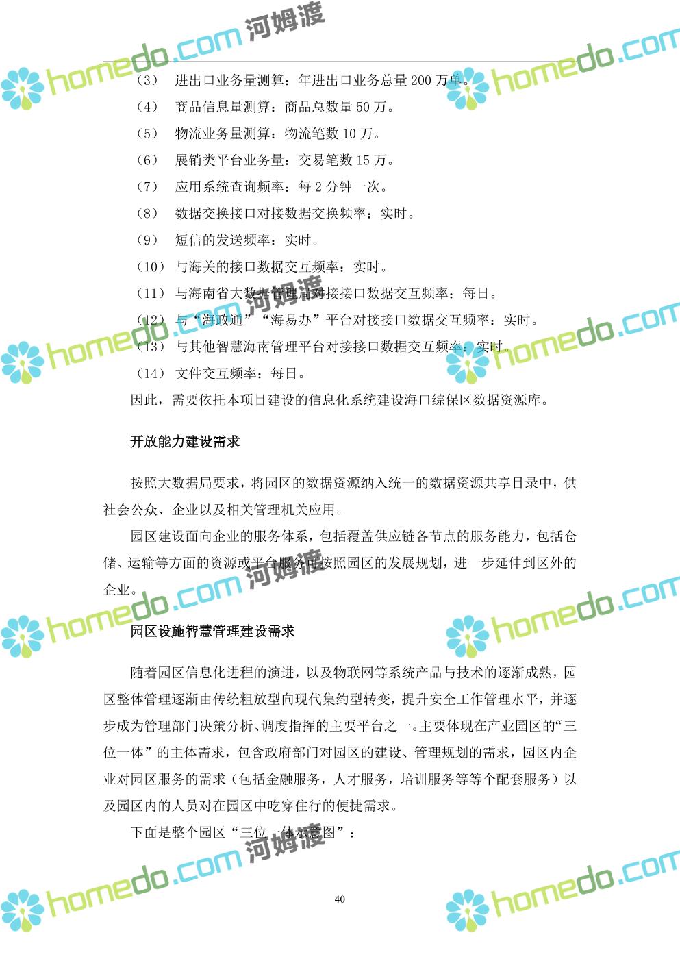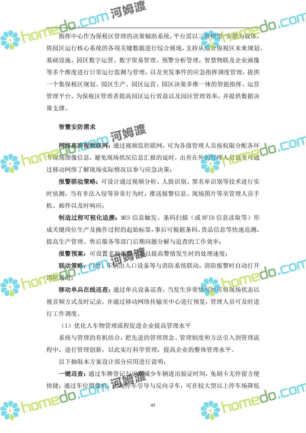 方案简介 本项目将以“1个方向、2个看齐、3个目标”服务六大产业建设海口综合保税区智慧园区: 1个方向:以“大连接”、”大平台”、”大数据”为核心,坚持综保区统筹规划、统筹布局、集约部署,自上而下构建体系优化、资源共享、功能强大、应用丰富、管理高效的智慧园区。 2个看齐:看齐试点建设全时空智慧园区;智慧赋能,看齐吸取上海洋山综保区成功经验,打造生态环境和营商环境双一流的智慧综保区。 3个目标:建设智慧监管,智慧协同海关等管理部门,优化营商环境、通关流程,完善设施建设,高效完成通关任务,实现对园区内企业管理,对接智慧海南“一人一码、一物一链、一企一账”实现海关对监管对象精准监管。
