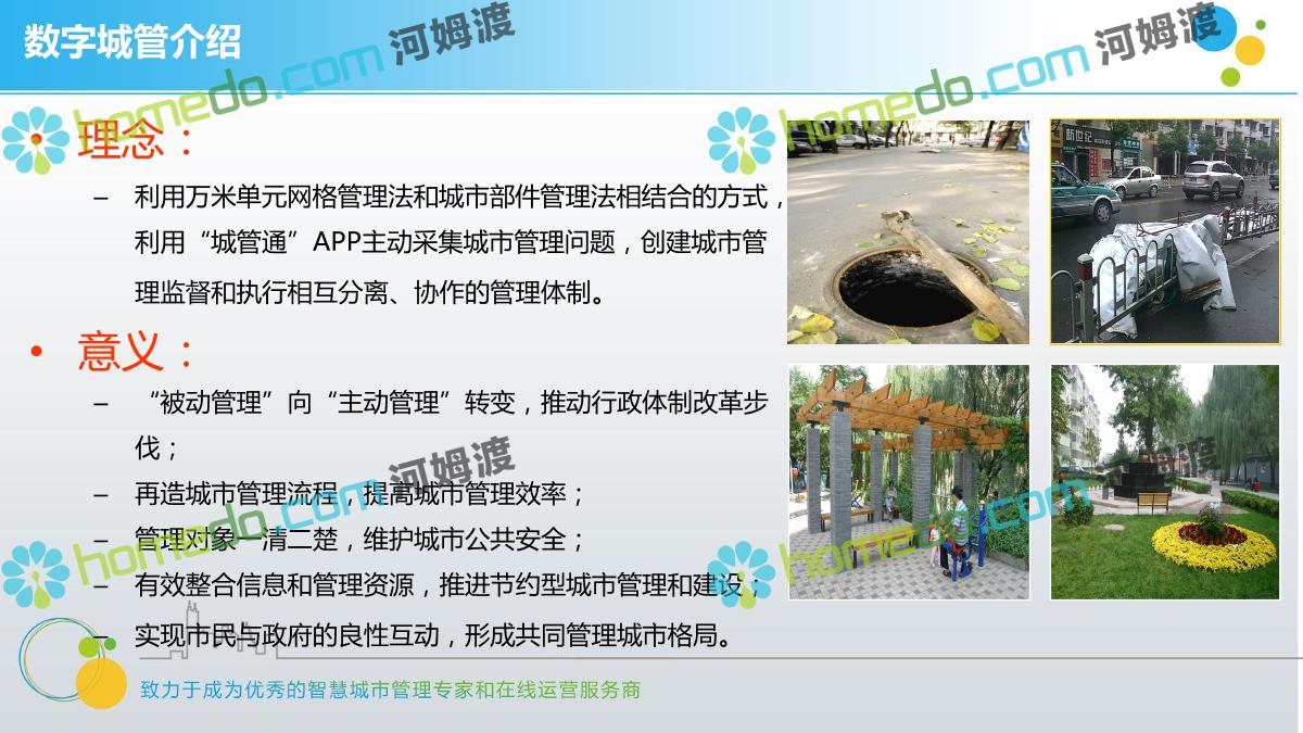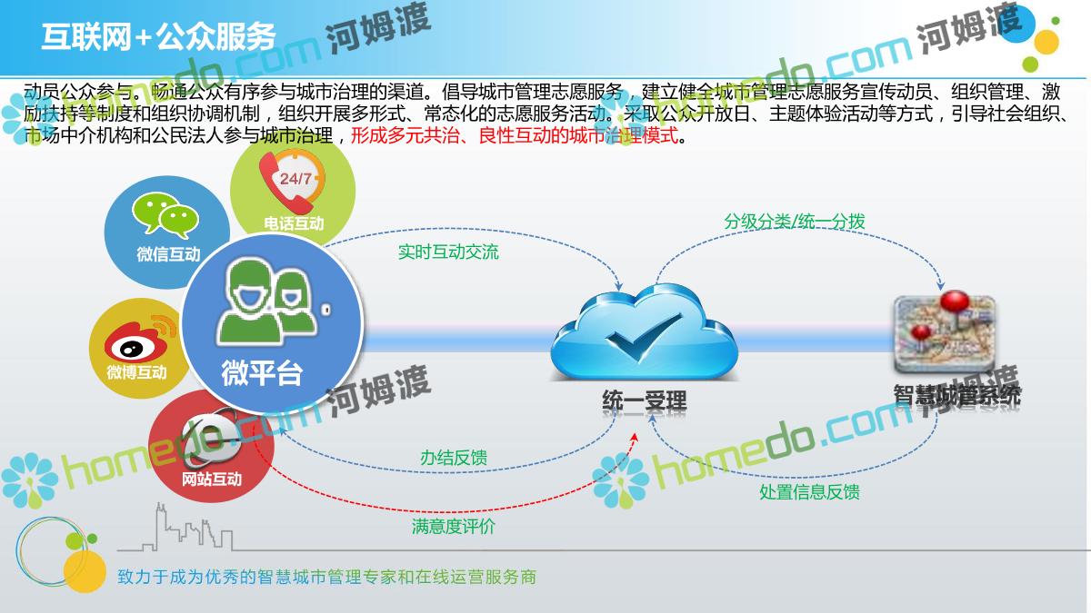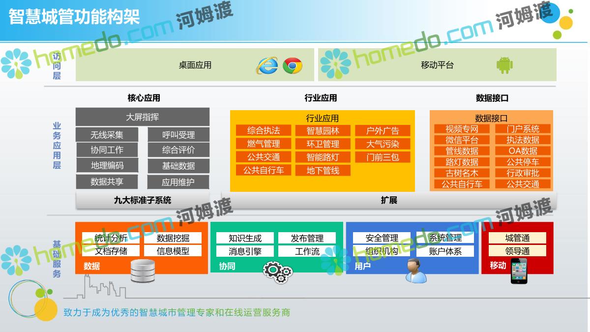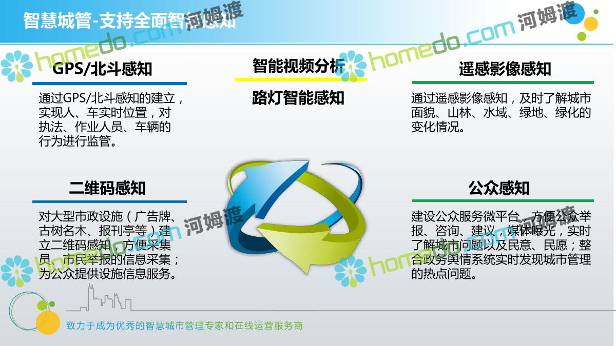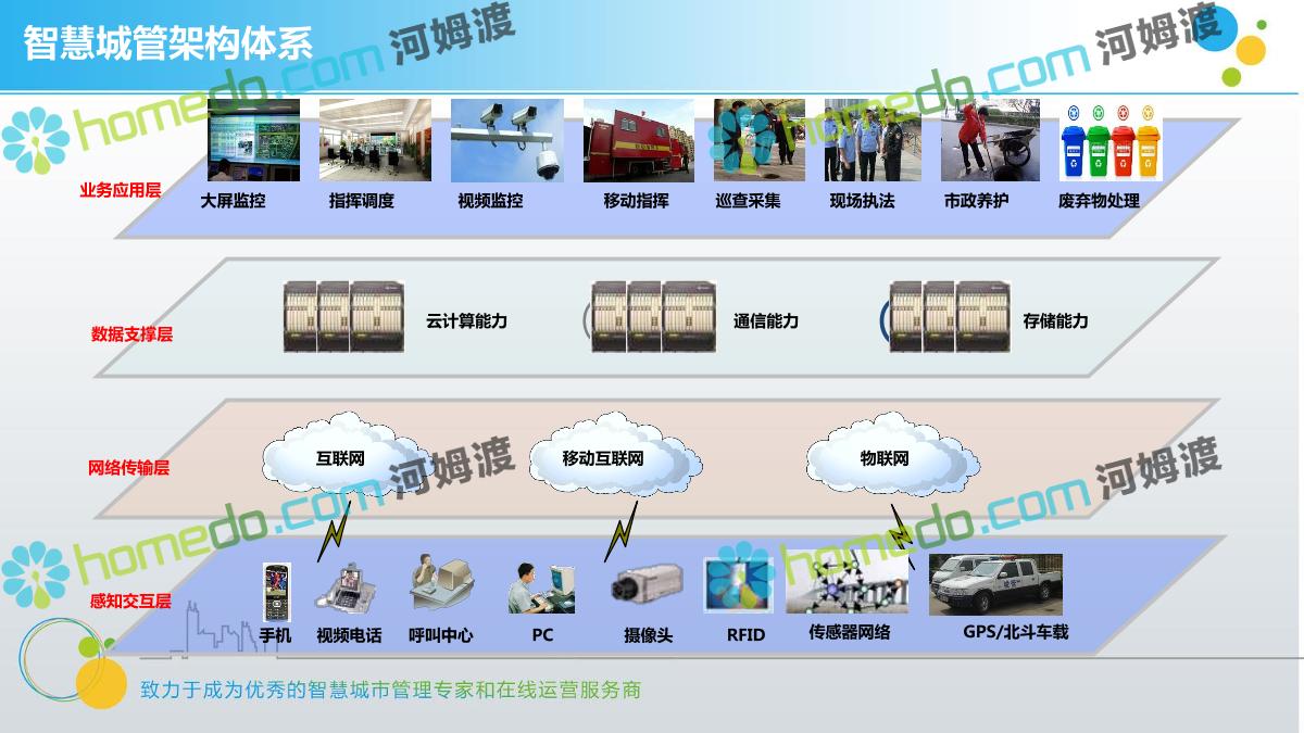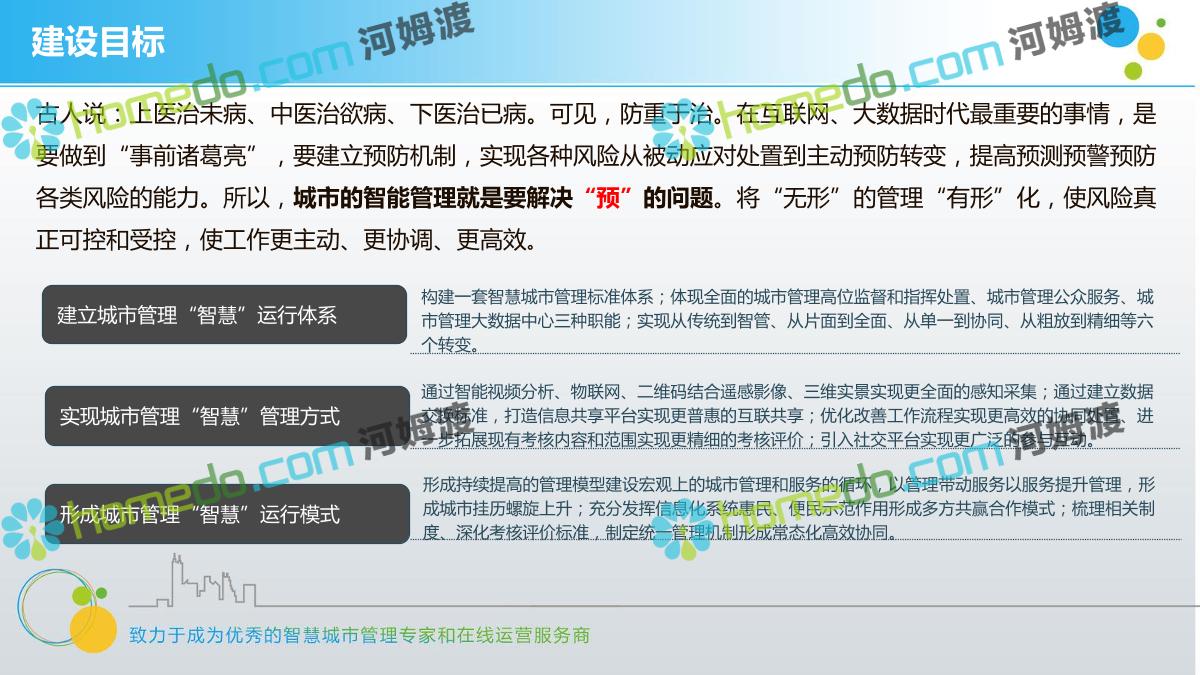 方案简介 建立城市管理“智慧”运行体系:构建一套智慧城市管理标准体系;体现全面的城市管理高位监督和指挥处置、城市管理公众服务、城市管理大数据中心三种职能;实现从传统到智管、从片面到全面、从单一到协同、从粗放到精细等六个转变。 现城市管理“智慧”管理方式:通过智能视频分析、物联网、二维码结合遥感影像、三维实景实现更全面的感知采集;通过建立数据交换标准,打造信息共享平台实现更普惠的互联共享 形成城市管理“智慧”运行模式:形成持续提高的管理模型建设宏观上的城市管理和服务的循环,以管理带动服务以服务提升管理,形成城市挂历螺旋上升;充分发挥信息化系统惠民、便民示范作用形成多方共赢合作模式。