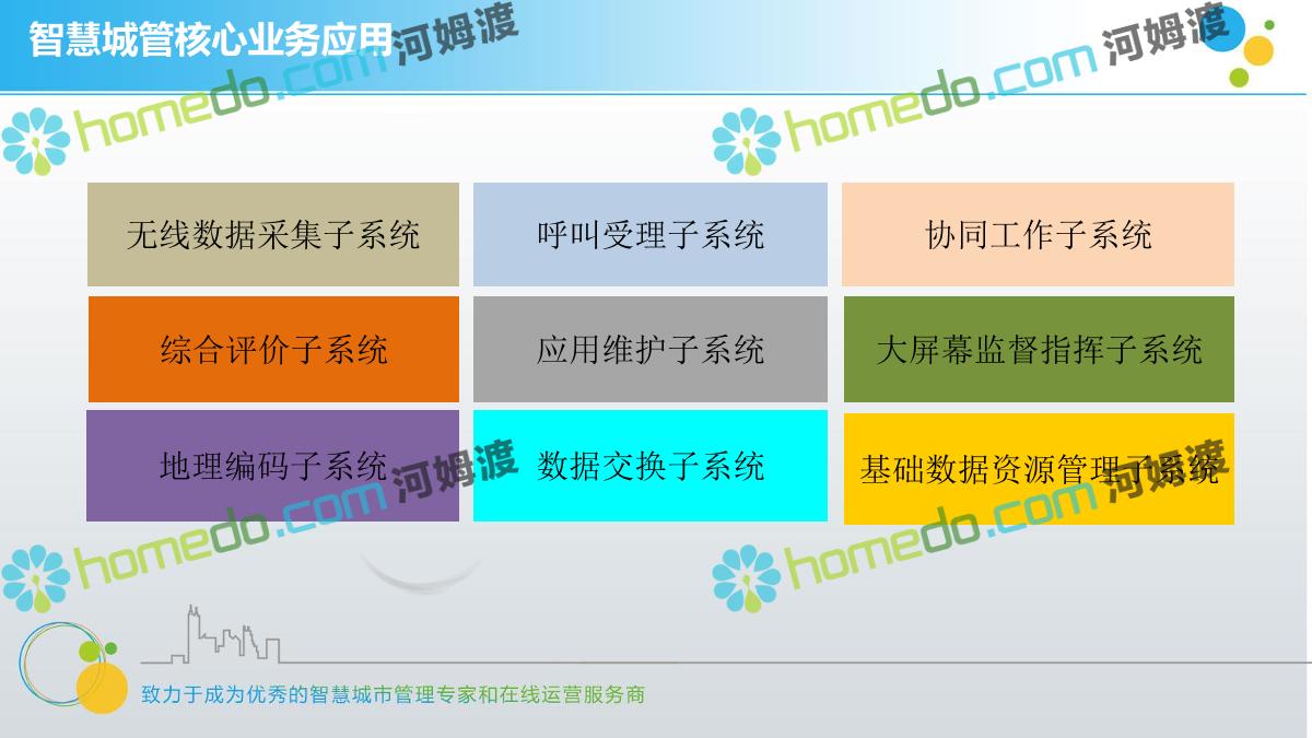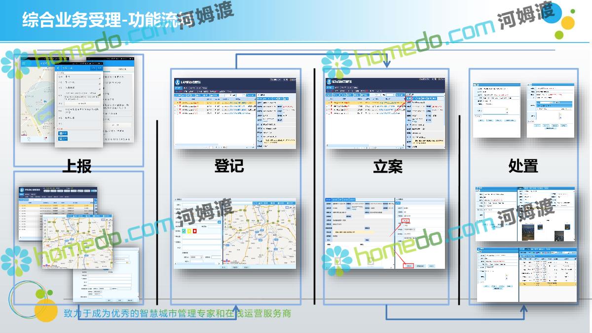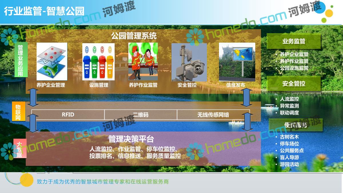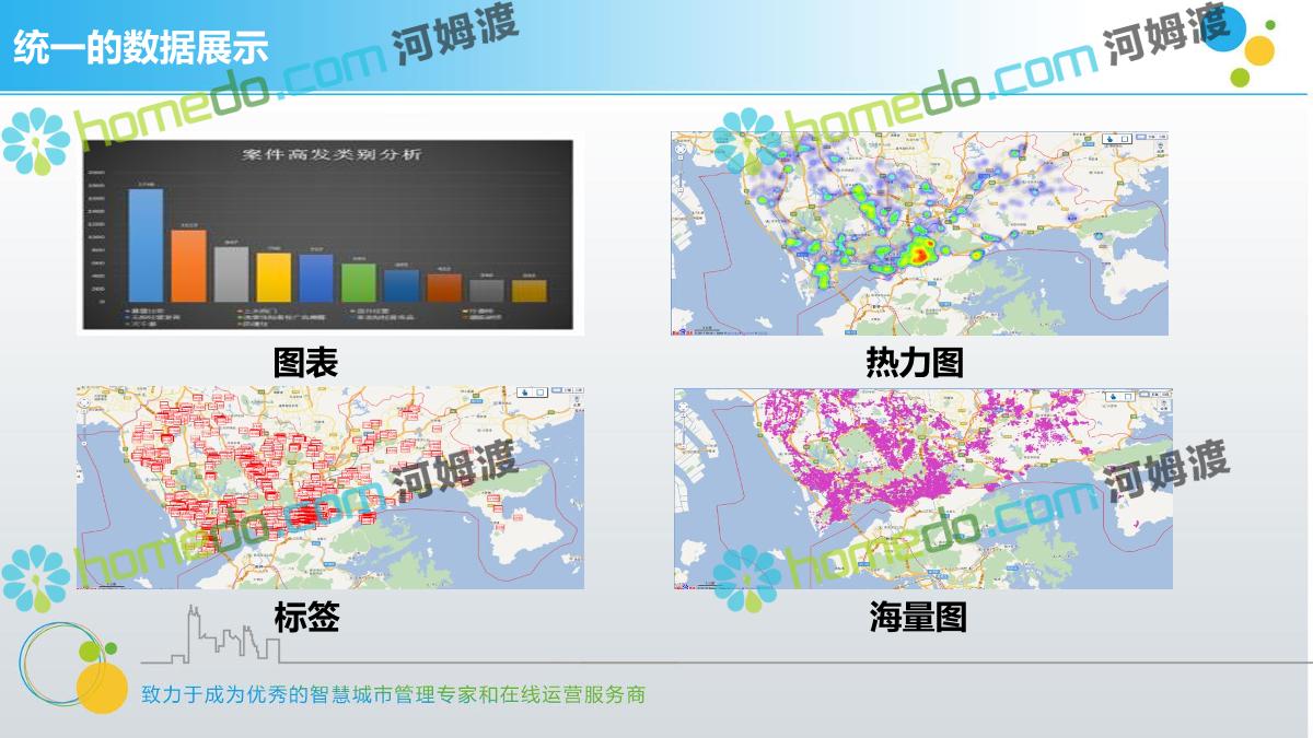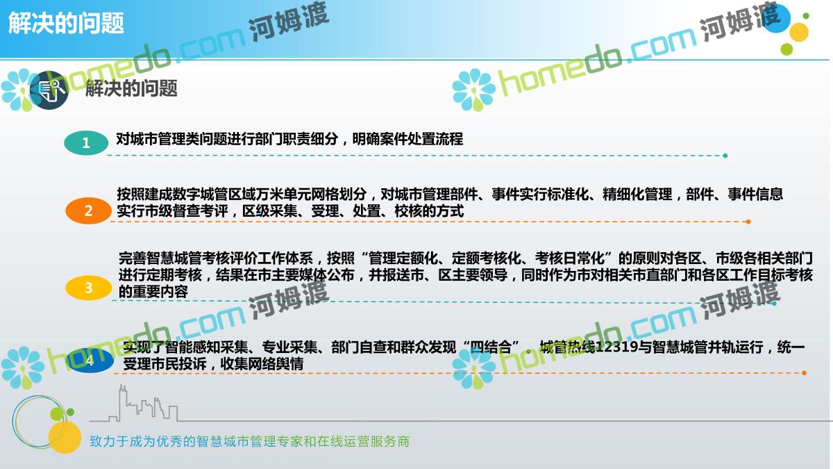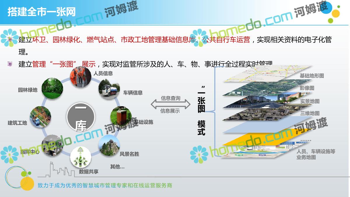 方案简介 建立城市管理“智慧”运行体系:构建一套智慧城市管理标准体系;体现全面的城市管理高位监督和指挥处置、城市管理公众服务、城市管理大数据中心三种职能;实现从传统到智管、从片面到全面、从单一到协同、从粗放到精细等六个转变。 现城市管理“智慧”管理方式:通过智能视频分析、物联网、二维码结合遥感影像、三维实景实现更全面的感知采集;通过建立数据交换标准,打造信息共享平台实现更普惠的互联共享 形成城市管理“智慧”运行模式:形成持续提高的管理模型建设宏观上的城市管理和服务的循环,以管理带动服务以服务提升管理,形成城市挂历螺旋上升;充分发挥信息化系统惠民、便民示范作用形成多方共赢合作模式。
