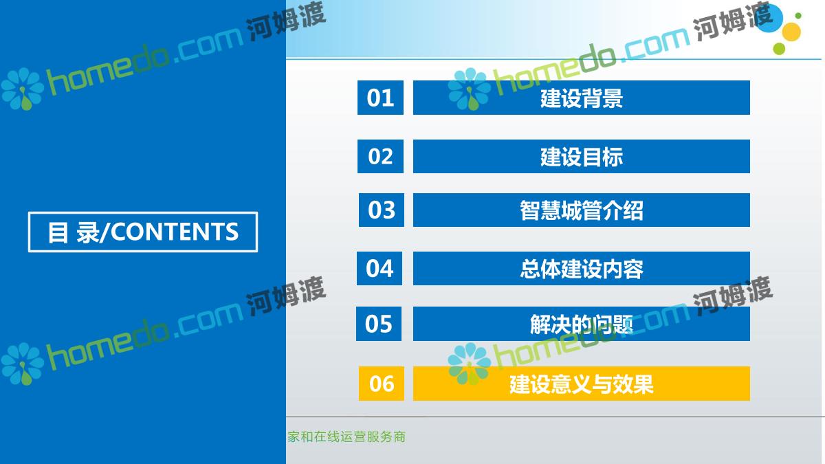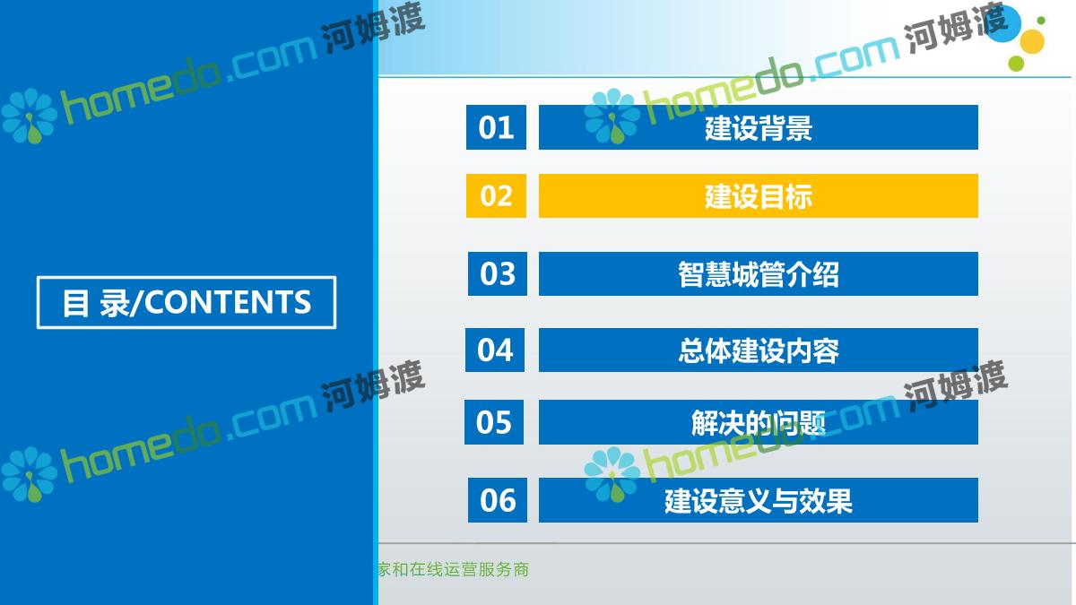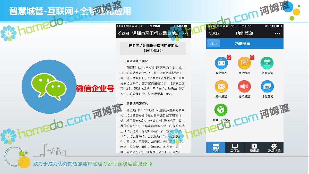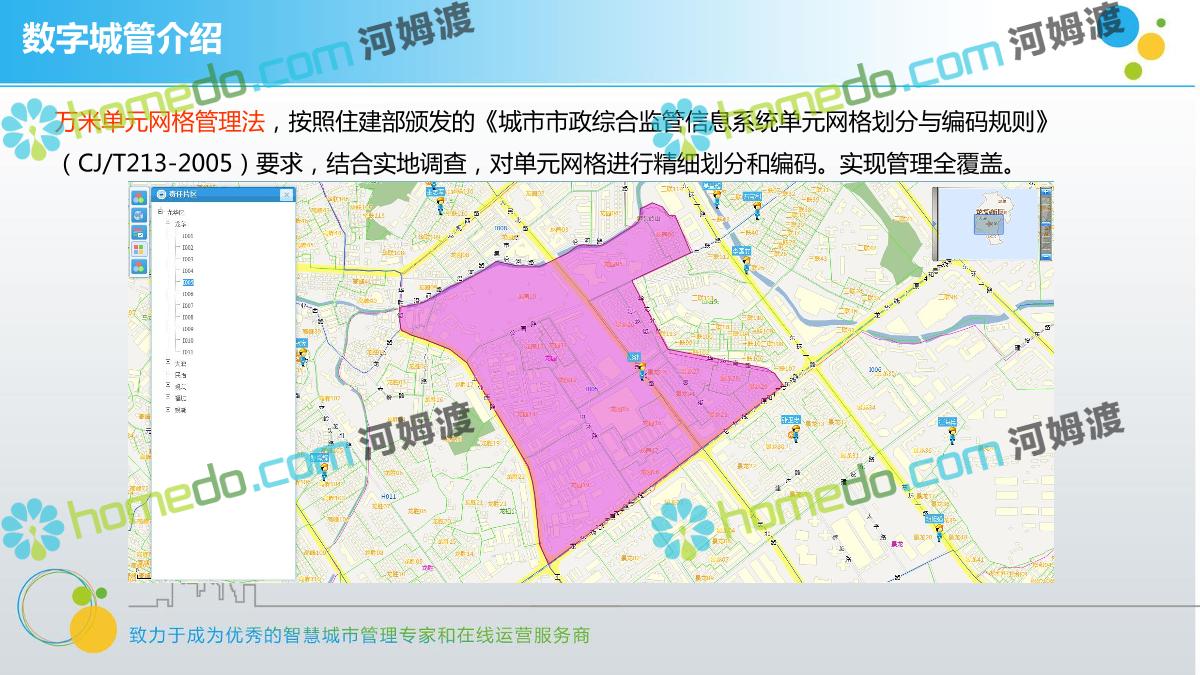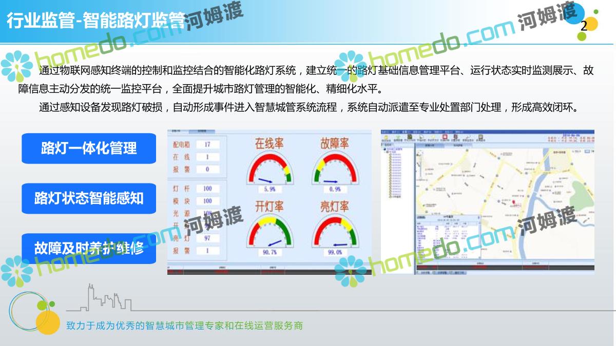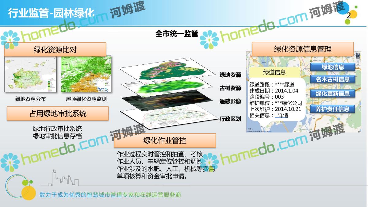 方案简介 建立城市管理“智慧”运行体系:构建一套智慧城市管理标准体系;体现全面的城市管理高位监督和指挥处置、城市管理公众服务、城市管理大数据中心三种职能;实现从传统到智管、从片面到全面、从单一到协同、从粗放到精细等六个转变。 现城市管理“智慧”管理方式:通过智能视频分析、物联网、二维码结合遥感影像、三维实景实现更全面的感知采集;通过建立数据交换标准,打造信息共享平台实现更普惠的互联共享 形成城市管理“智慧”运行模式:形成持续提高的管理模型建设宏观上的城市管理和服务的循环,以管理带动服务以服务提升管理,形成城市挂历螺旋上升;充分发挥信息化系统惠民、便民示范作用形成多方共赢合作模式。