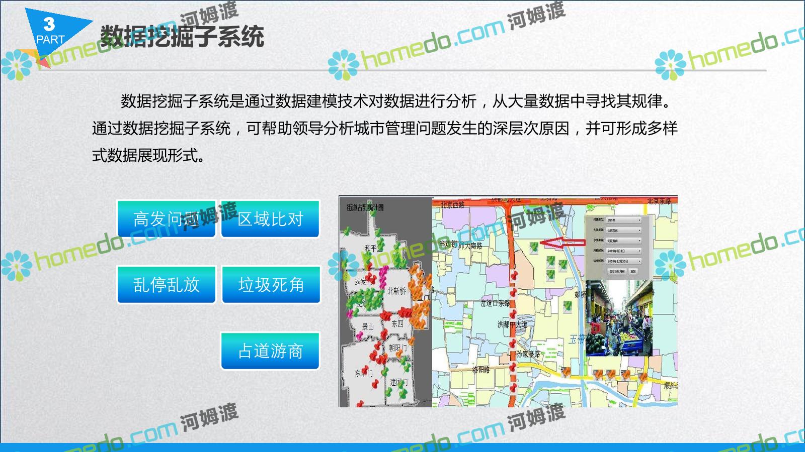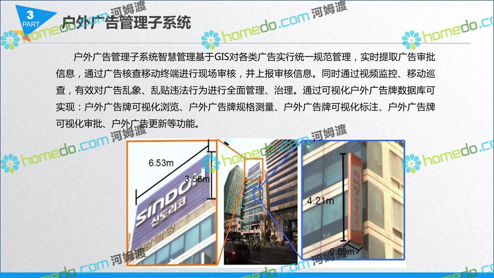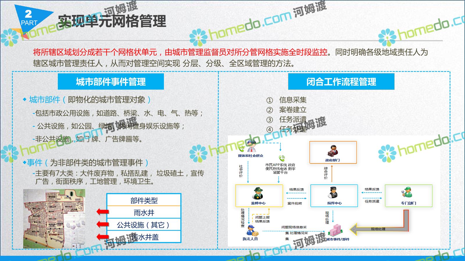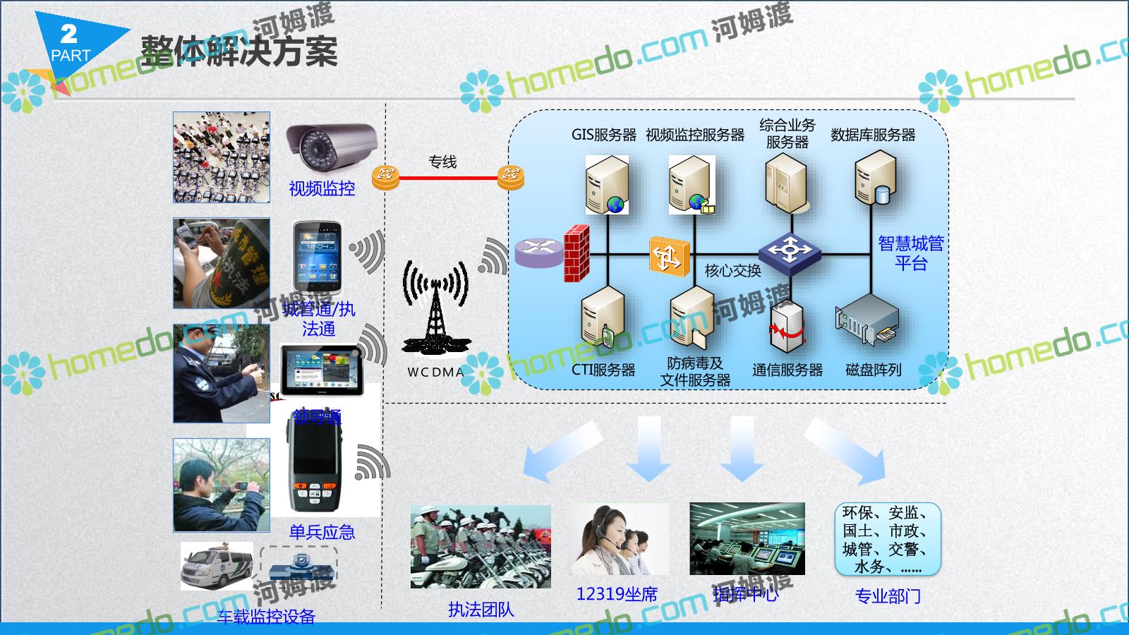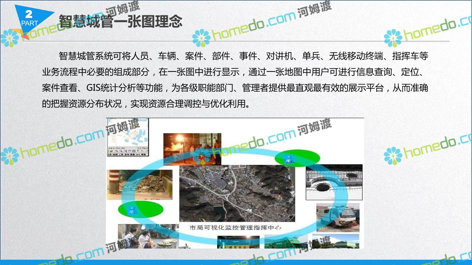 方案简介 智慧城管系统可将人员、车辆、案件、部件、事件、对讲机、单兵、无线移动终端、指挥车等业务流程中必要的组成部分,在一张图中进行显示,通过一张地图中用户可进行信息查询、定位、案件查看、GIS统计分析等功能,为各级职能部门、管理者提供最直观最有效的展示平台,从而准确的把握资源分布状况,实现资源合理调控与优化利用。