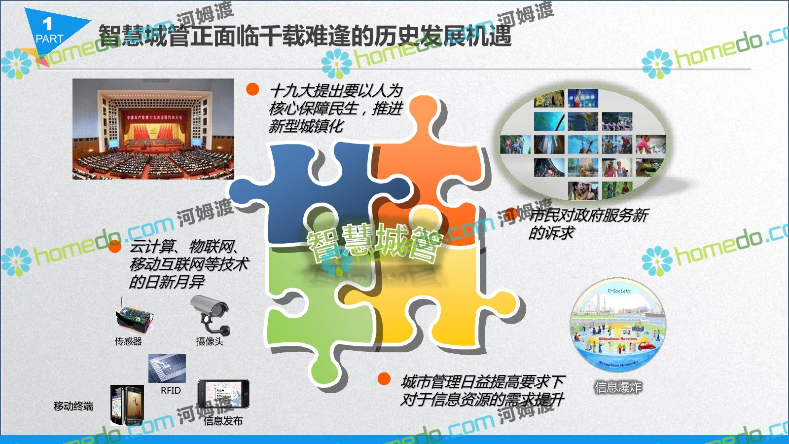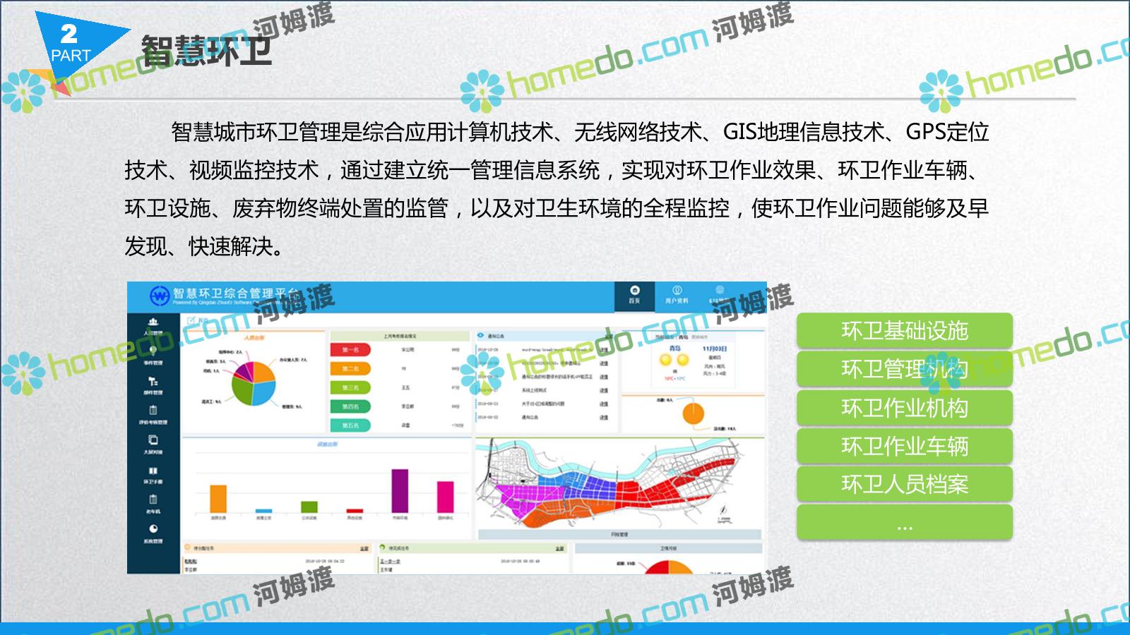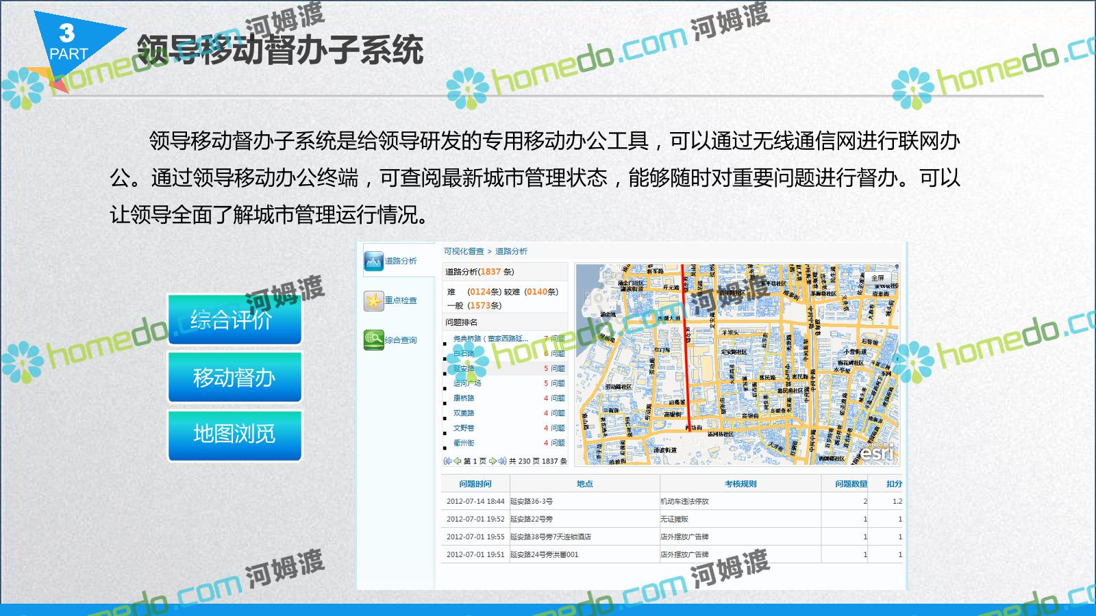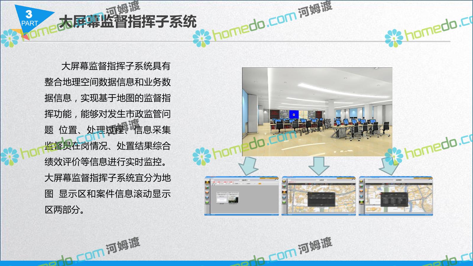 方案简介 智慧城管系统可将人员、车辆、案件、部件、事件、对讲机、单兵、无线移动终端、指挥车等业务流程中必要的组成部分,在一张图中进行显示,通过一张地图中用户可进行信息查询、定位、案件查看、GIS统计分析等功能,为各级职能部门、管理者提供最直观最有效的展示平台,从而准确的把握资源分布状况,实现资源合理调控与优化利用。