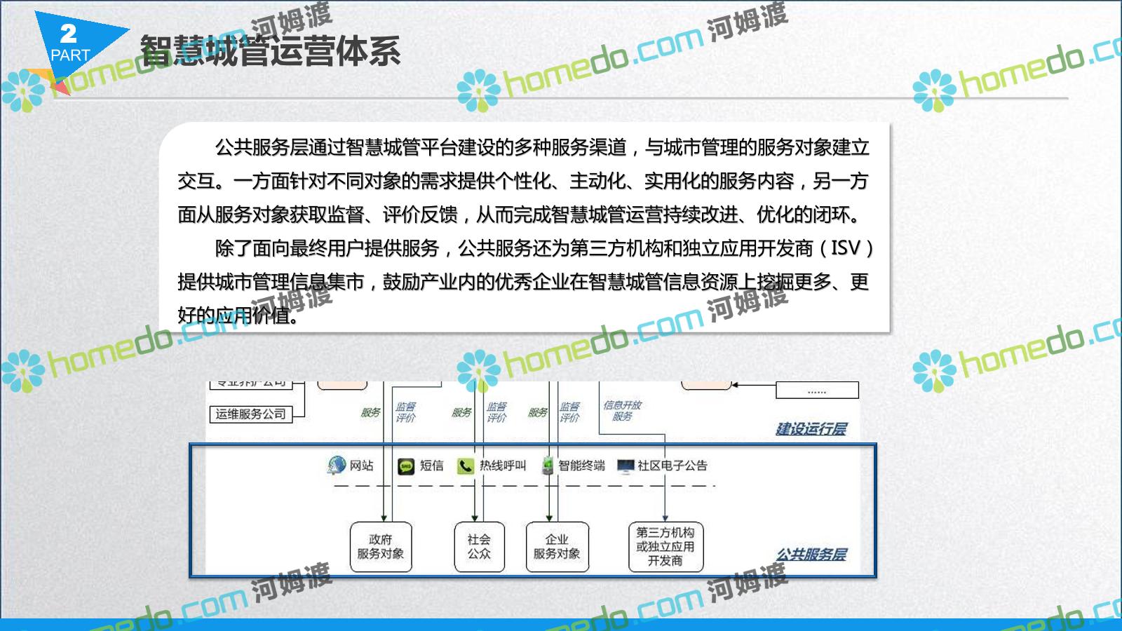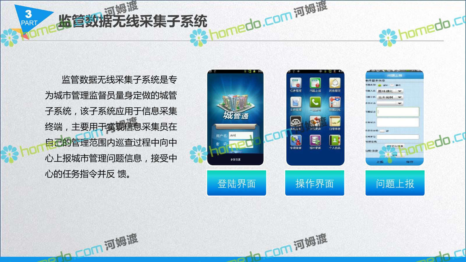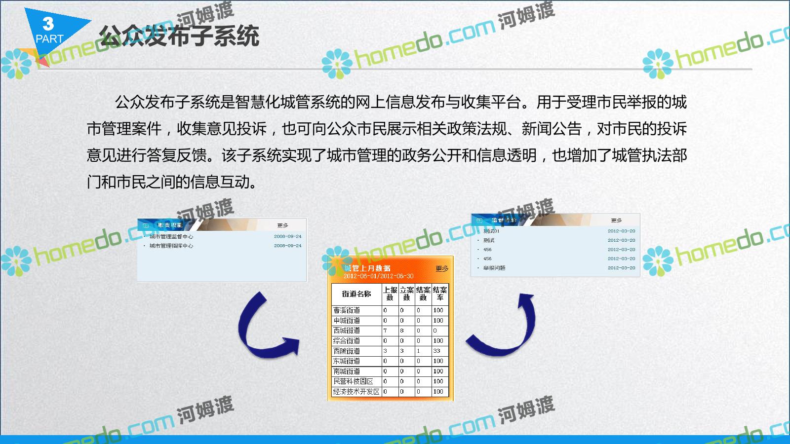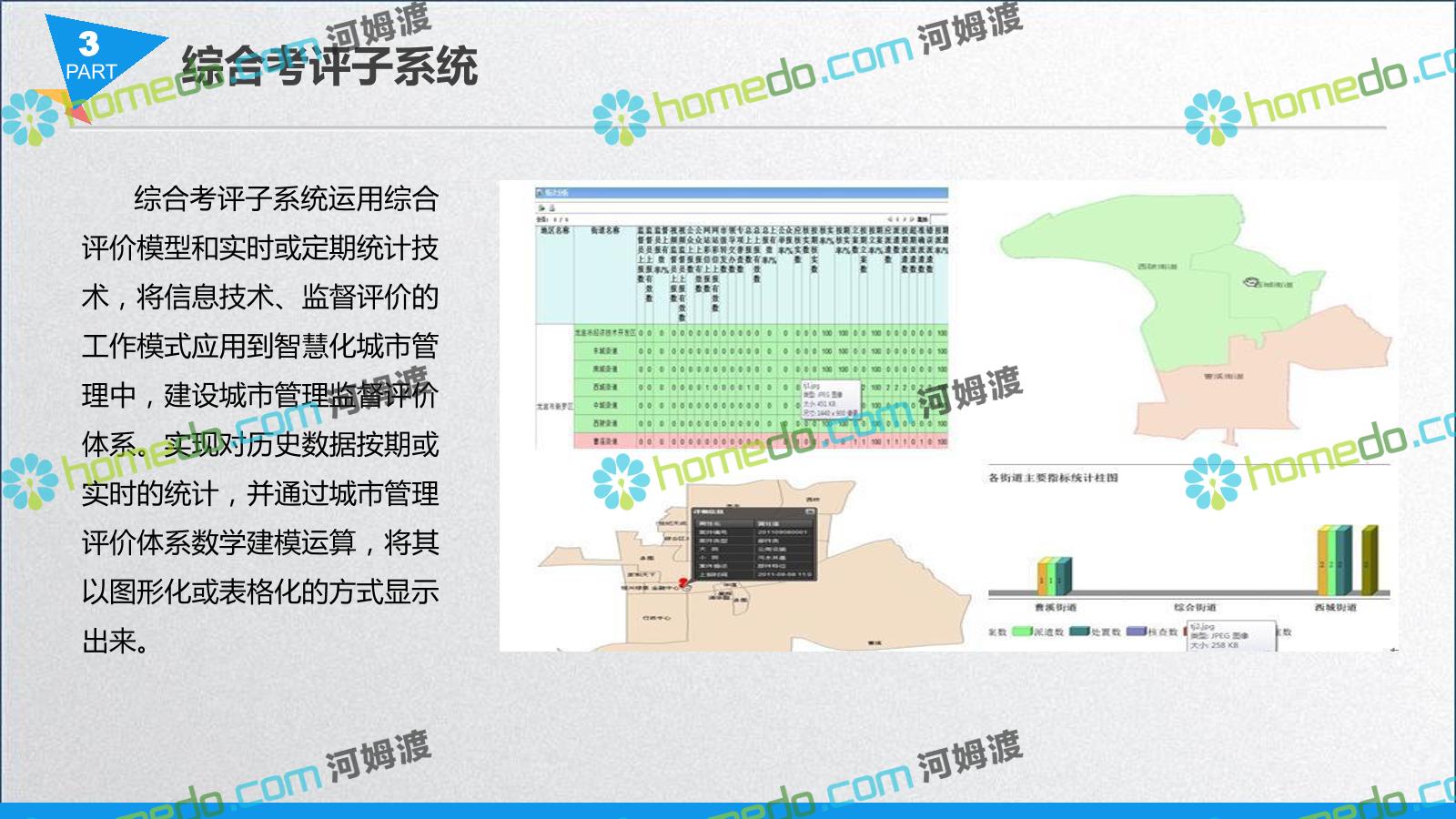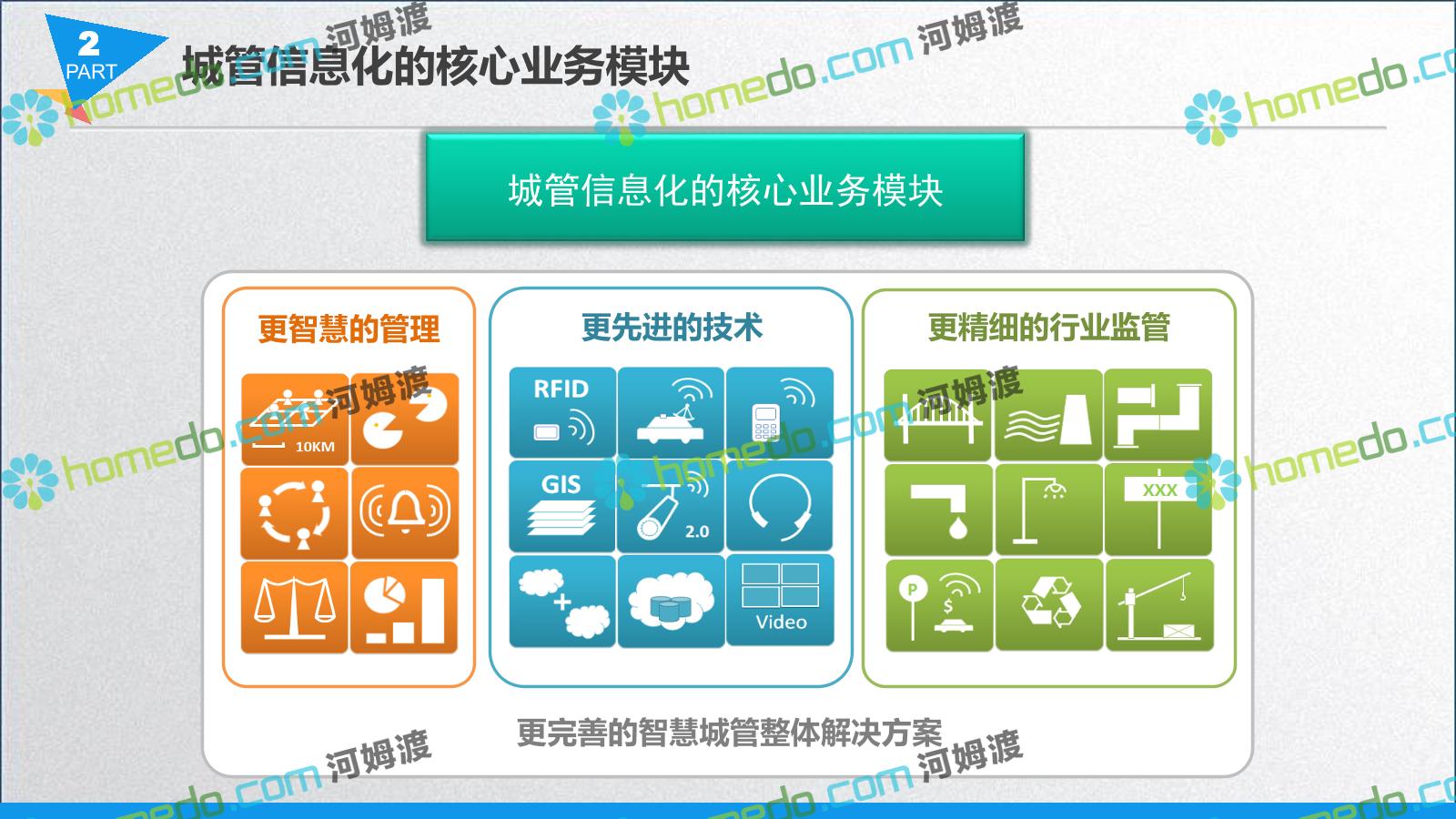 方案简介 智慧城管系统可将人员、车辆、案件、部件、事件、对讲机、单兵、无线移动终端、指挥车等业务流程中必要的组成部分,在一张图中进行显示,通过一张地图中用户可进行信息查询、定位、案件查看、GIS统计分析等功能,为各级职能部门、管理者提供最直观最有效的展示平台,从而准确的把握资源分布状况,实现资源合理调控与优化利用。