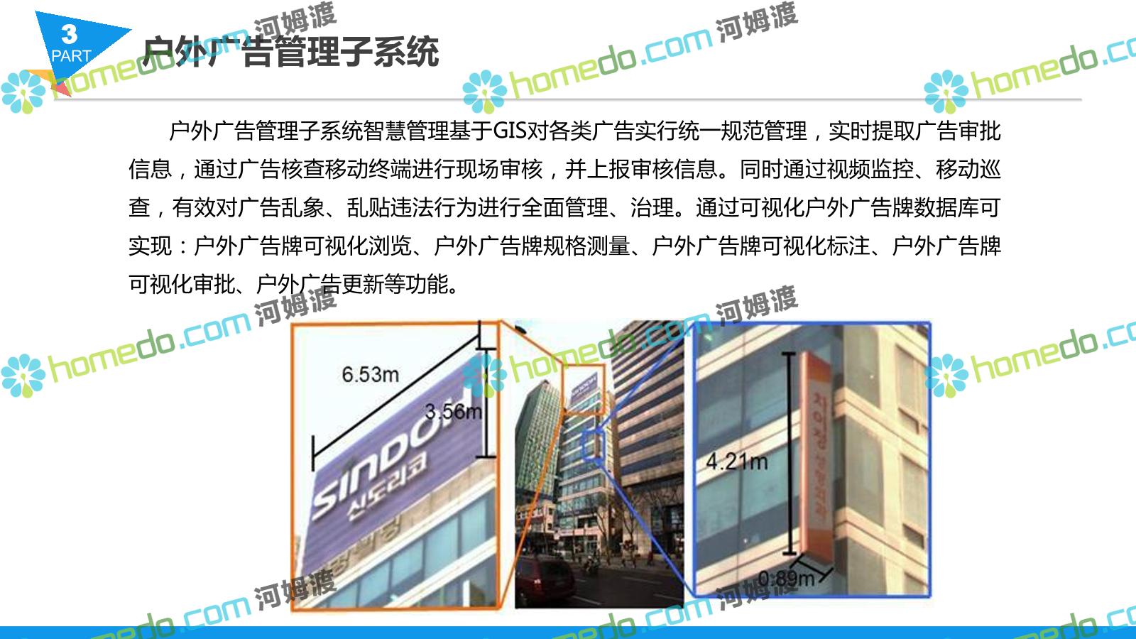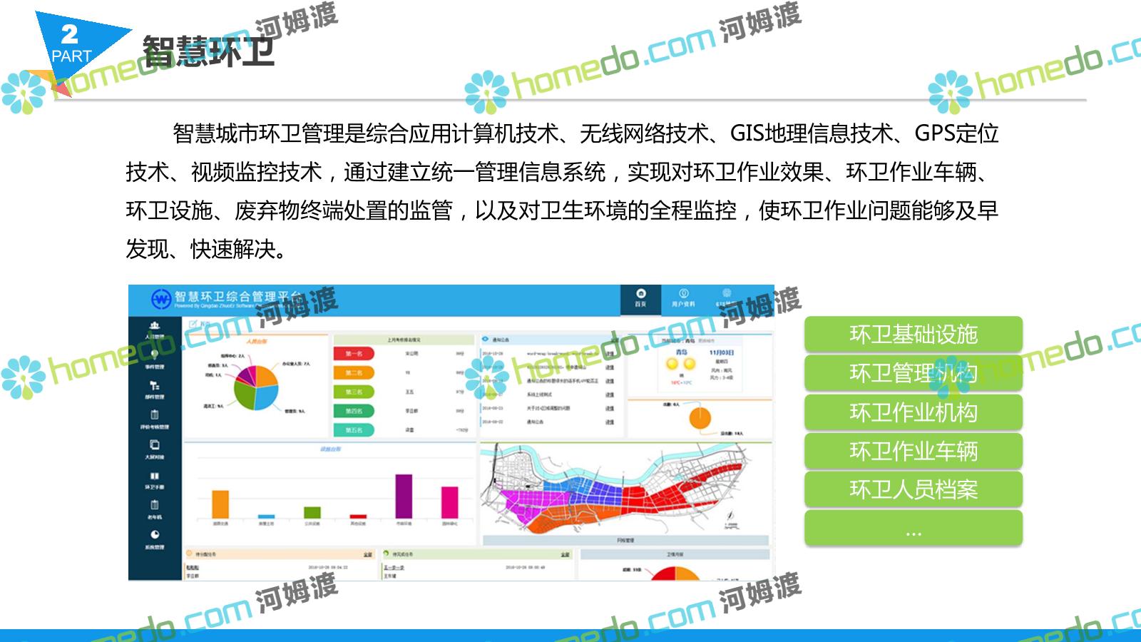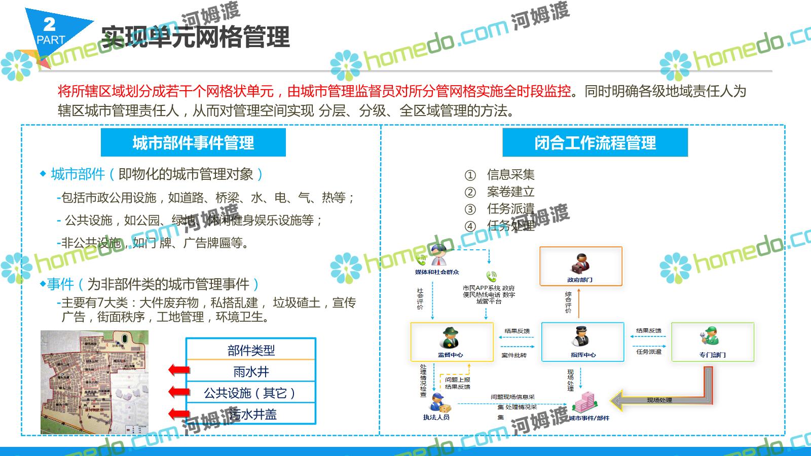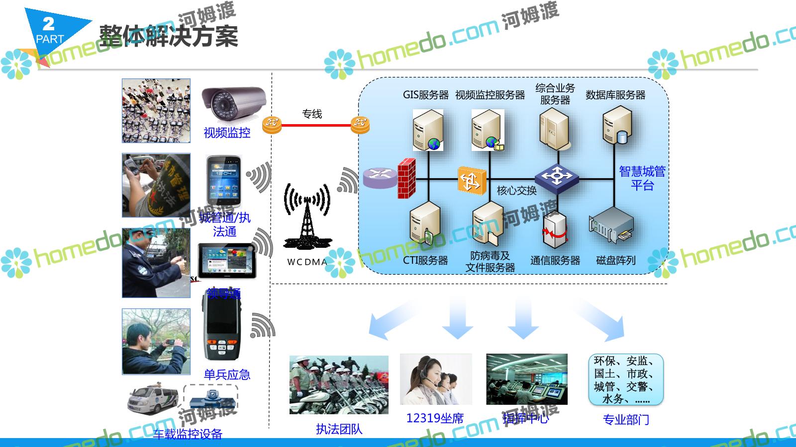 方案简介 智慧城管系统可将人员、车辆、案件、部件、事件、对讲机、单兵、无线移动终端、指挥车等业务流程中必要的组成部分,在一张图中进行显示,通过一张地图中用户可进行信息查询、定位、案件查看、GIS统计分析等功能,为各级职能部门、管理者提供最直观最有效的展示平台,从而准确的把握资源分布状况,实现资源合理调控与优化利用。