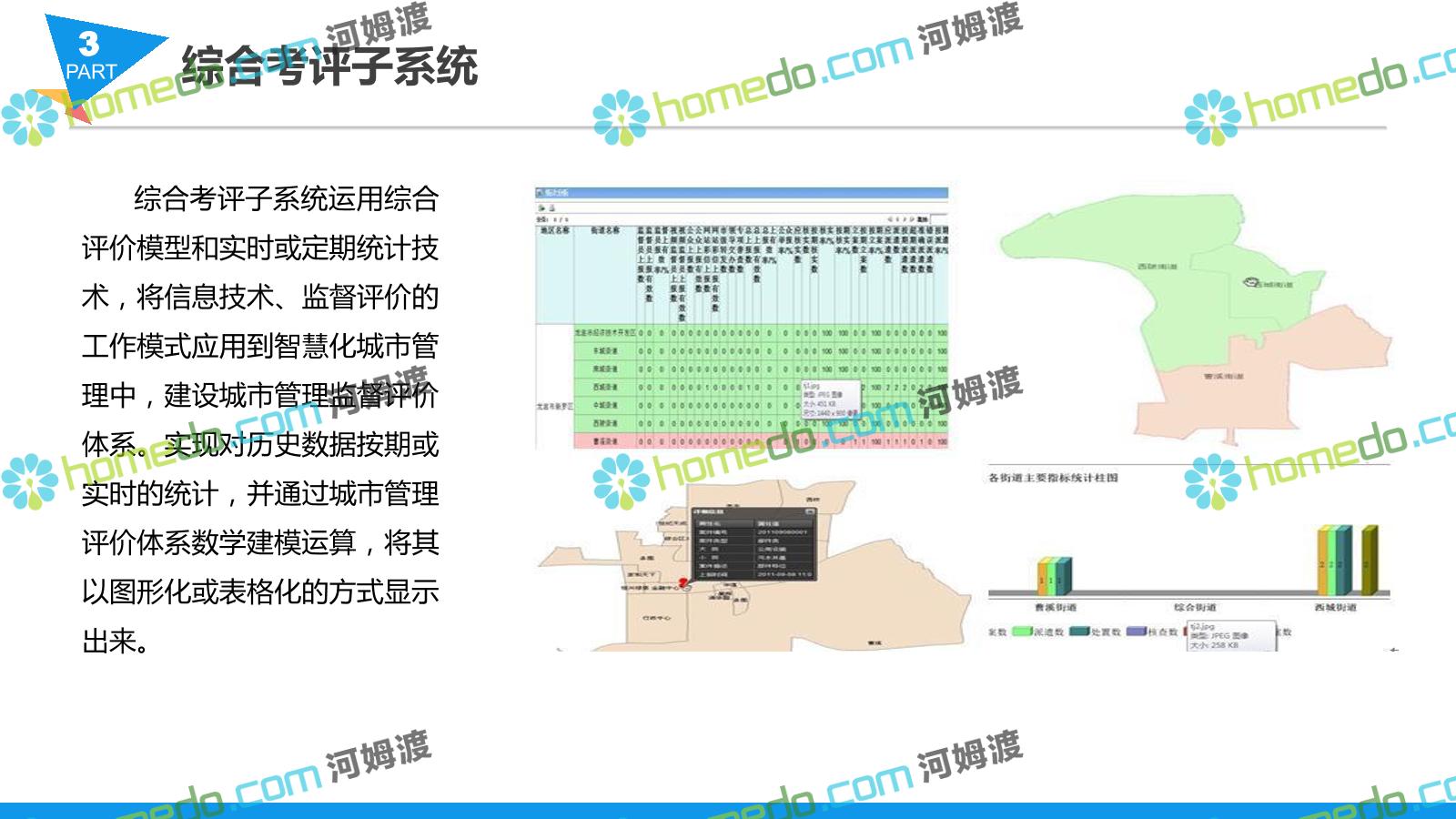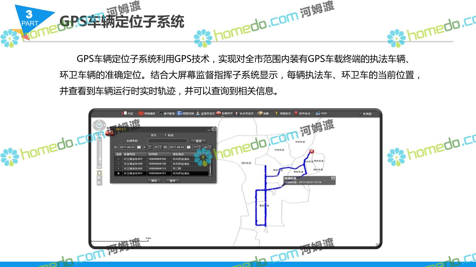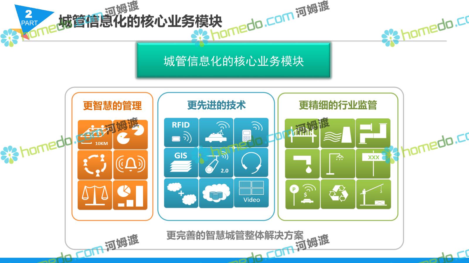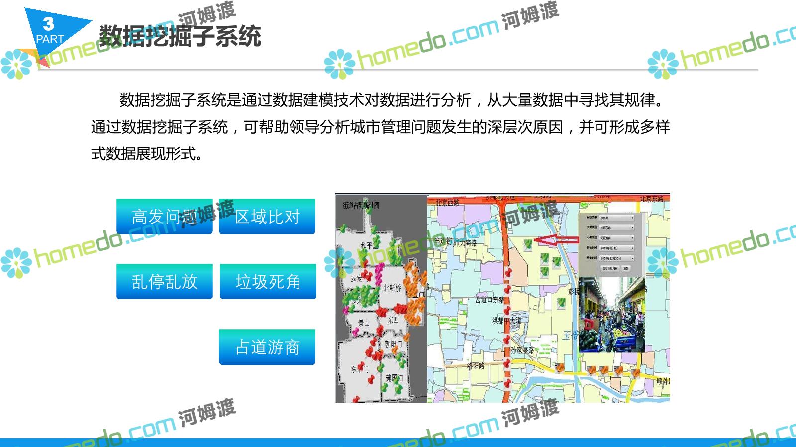 方案简介 智慧城管系统可将人员、车辆、案件、部件、事件、对讲机、单兵、无线移动终端、指挥车等业务流程中必要的组成部分,在一张图中进行显示,通过一张地图中用户可进行信息查询、定位、案件查看、GIS统计分析等功能,为各级职能部门、管理者提供最直观最有效的展示平台,从而准确的把握资源分布状况,实现资源合理调控与优化利用。