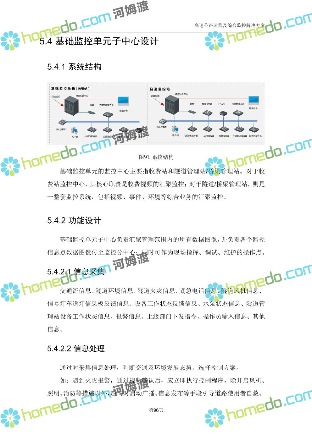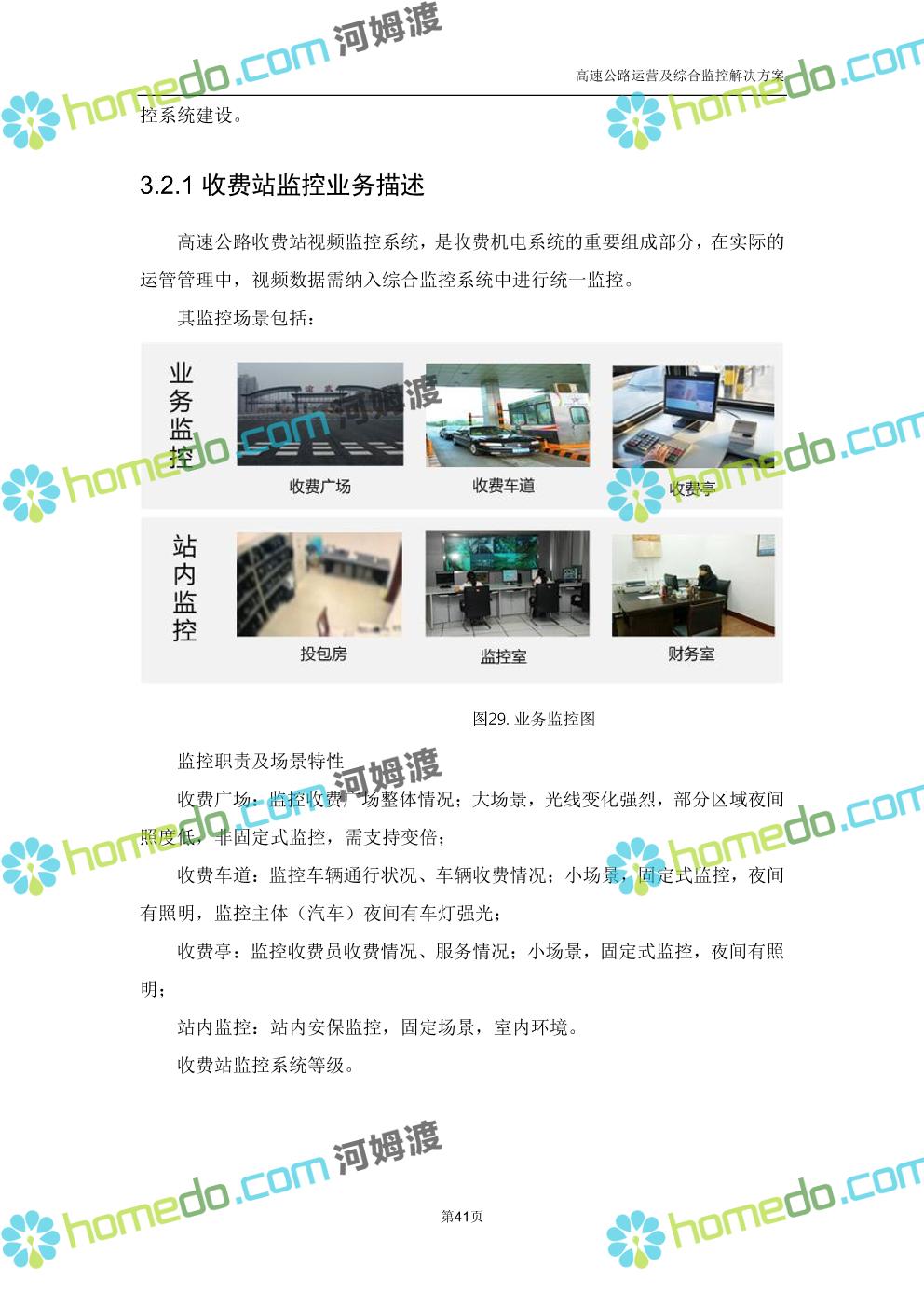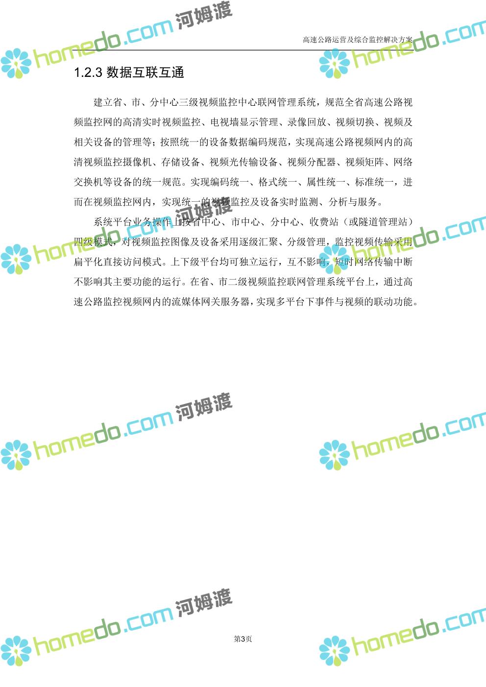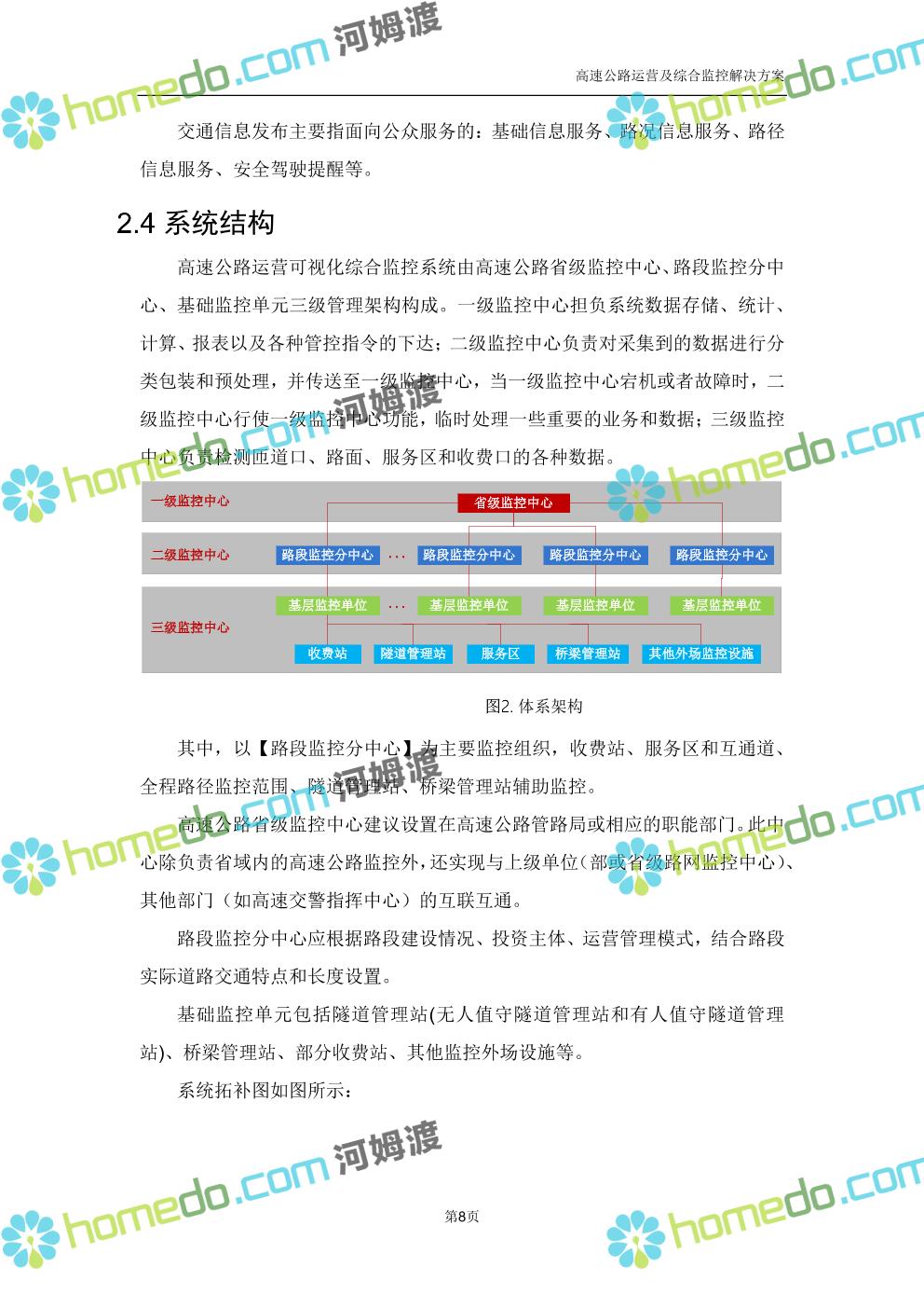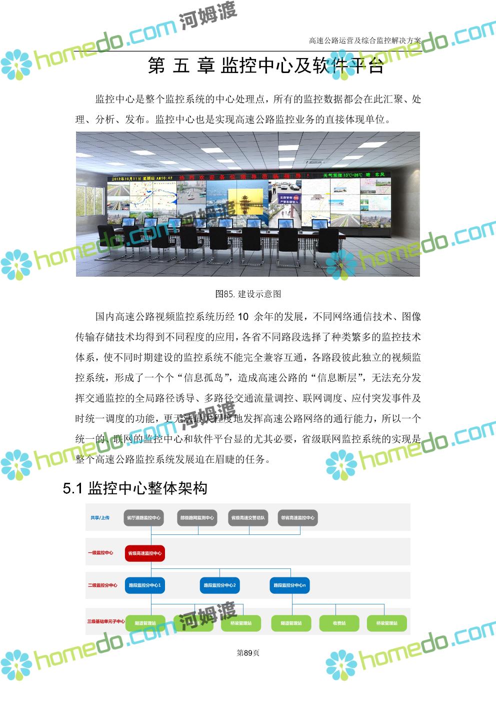 方案简介 高速公路运营可视化综合监控系统由高速公路省级监控中心、路段监控分中心、基础监控单元三级管理架构构成。一级监控中心担负系统数据存储、统计、计算、报表以及各种管控指令的下达;二级监控中心负责对采集到的数据进行分类包装和预处理,并传送至一级监控中心,当一级监控中心宕机或者故障时,二级监控中心行使一级监控中心功能,临时处理一些重要的业务和数据;三级监控中心负责检测匝道口、路面、服务区和收费口的各种数据。