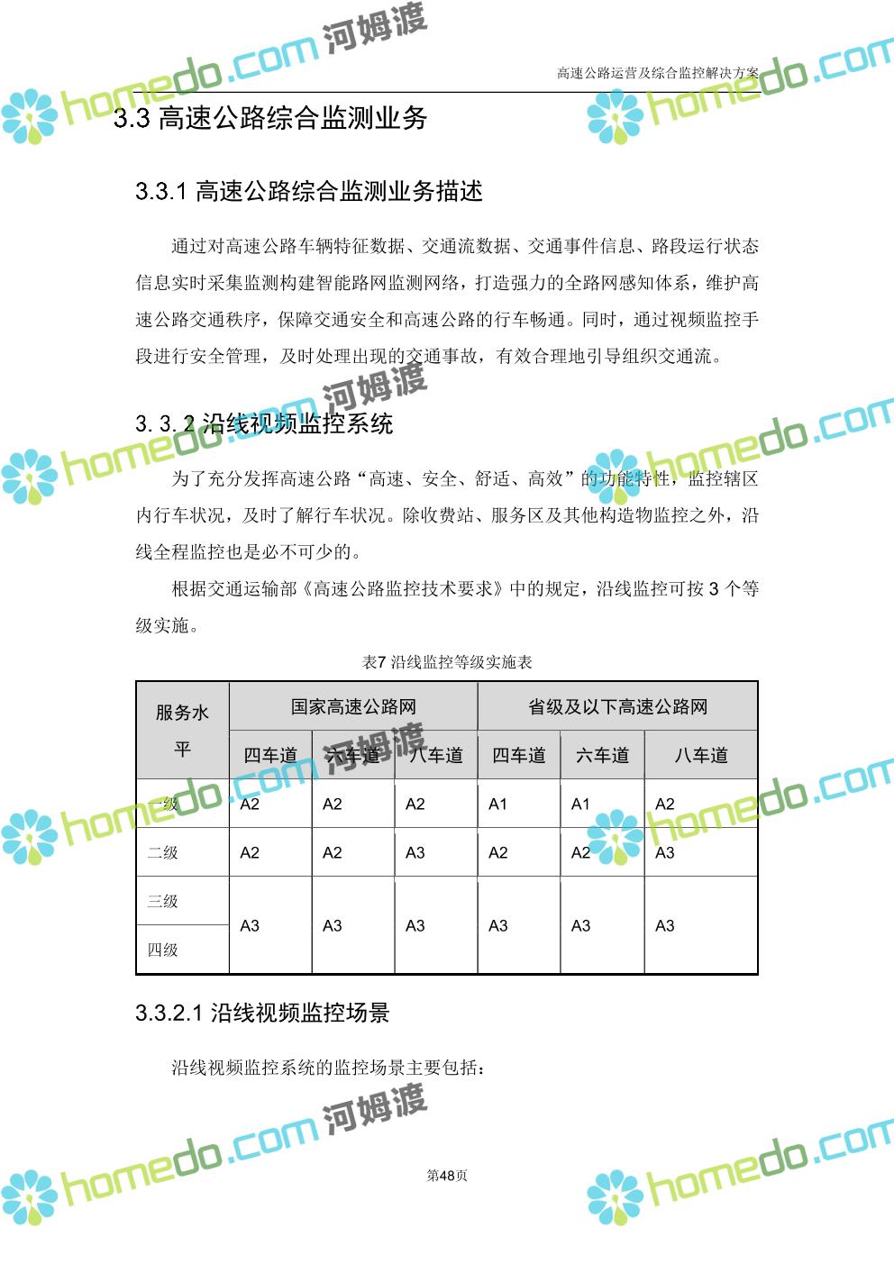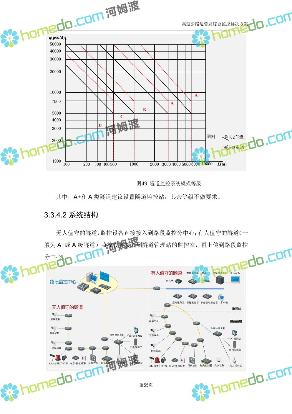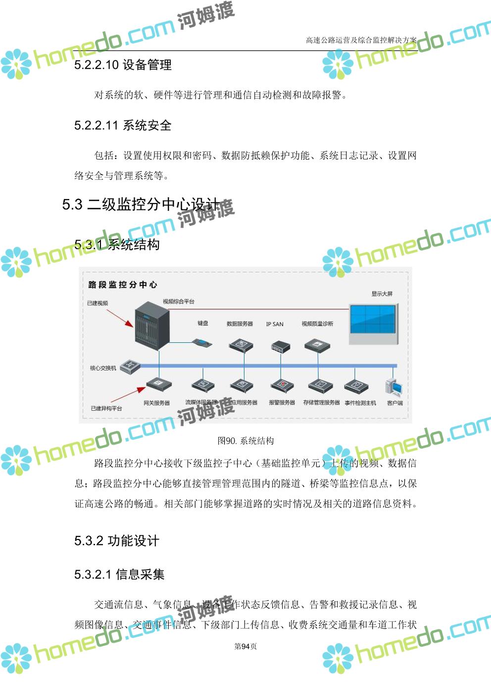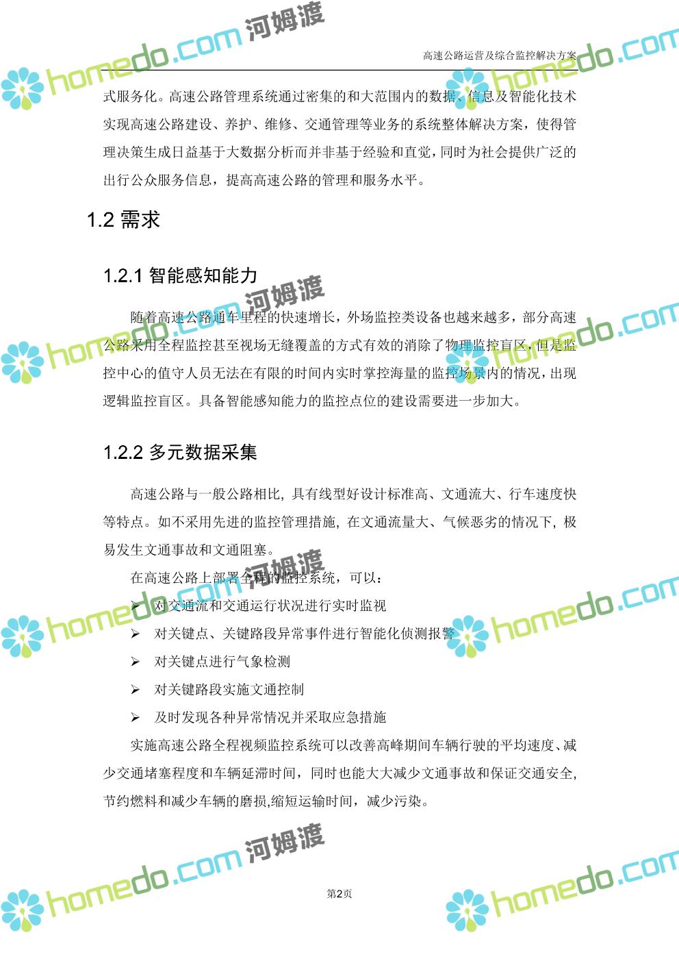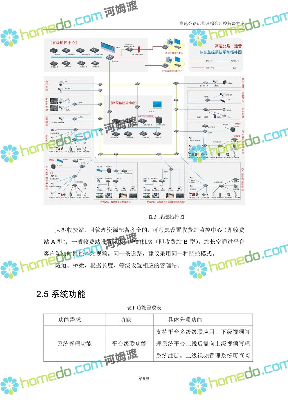 方案简介 高速公路运营可视化综合监控系统由高速公路省级监控中心、路段监控分中心、基础监控单元三级管理架构构成。一级监控中心担负系统数据存储、统计、计算、报表以及各种管控指令的下达;二级监控中心负责对采集到的数据进行分类包装和预处理,并传送至一级监控中心,当一级监控中心宕机或者故障时,二级监控中心行使一级监控中心功能,临时处理一些重要的业务和数据;三级监控中心负责检测匝道口、路面、服务区和收费口的各种数据。