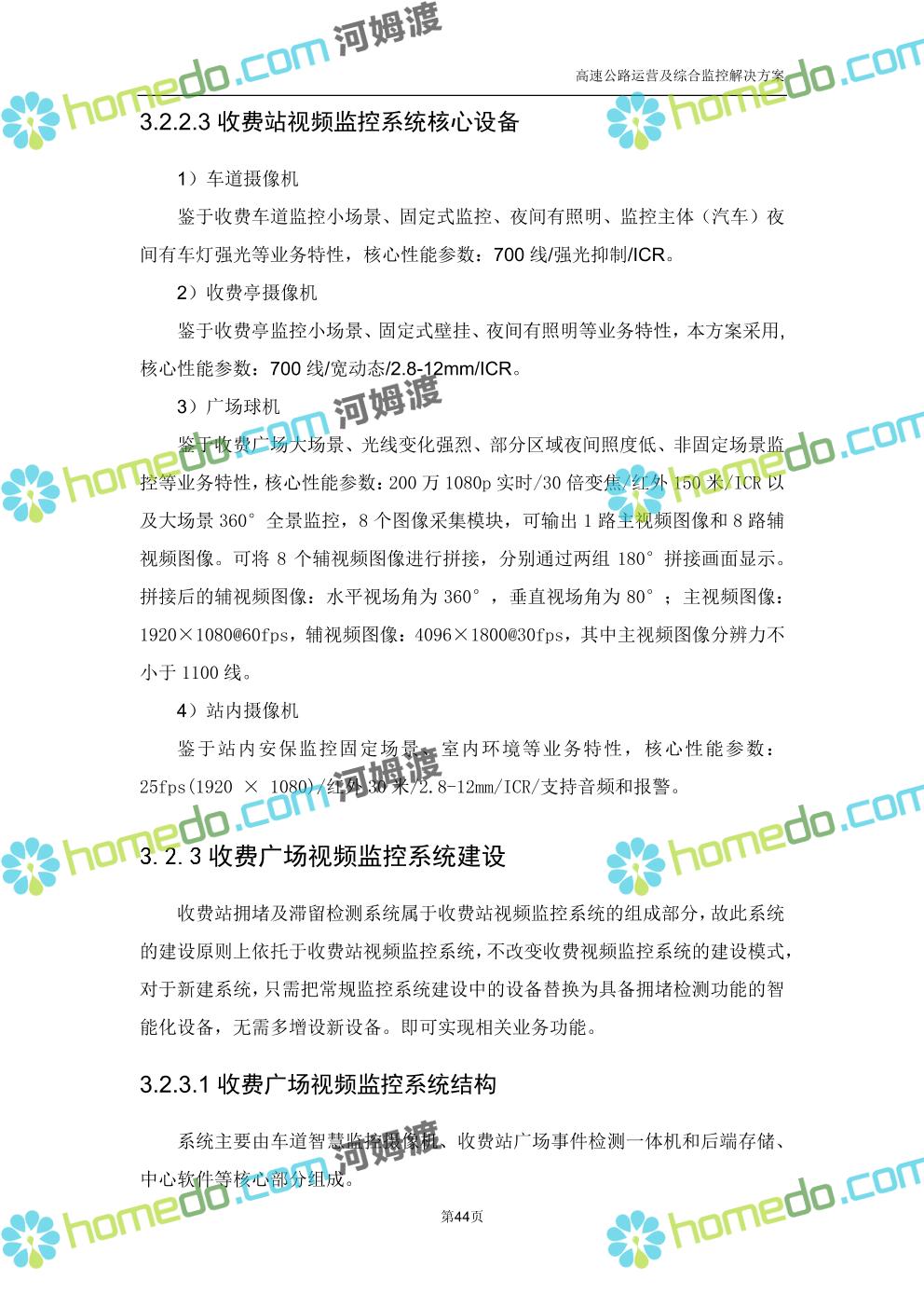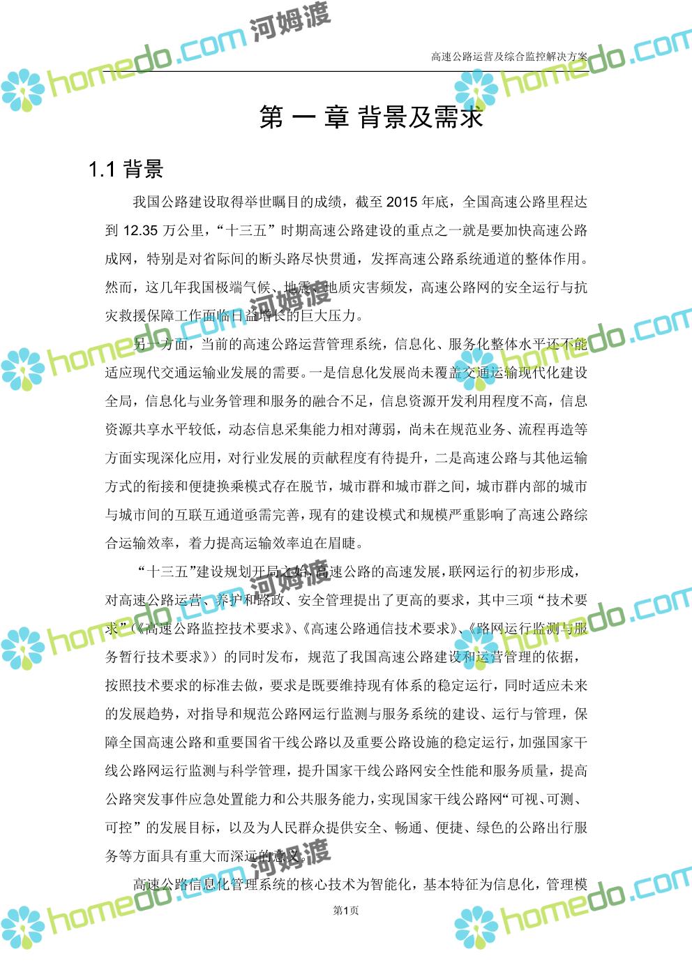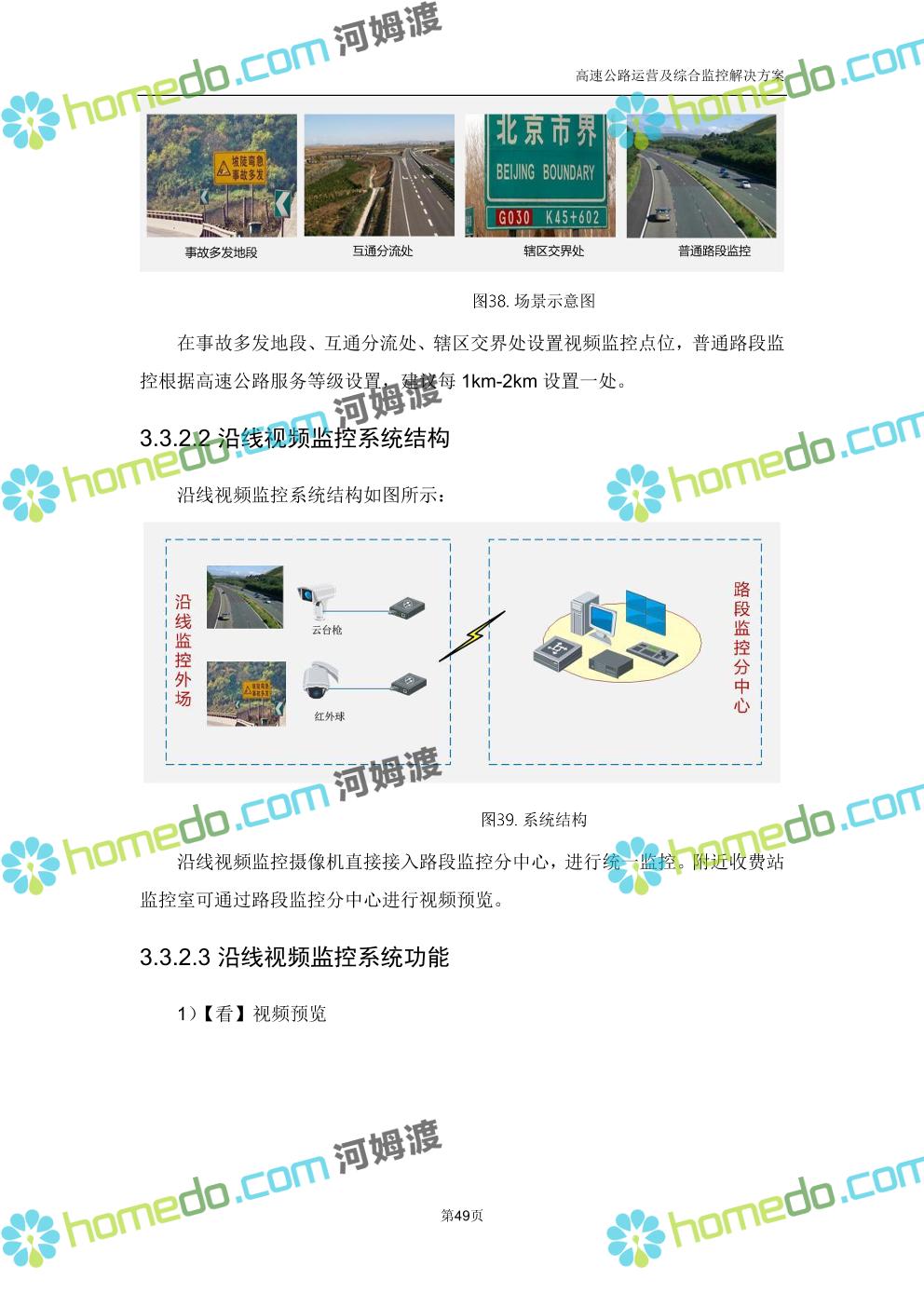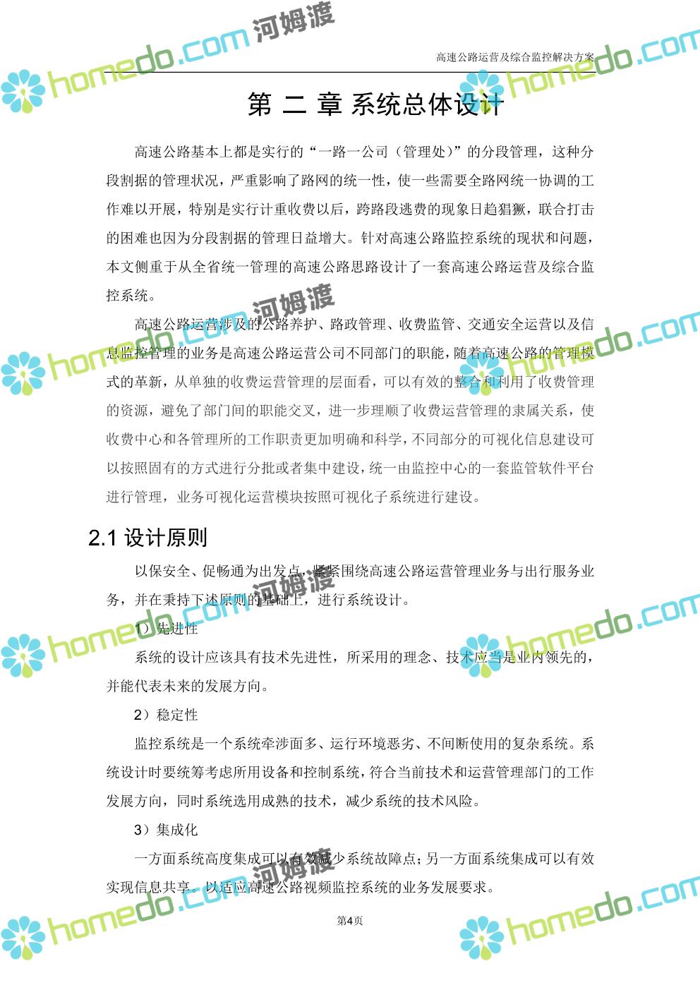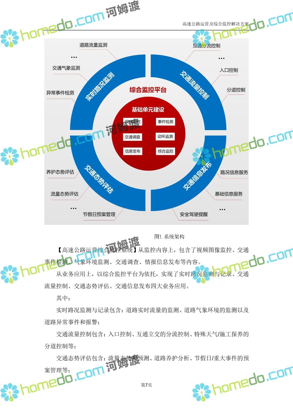 方案简介 高速公路运营可视化综合监控系统由高速公路省级监控中心、路段监控分中心、基础监控单元三级管理架构构成。一级监控中心担负系统数据存储、统计、计算、报表以及各种管控指令的下达;二级监控中心负责对采集到的数据进行分类包装和预处理,并传送至一级监控中心,当一级监控中心宕机或者故障时,二级监控中心行使一级监控中心功能,临时处理一些重要的业务和数据;三级监控中心负责检测匝道口、路面、服务区和收费口的各种数据。