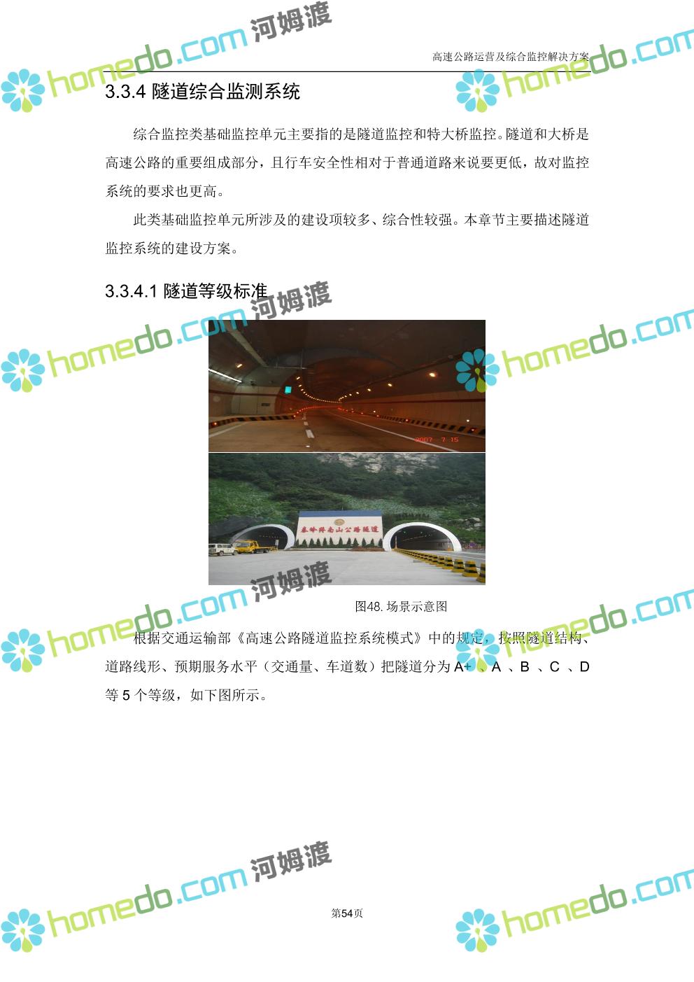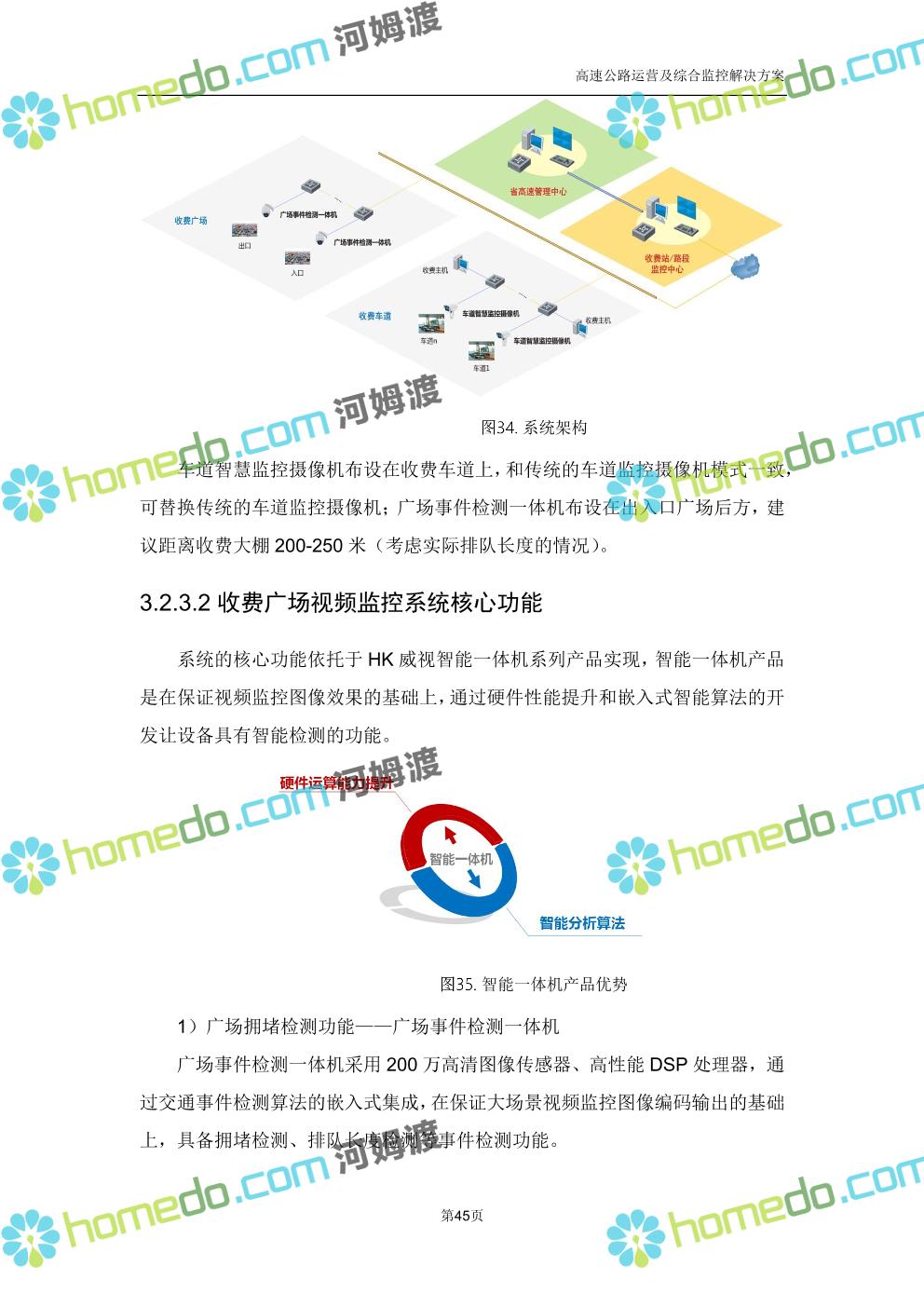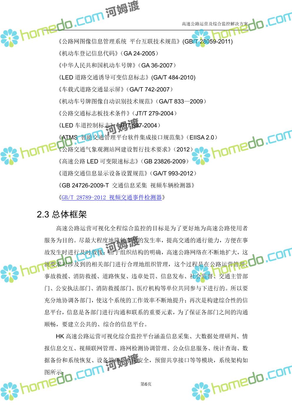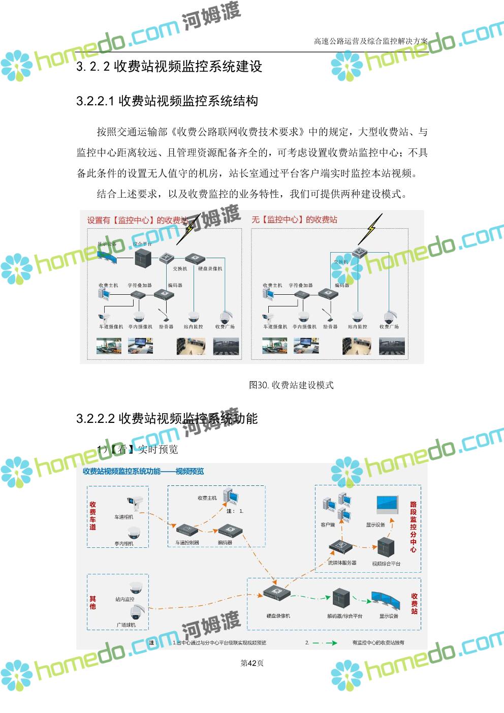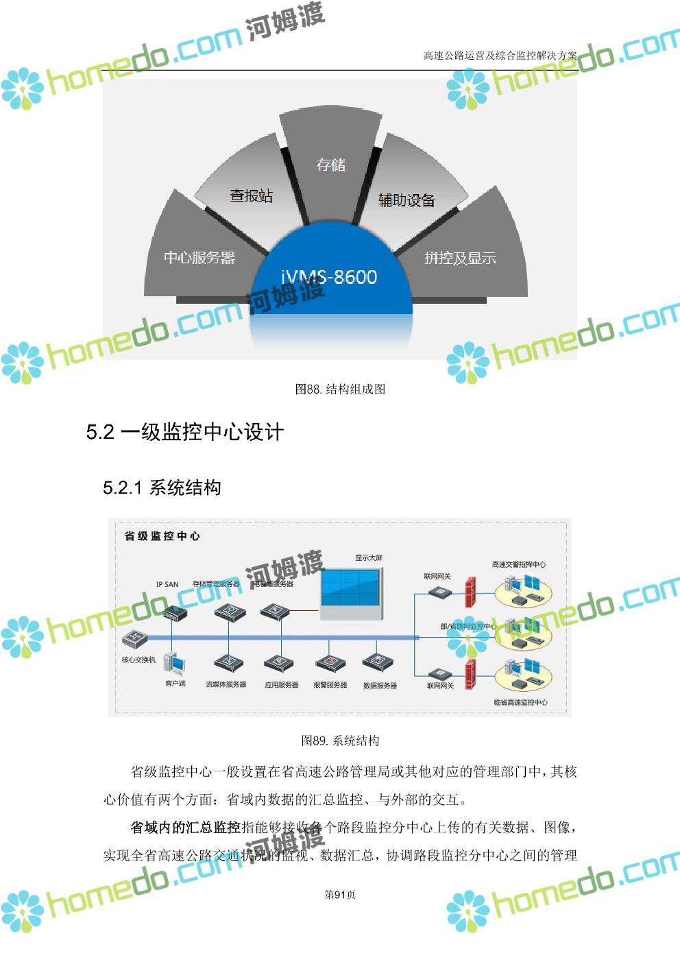 方案简介 高速公路运营可视化综合监控系统由高速公路省级监控中心、路段监控分中心、基础监控单元三级管理架构构成。一级监控中心担负系统数据存储、统计、计算、报表以及各种管控指令的下达;二级监控中心负责对采集到的数据进行分类包装和预处理,并传送至一级监控中心,当一级监控中心宕机或者故障时,二级监控中心行使一级监控中心功能,临时处理一些重要的业务和数据;三级监控中心负责检测匝道口、路面、服务区和收费口的各种数据。