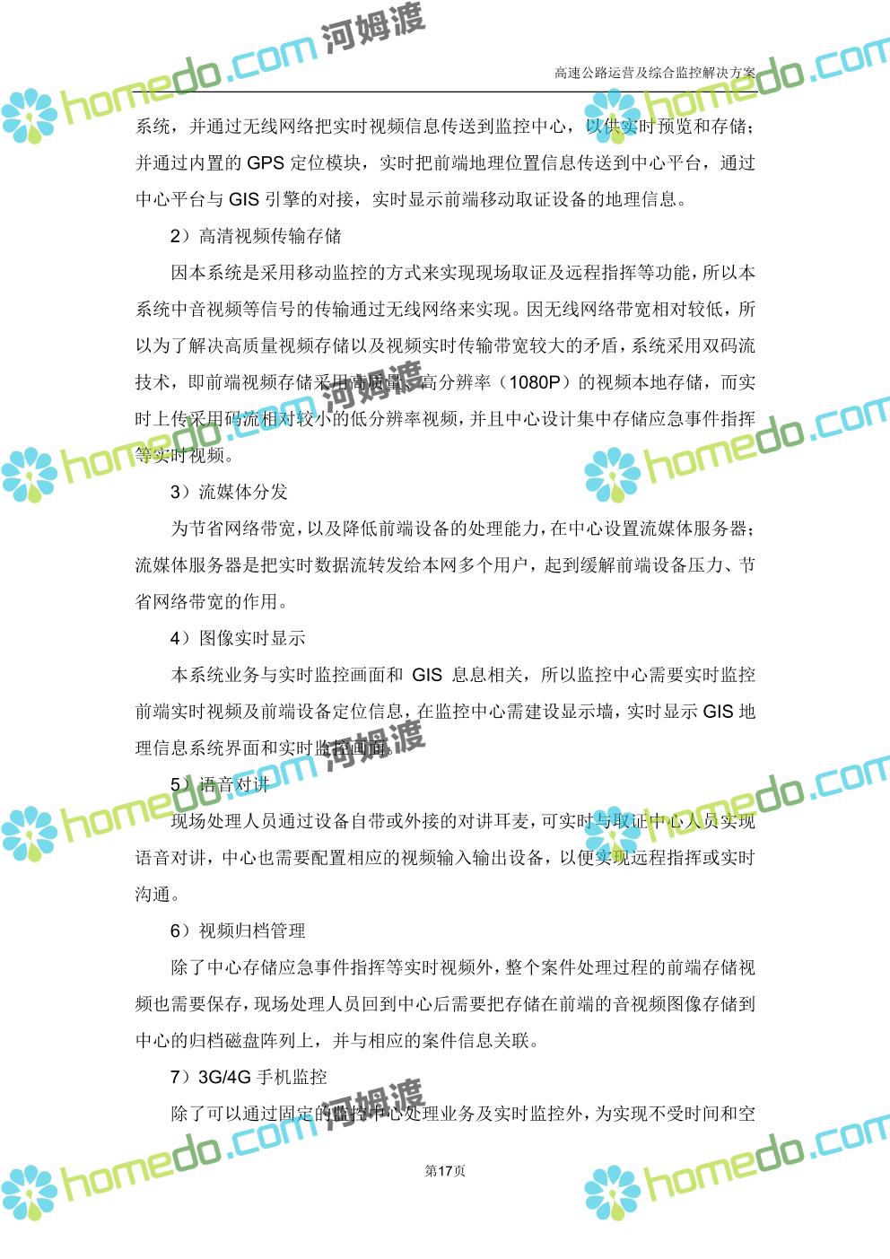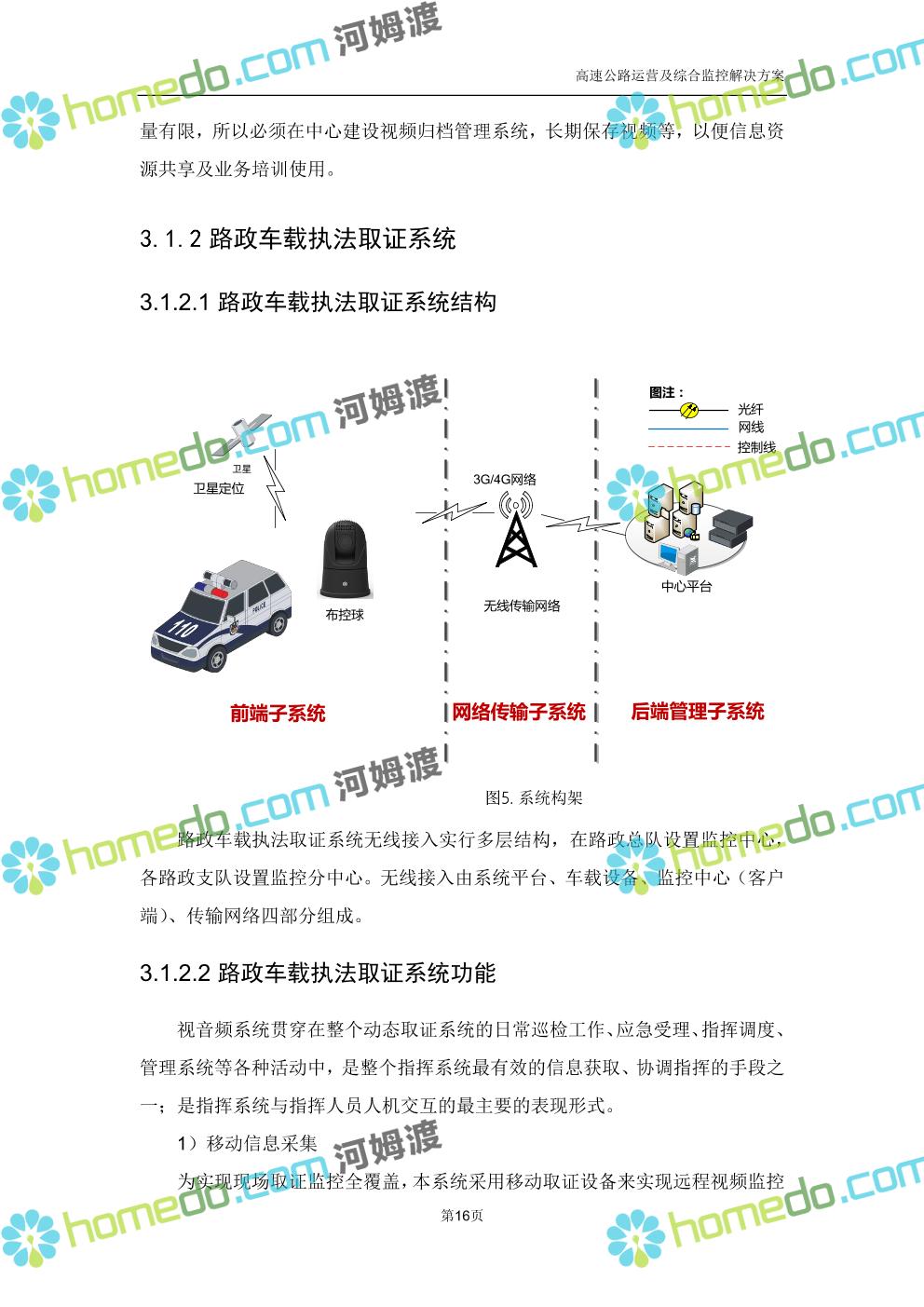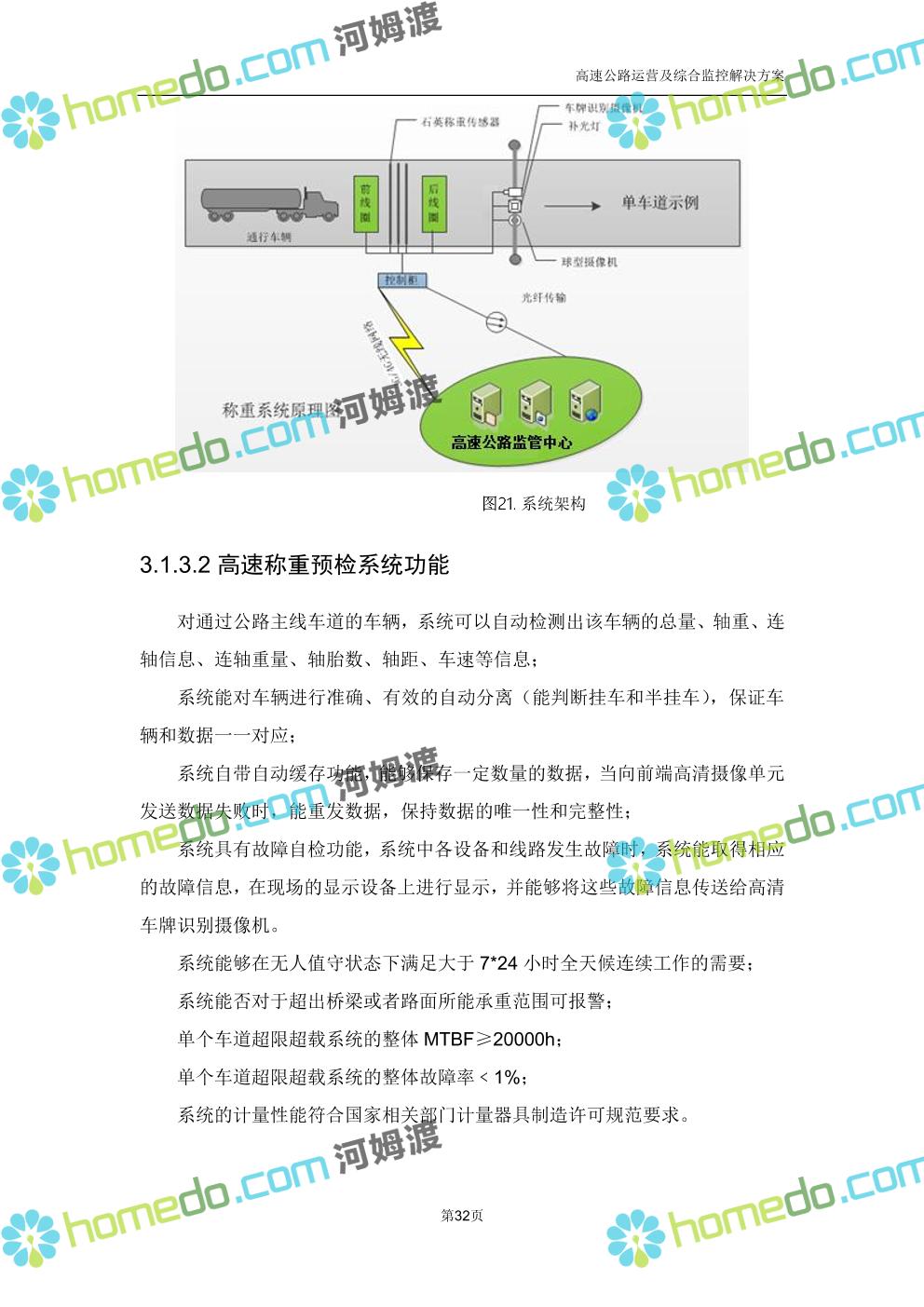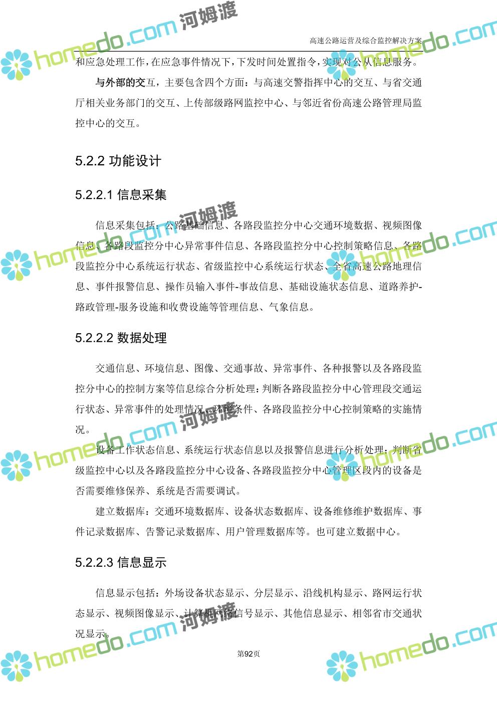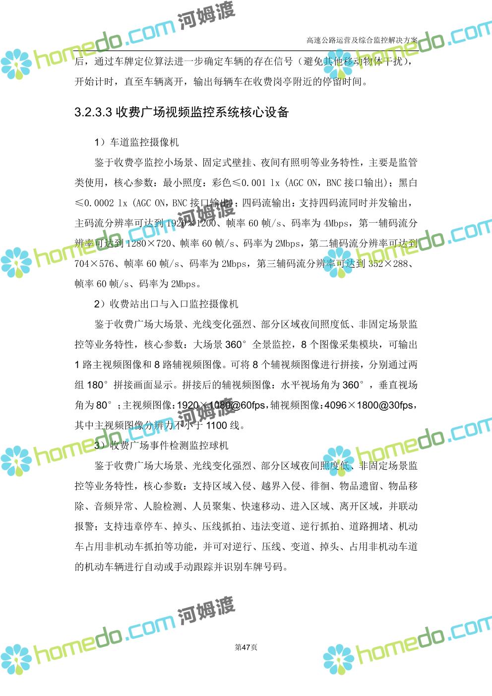 方案简介 高速公路运营可视化综合监控系统由高速公路省级监控中心、路段监控分中心、基础监控单元三级管理架构构成。一级监控中心担负系统数据存储、统计、计算、报表以及各种管控指令的下达;二级监控中心负责对采集到的数据进行分类包装和预处理,并传送至一级监控中心,当一级监控中心宕机或者故障时,二级监控中心行使一级监控中心功能,临时处理一些重要的业务和数据;三级监控中心负责检测匝道口、路面、服务区和收费口的各种数据。