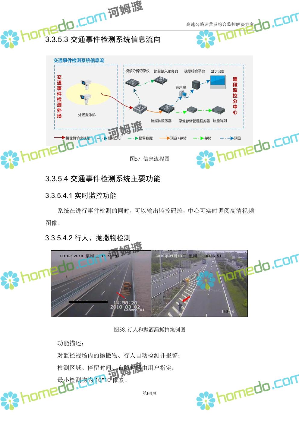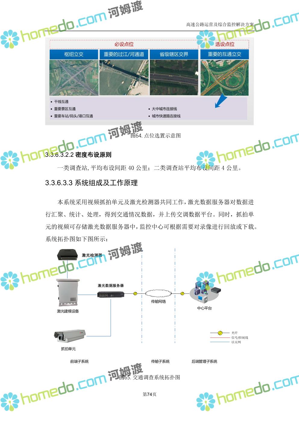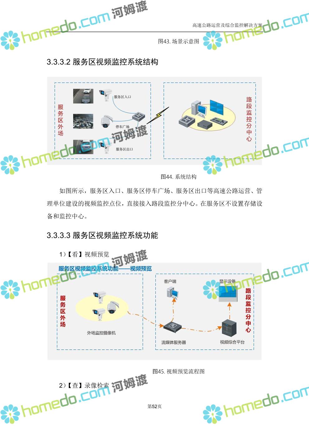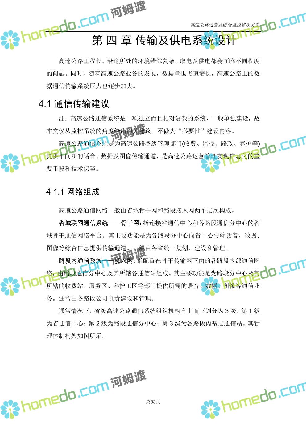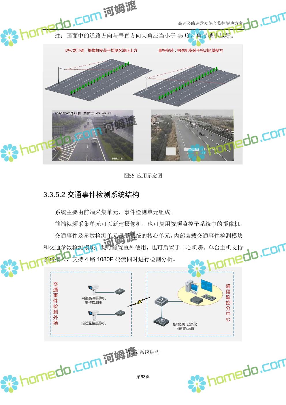 方案简介 高速公路运营可视化综合监控系统由高速公路省级监控中心、路段监控分中心、基础监控单元三级管理架构构成。一级监控中心担负系统数据存储、统计、计算、报表以及各种管控指令的下达;二级监控中心负责对采集到的数据进行分类包装和预处理,并传送至一级监控中心,当一级监控中心宕机或者故障时,二级监控中心行使一级监控中心功能,临时处理一些重要的业务和数据;三级监控中心负责检测匝道口、路面、服务区和收费口的各种数据。