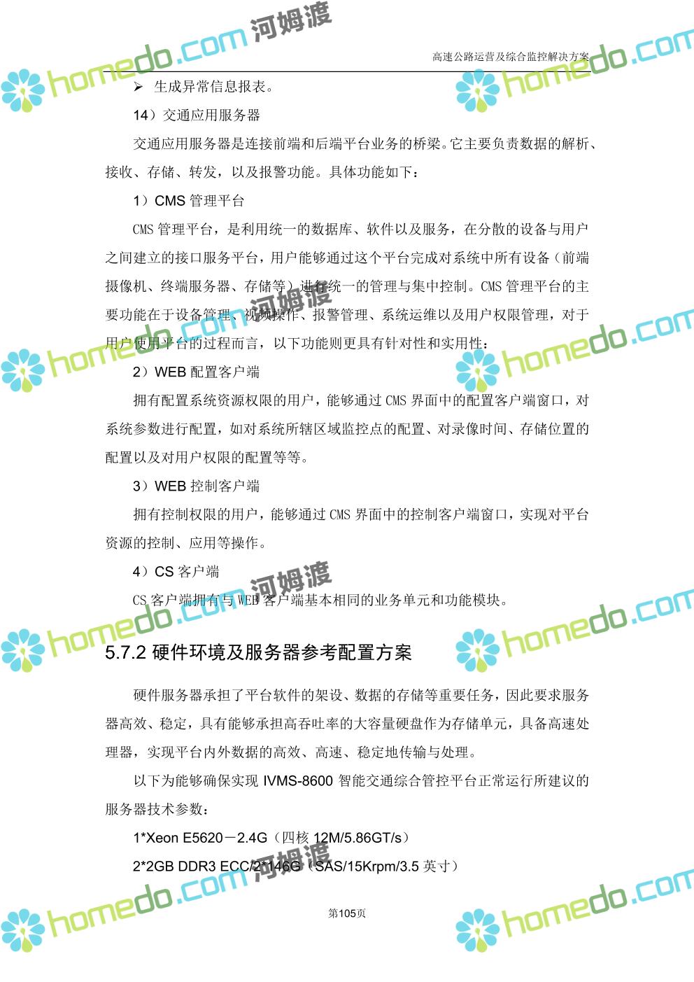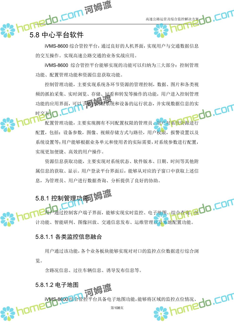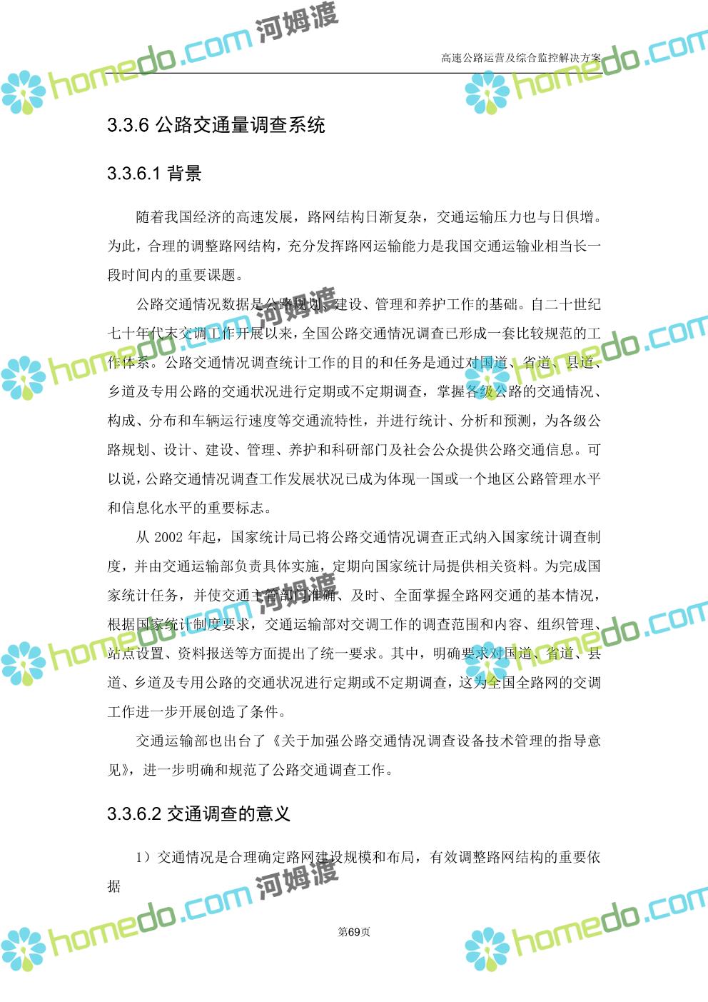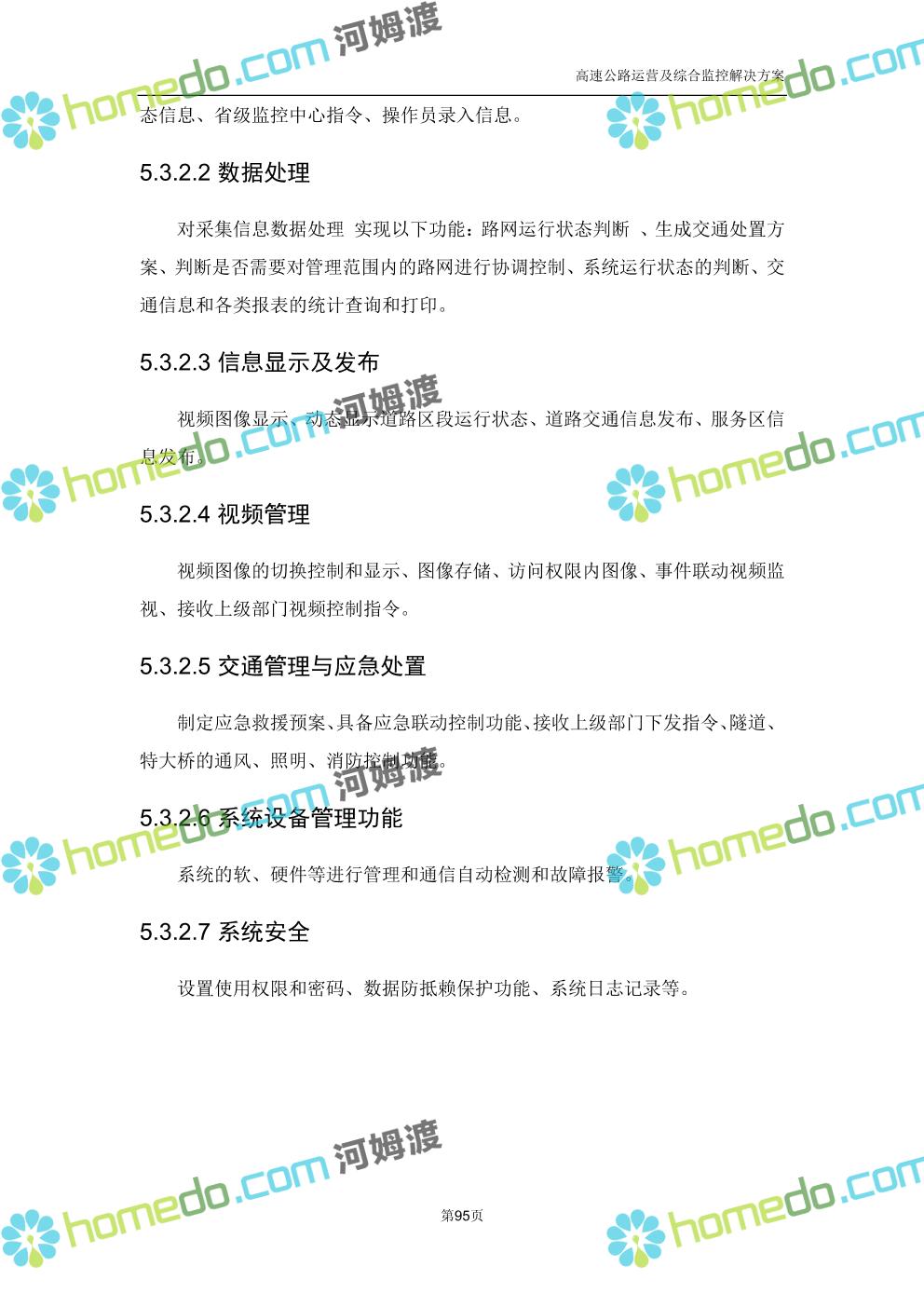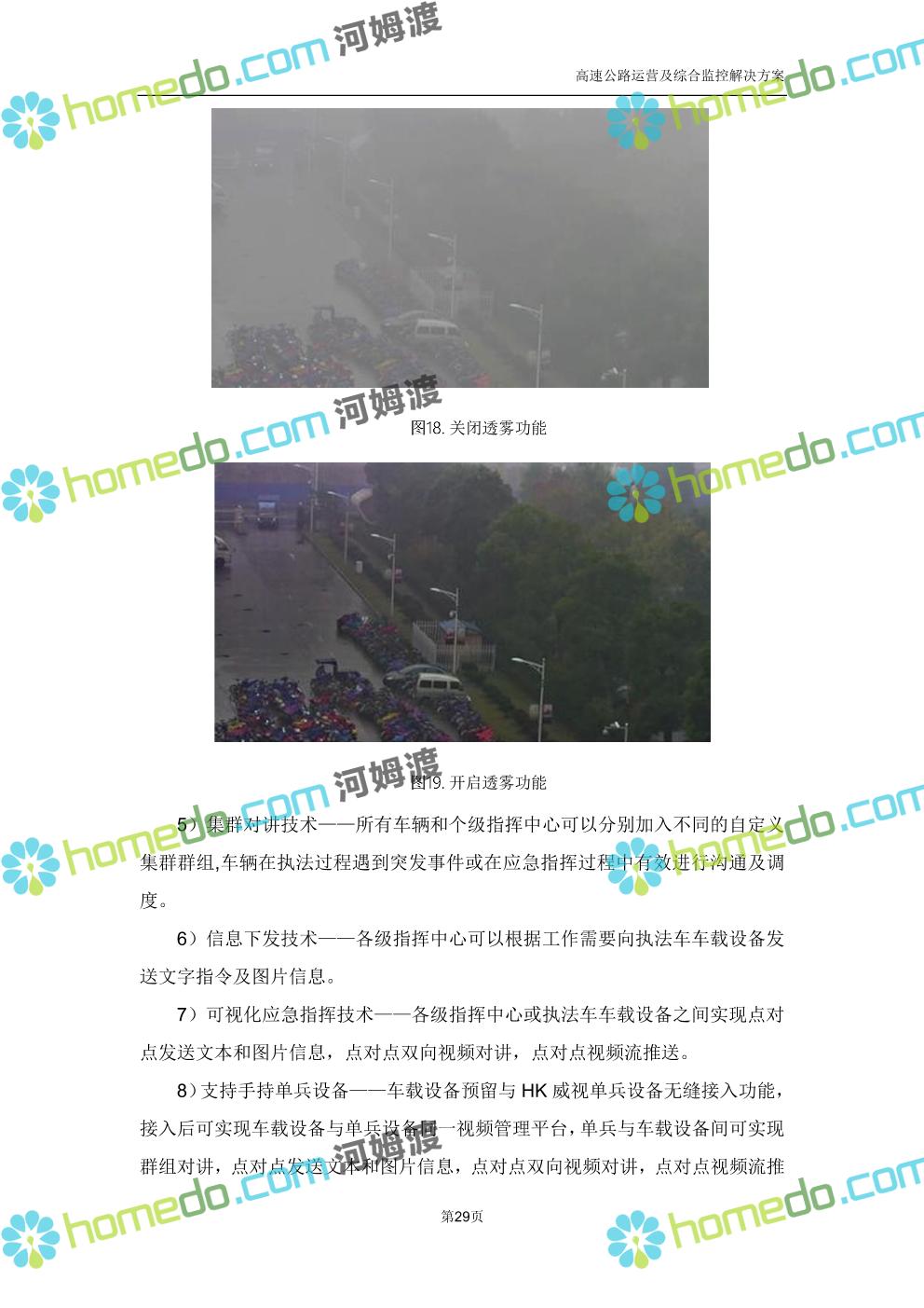 方案简介 高速公路运营可视化综合监控系统由高速公路省级监控中心、路段监控分中心、基础监控单元三级管理架构构成。一级监控中心担负系统数据存储、统计、计算、报表以及各种管控指令的下达;二级监控中心负责对采集到的数据进行分类包装和预处理,并传送至一级监控中心,当一级监控中心宕机或者故障时,二级监控中心行使一级监控中心功能,临时处理一些重要的业务和数据;三级监控中心负责检测匝道口、路面、服务区和收费口的各种数据。