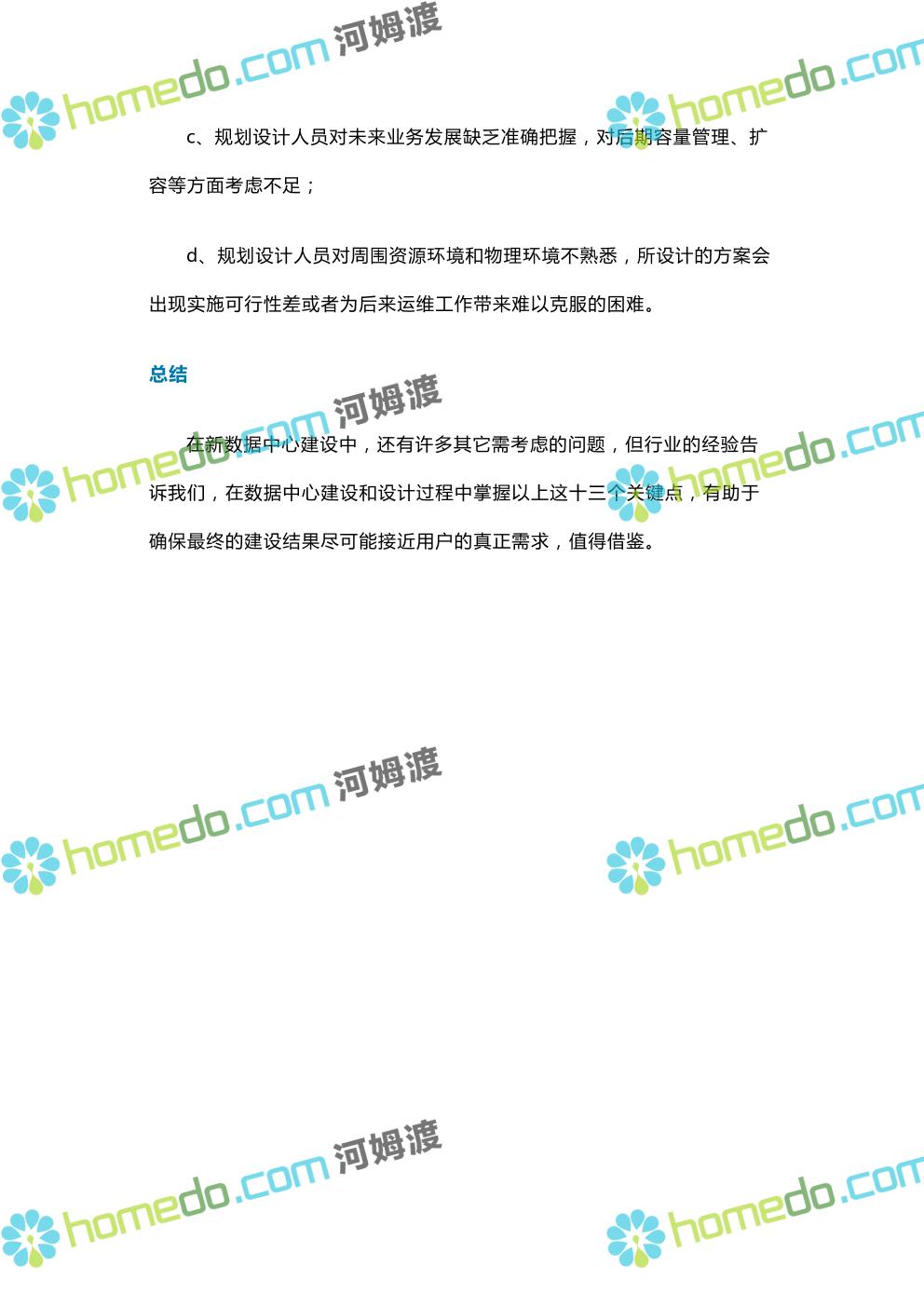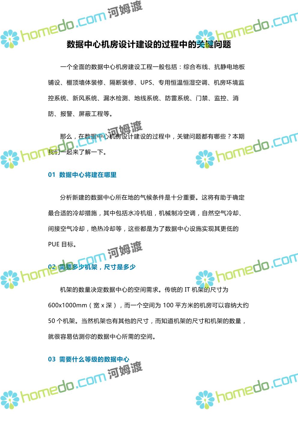 方案简介 一个全面的数据中心机房建设工程一般包括:综合布线、抗静电地板铺设、棚顶墙体装修、隔断装修、UPS、专用恒温恒湿空调、机房环境监控系统、新风系统、漏水检测、地线系统、防雷系统、门禁、监控、消防、报警、屏蔽工程等