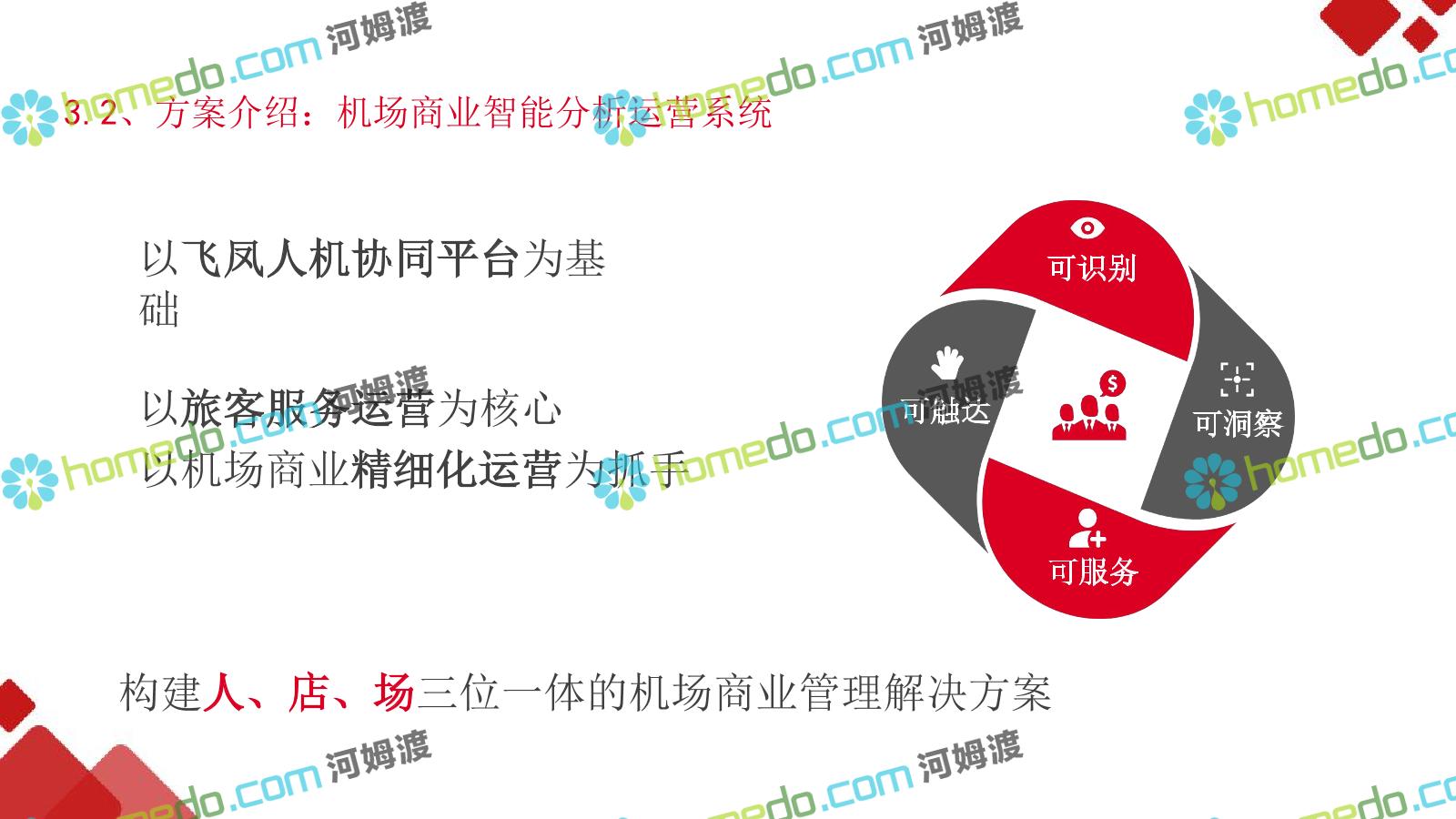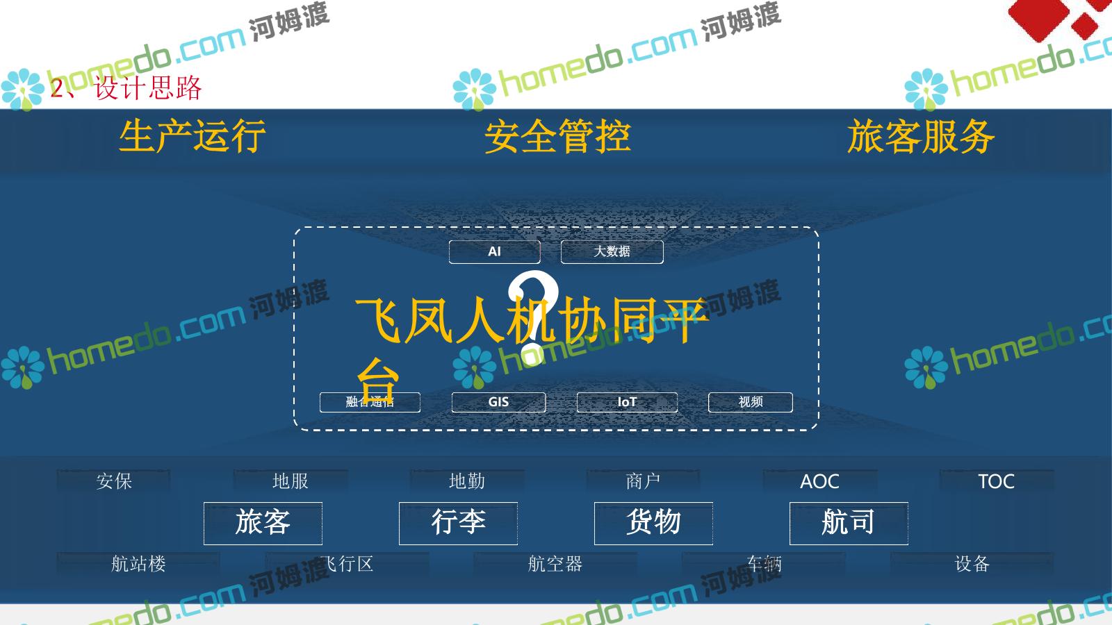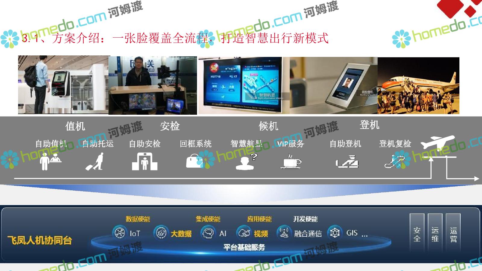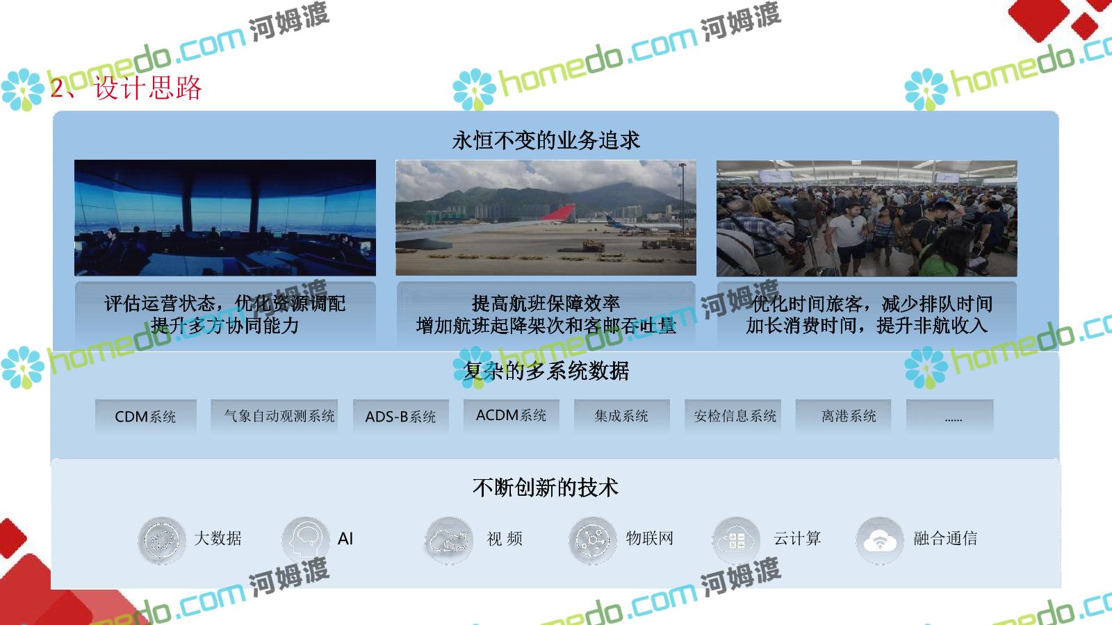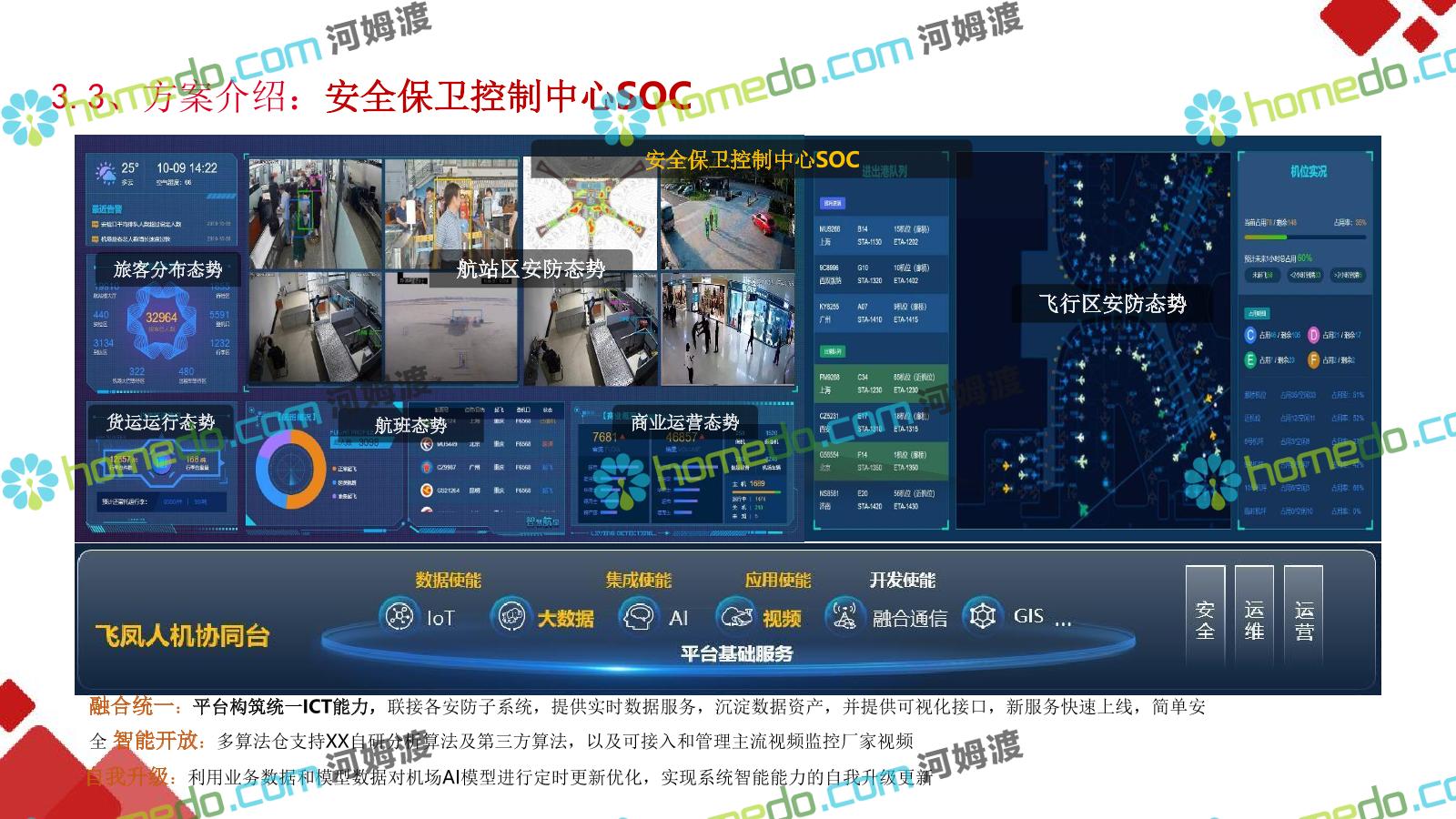 方案简介 机场需要一个拥有高度大数据能力、智能化能力和物联网化能力的”智能运营服务体系”;用于满足机场系统面广、监控对象多样、业 务场景复杂的特点下各系统关联集成、统一管理、智能决策,帮助机场从互联网时代向物联网智能化时代进化。