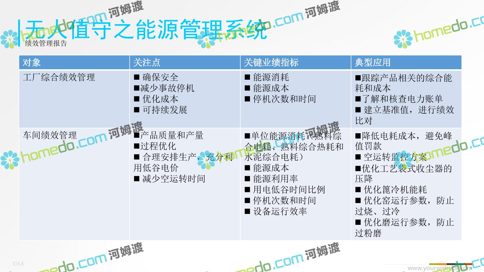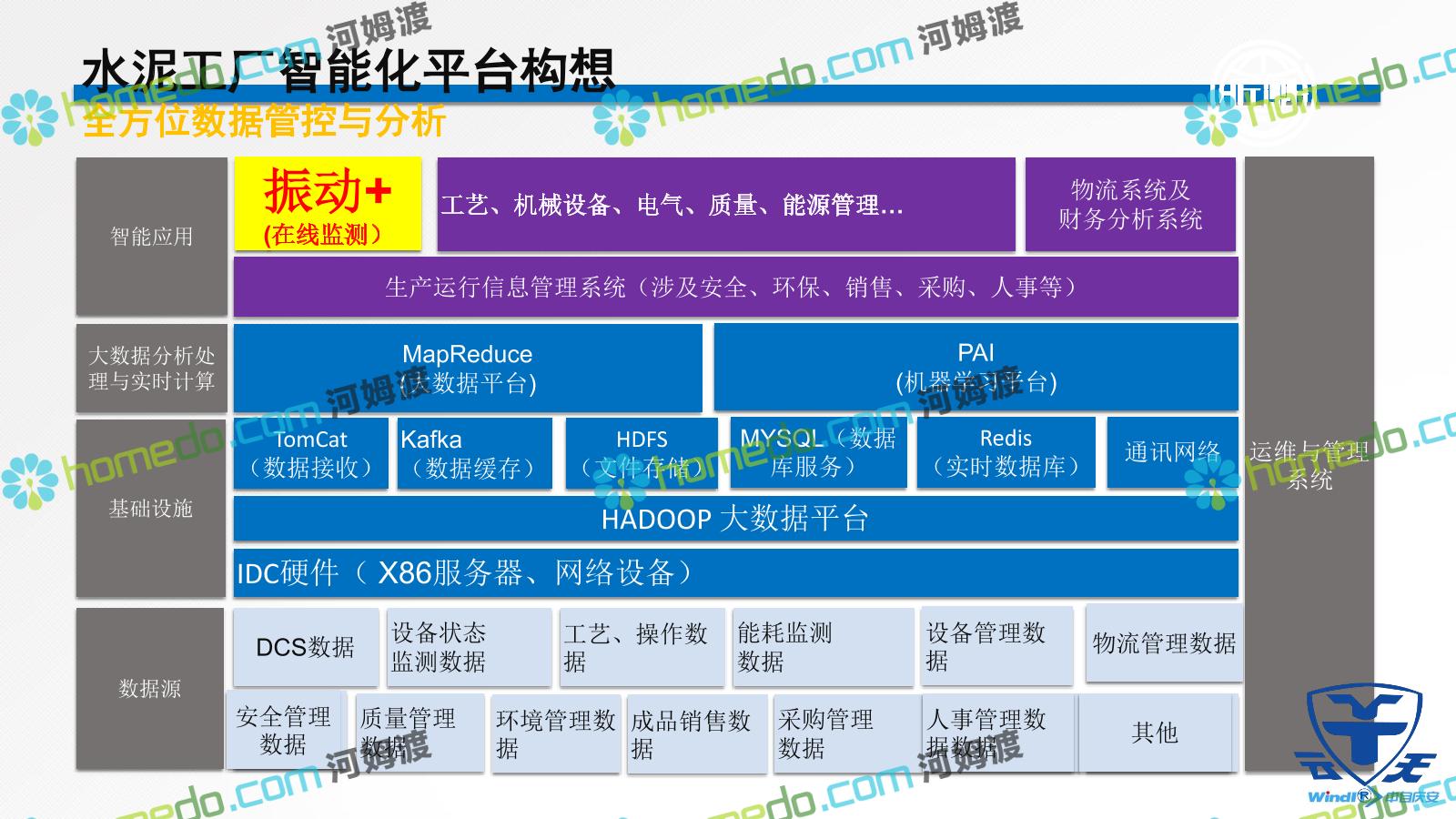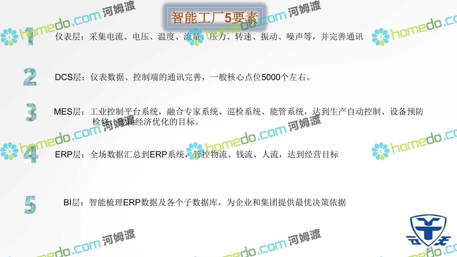 方案简介 智能工厂5要素 仪表层:采集电流、电压、温度、流量、压力、转速、振动、噪声等,并完善通讯 DCS层:仪表数据、控制端的通讯完善,一般核心点位5000个左右。 MES层:工业控制平台系统,融合专家系统、巡检系统、能管系统,达到生产自动控制、设备预防检修、能耗经济优化的目标。 ERP层:全场数据汇总到ERP系统,管控物流、钱流、人流,达到经营目标 BI层:智能梳理ERP数据及各个子数据库,为企业和集团提供最优决策依据