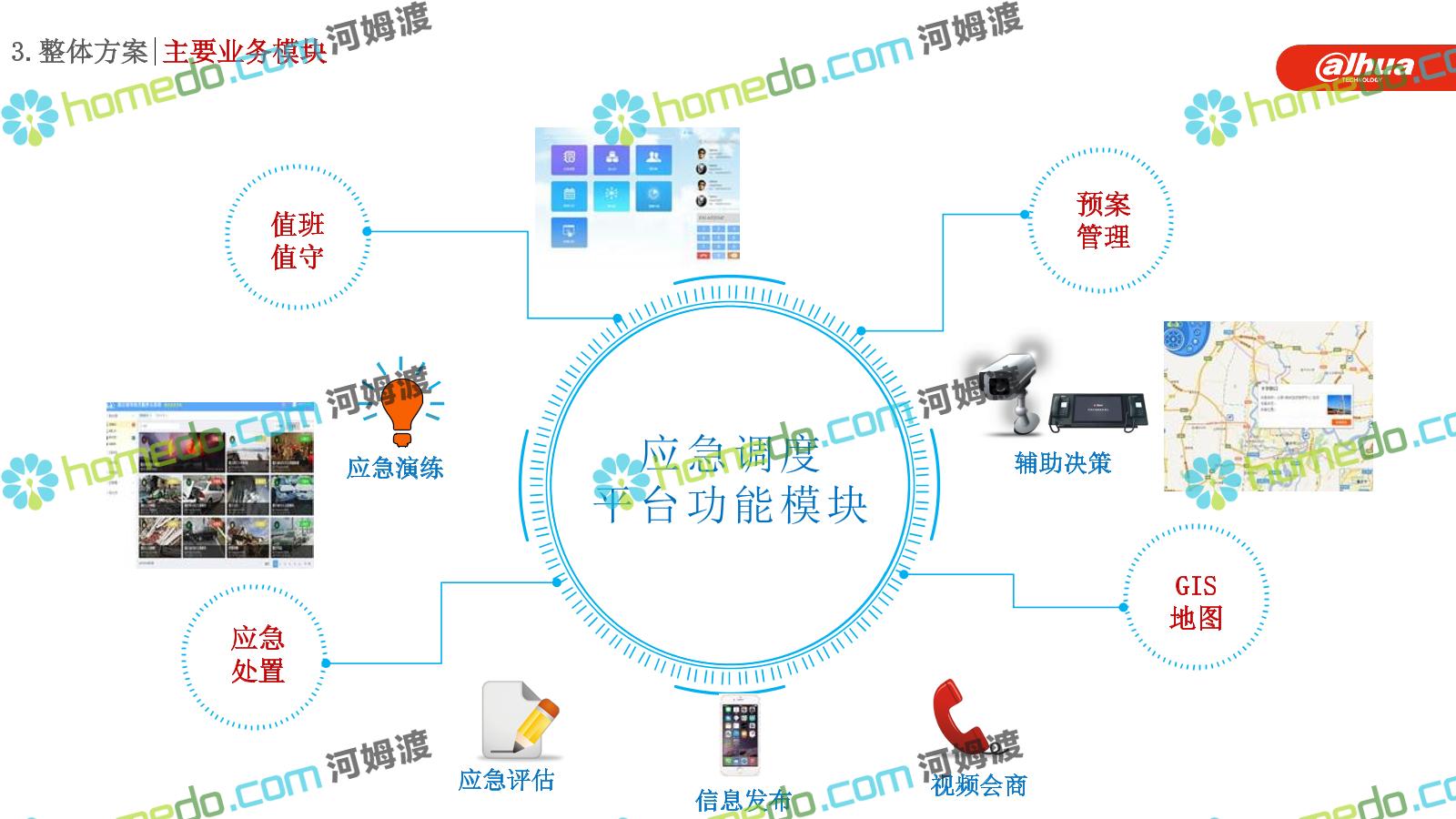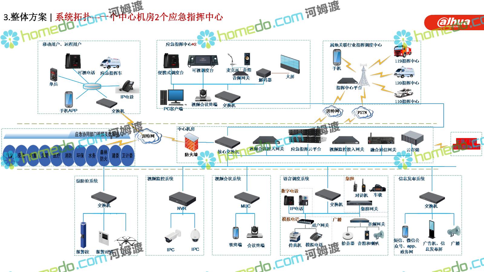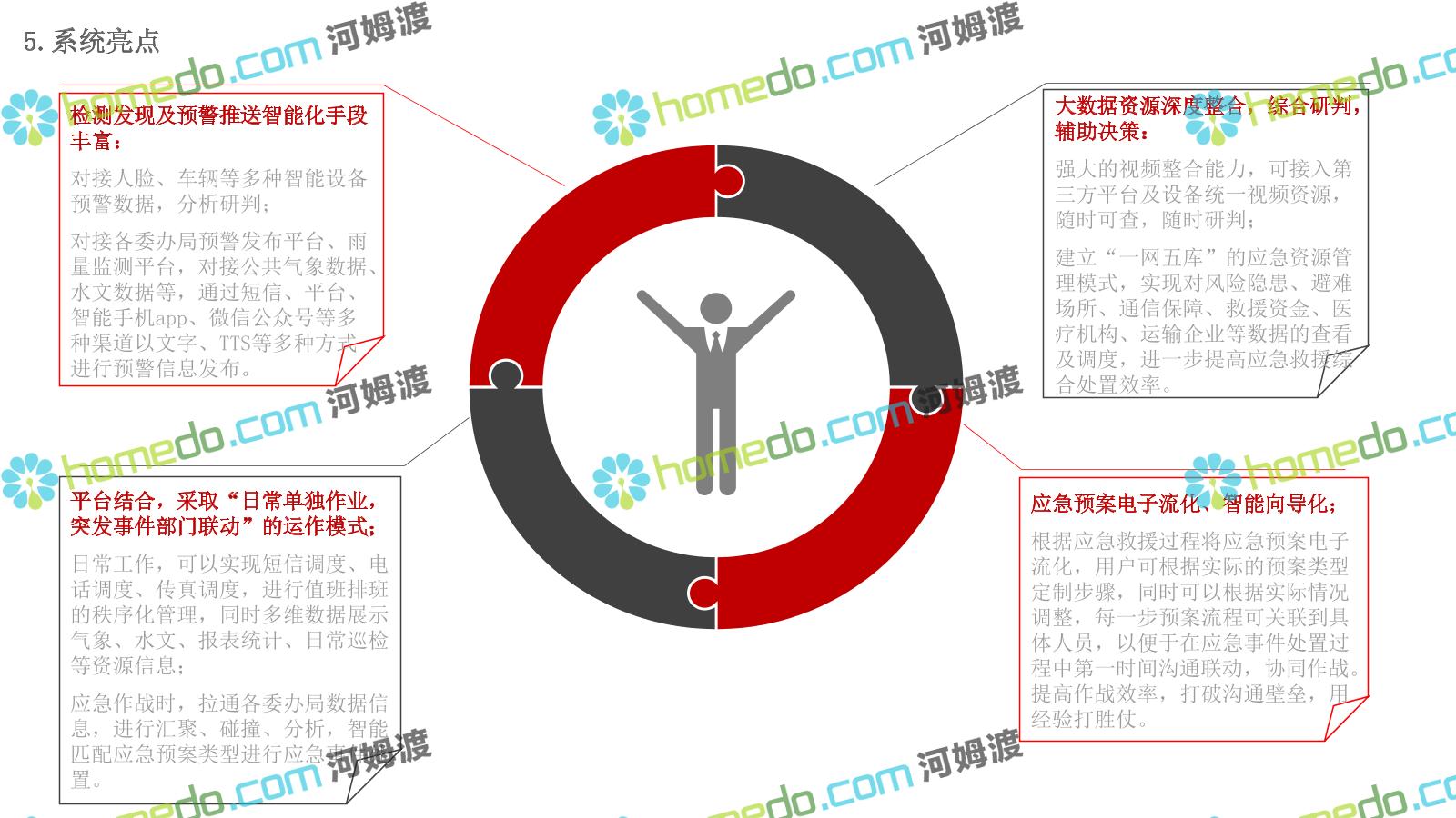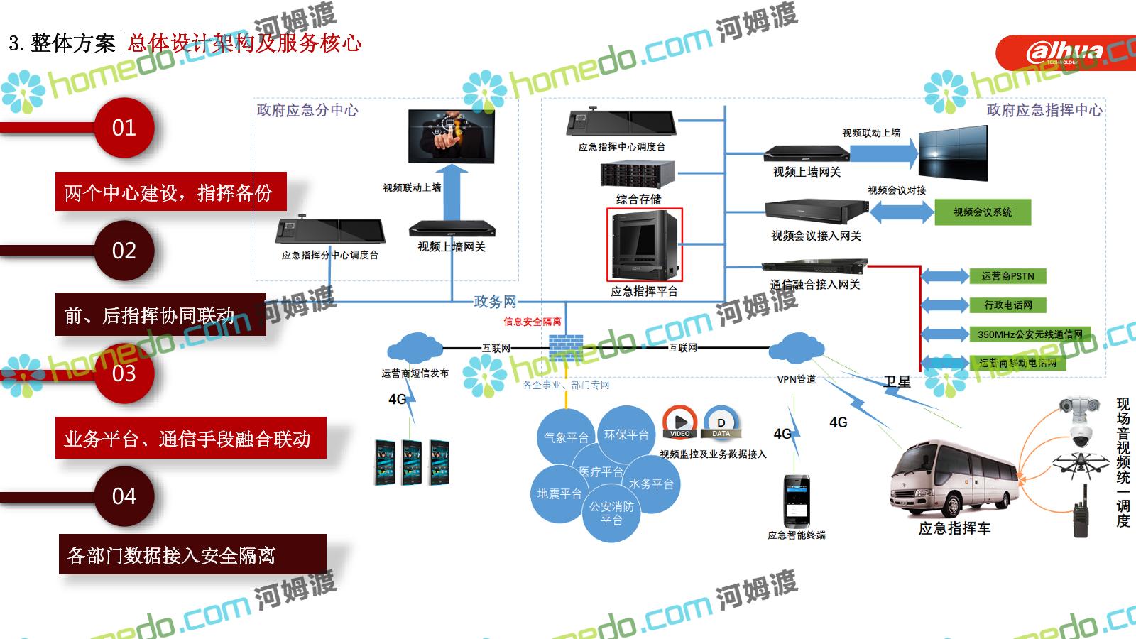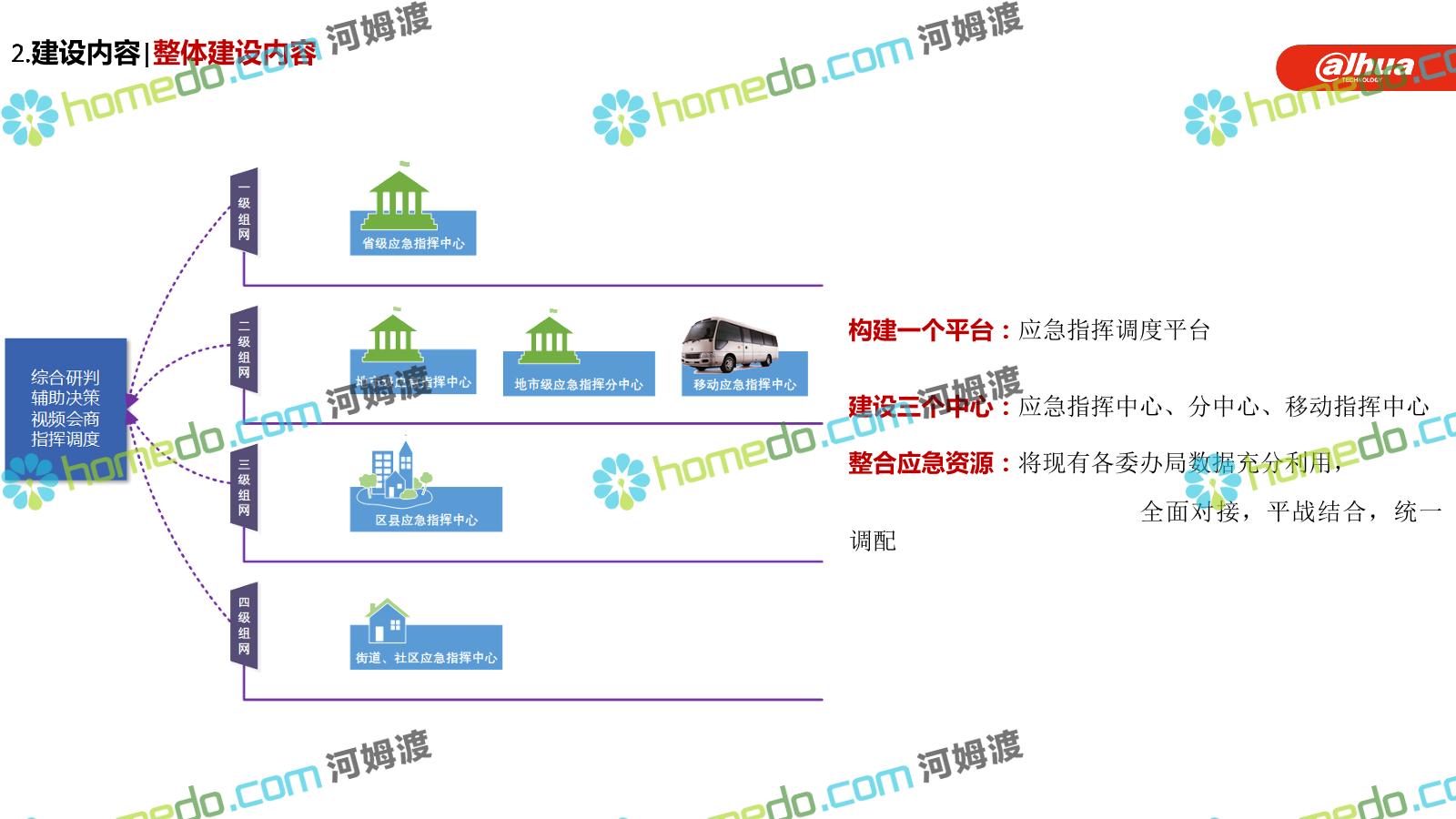 方案简介 构建一个平台:应急指挥调度平台 建设三个中心:应急指挥中心、分中心、移动指挥中心 整合应急资源:将现有各委办局数据充分利用, 全面对接,平战结合,统一调配