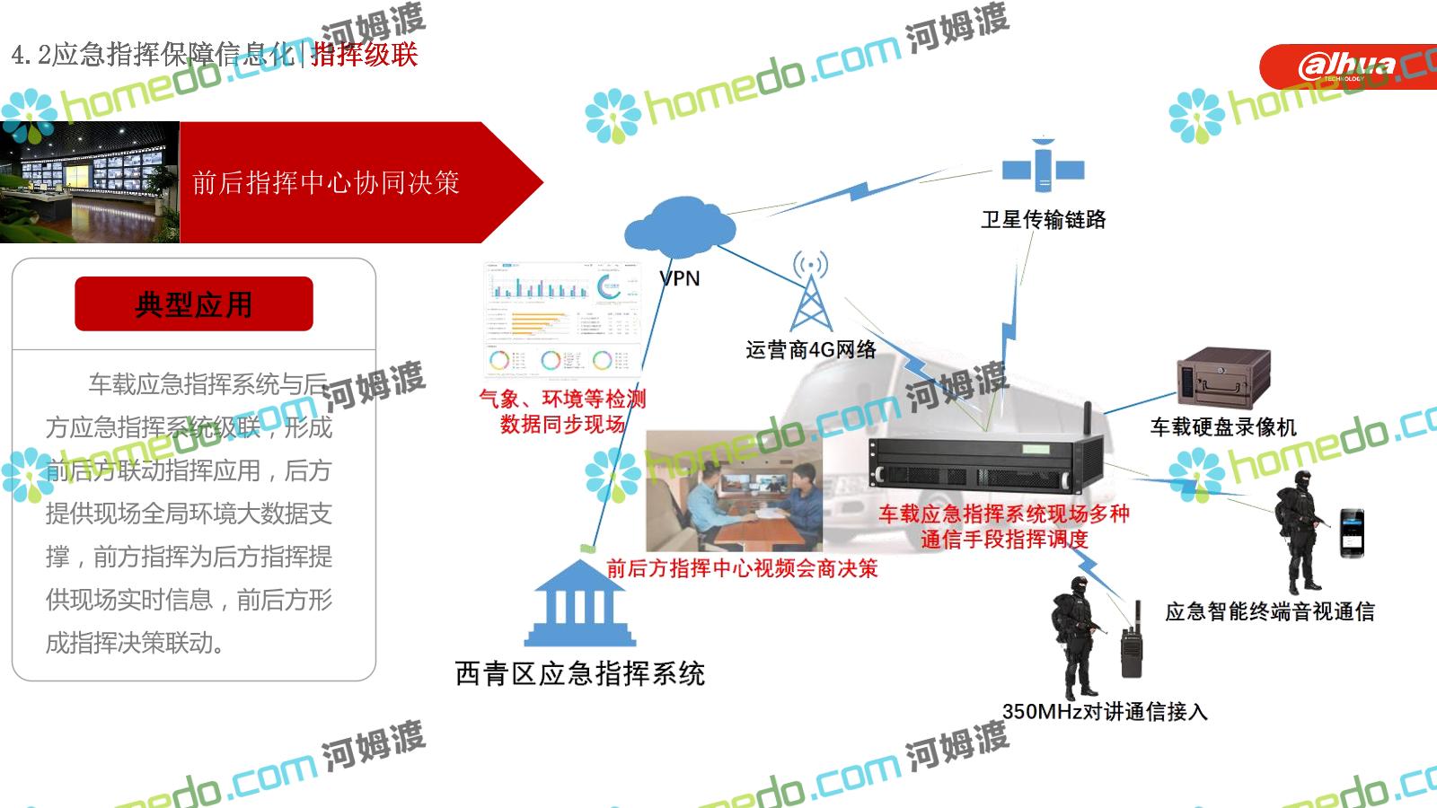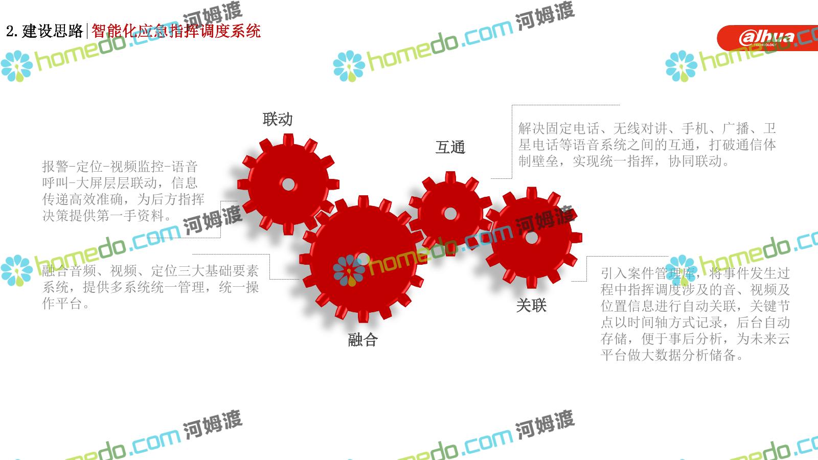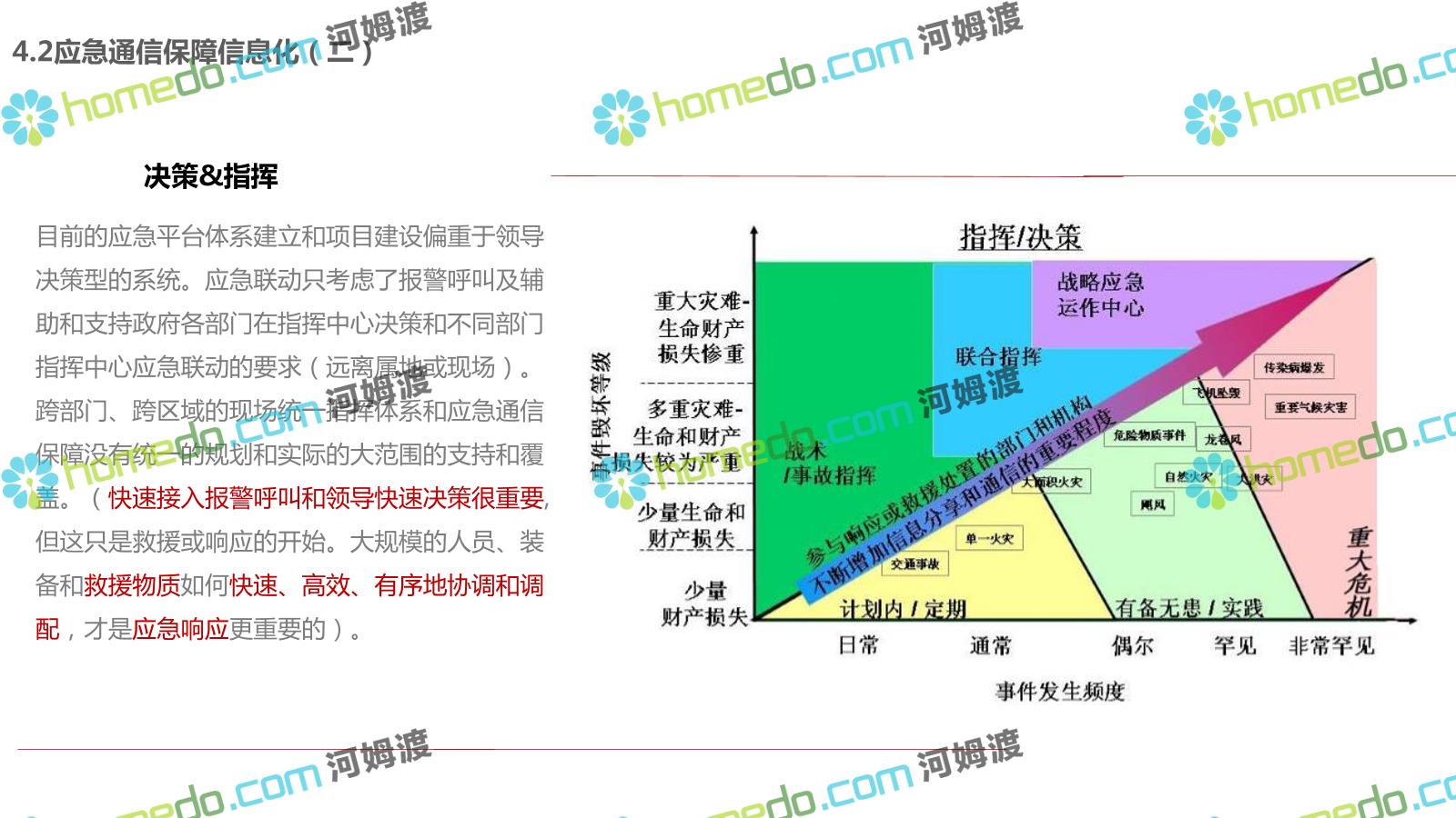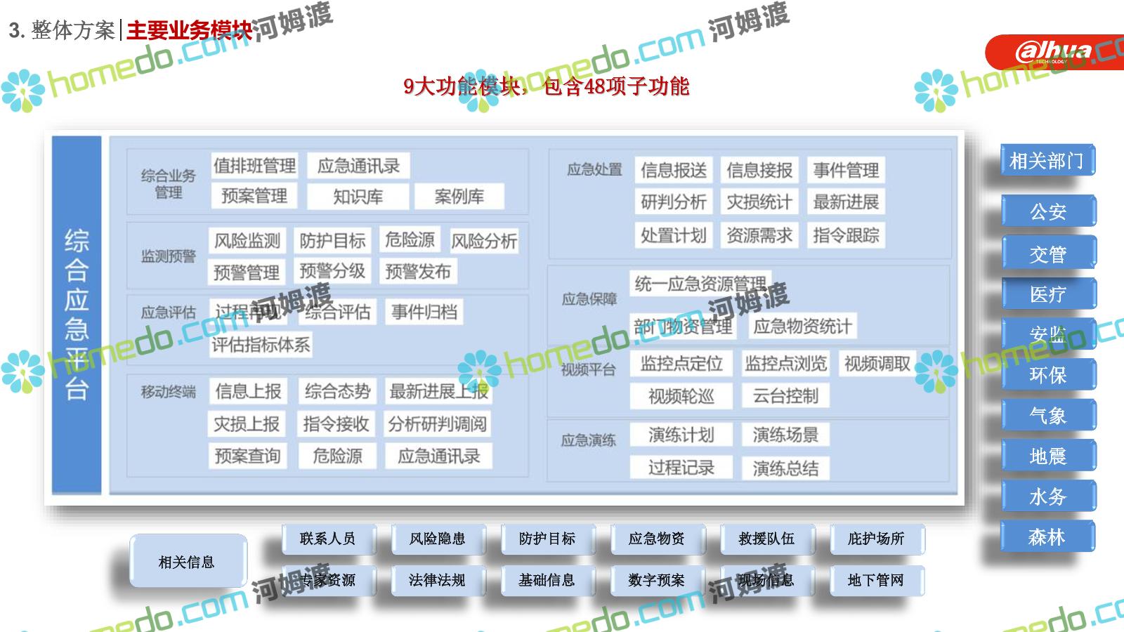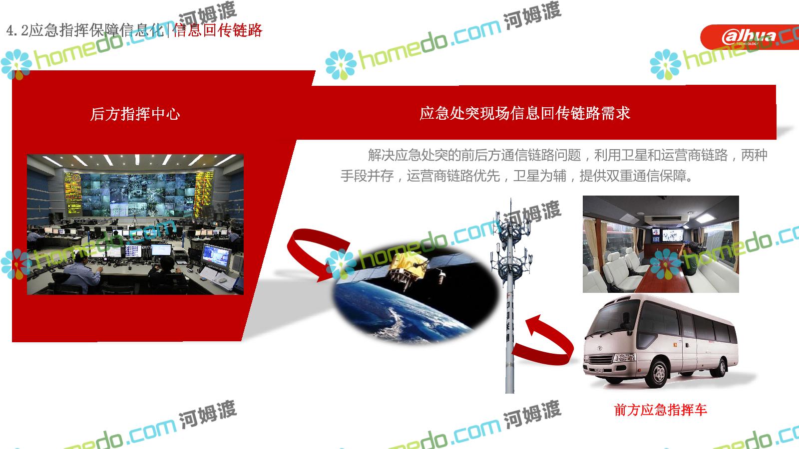 方案简介 构建一个平台:应急指挥调度平台 建设三个中心:应急指挥中心、分中心、移动指挥中心 整合应急资源:将现有各委办局数据充分利用, 全面对接,平战结合,统一调配