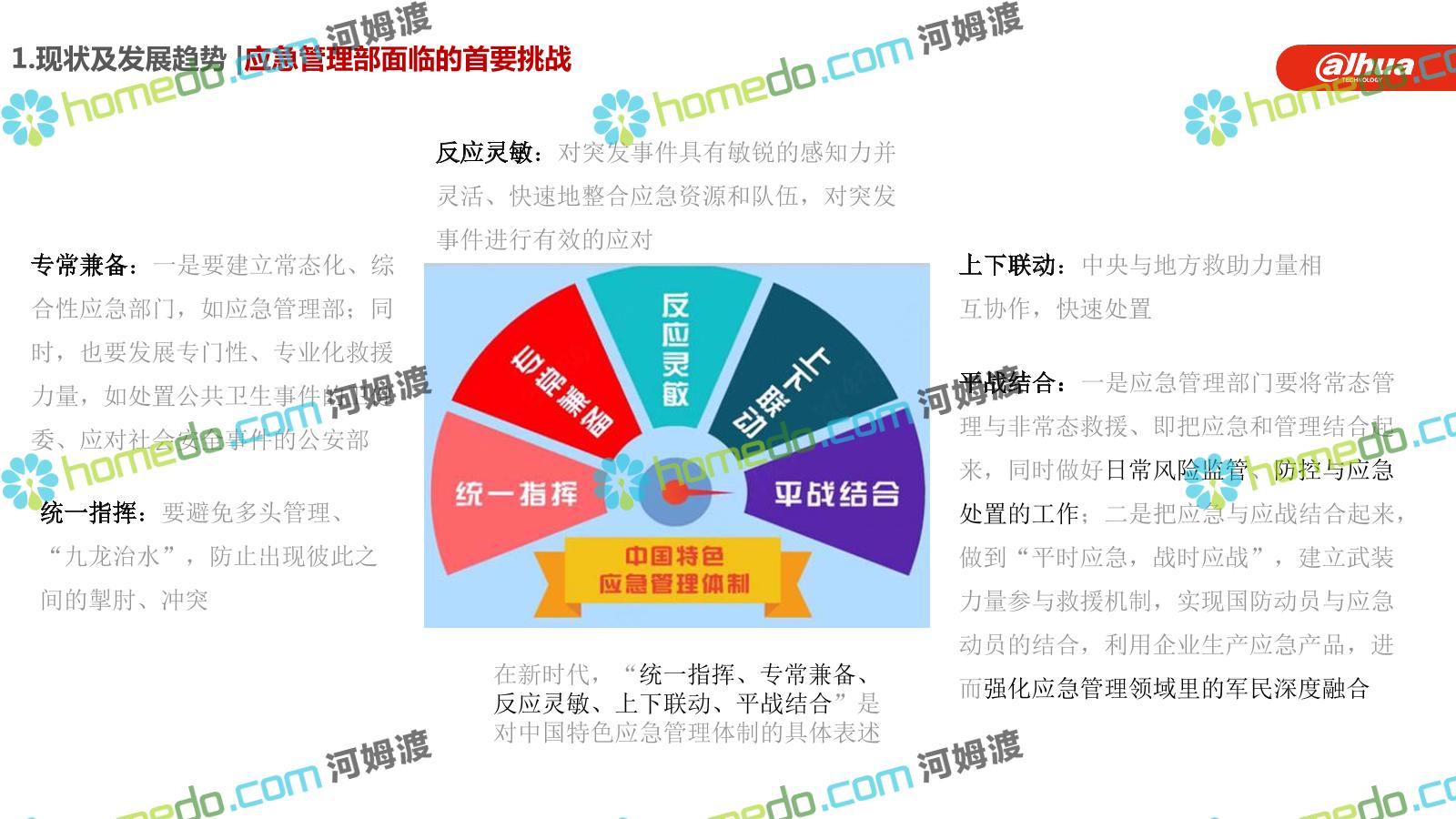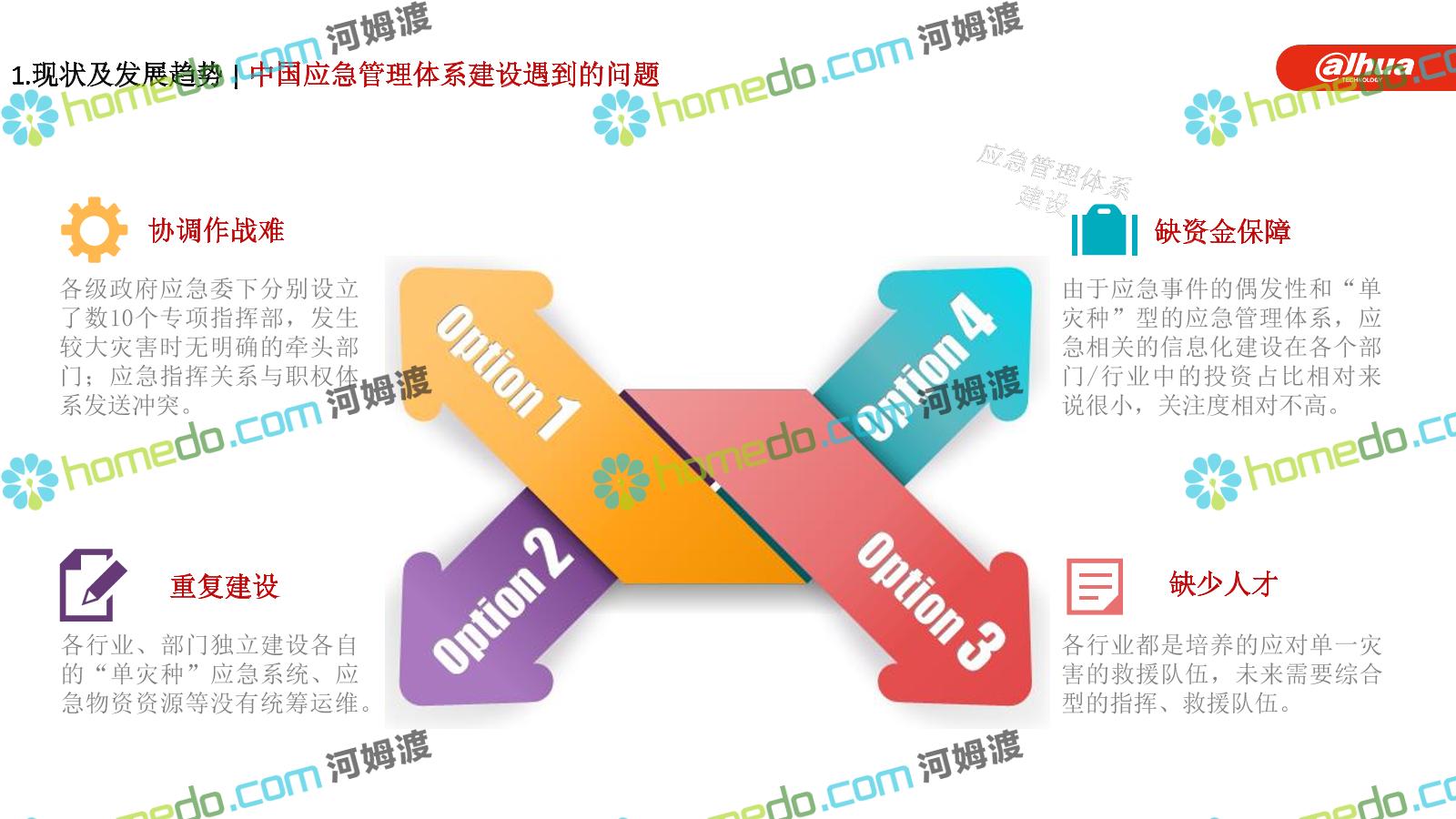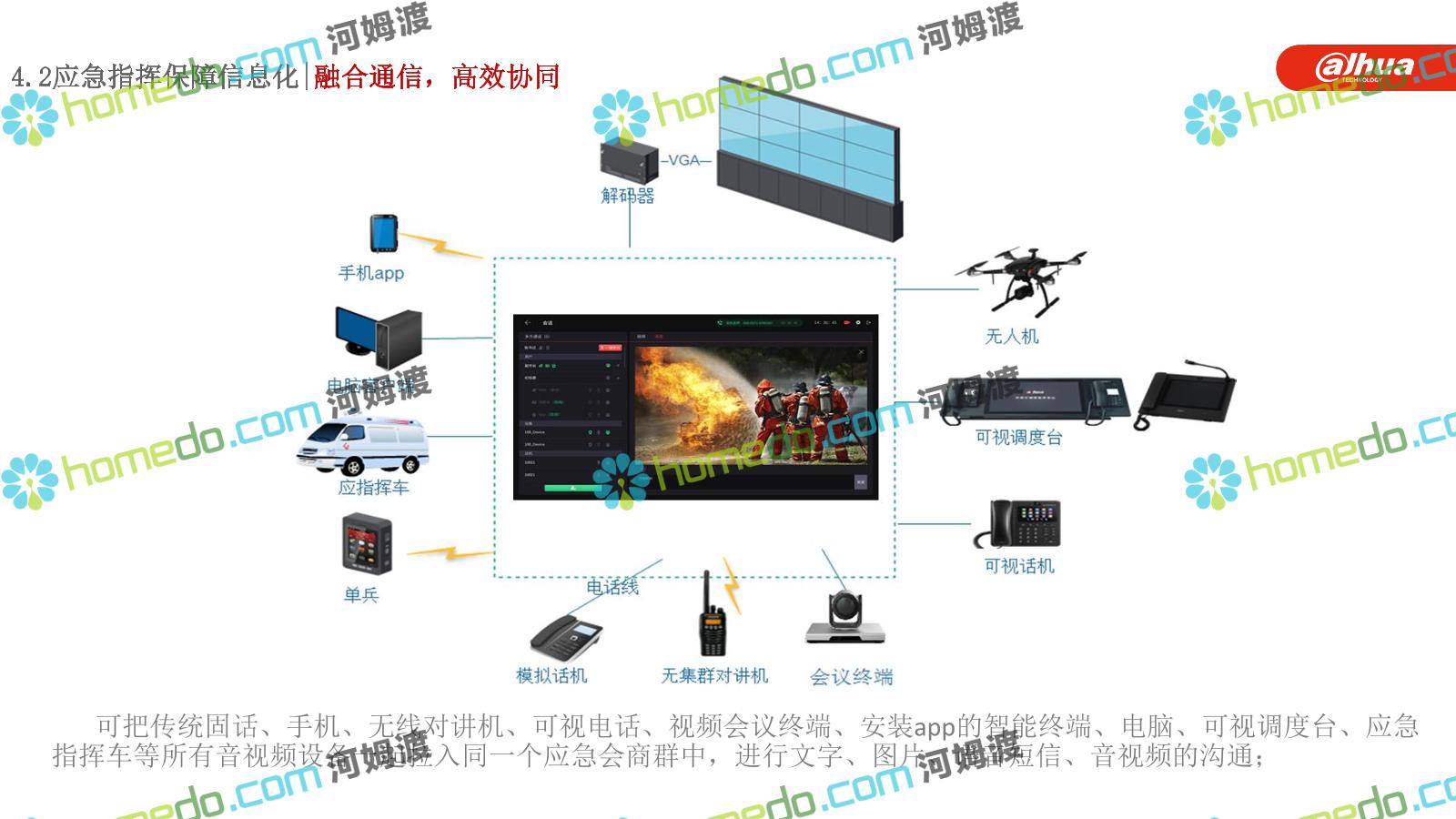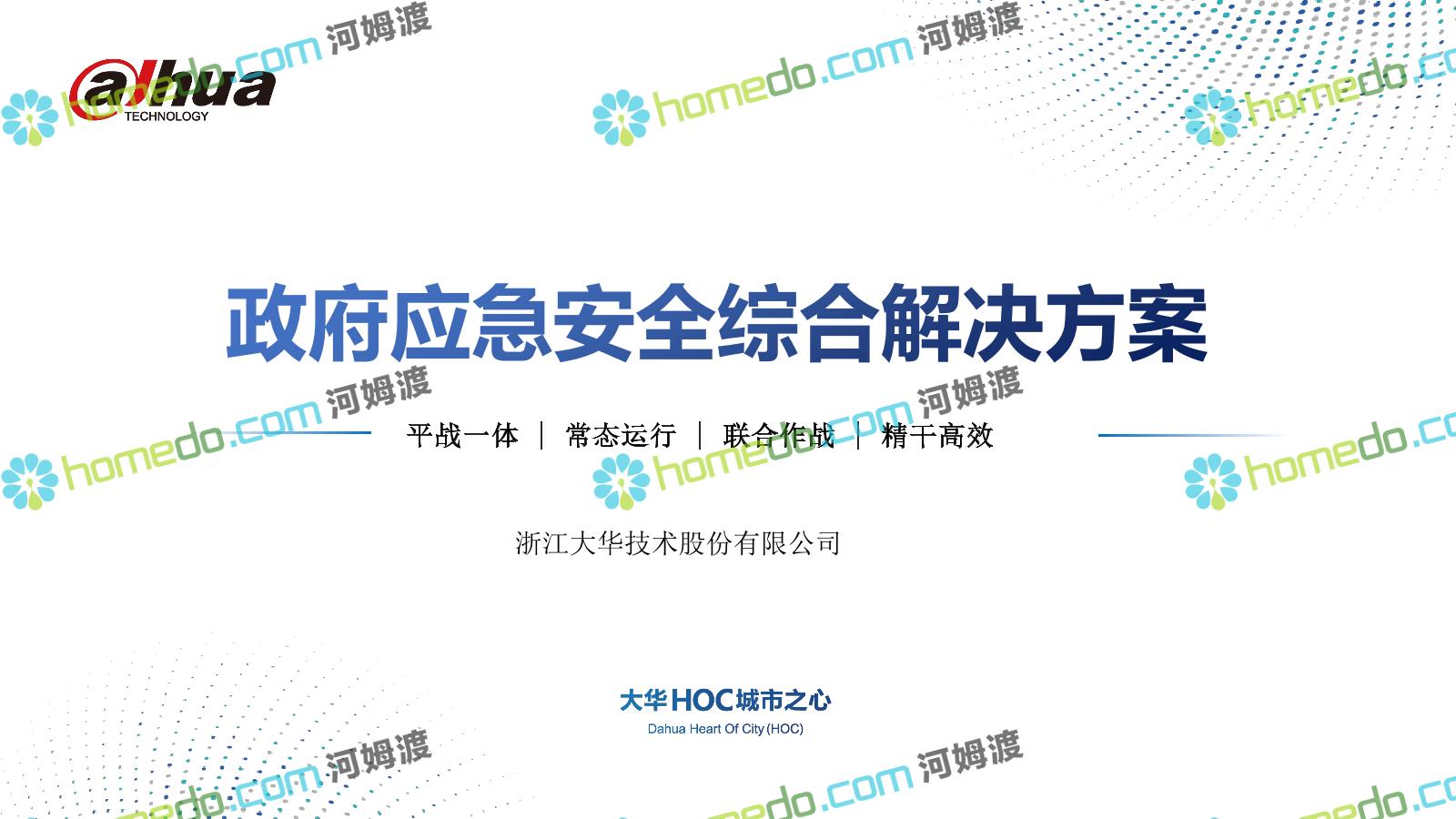 方案简介 构建一个平台:应急指挥调度平台 建设三个中心:应急指挥中心、分中心、移动指挥中心 整合应急资源:将现有各委办局数据充分利用, 全面对接,平战结合,统一调配