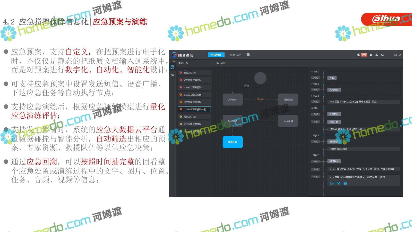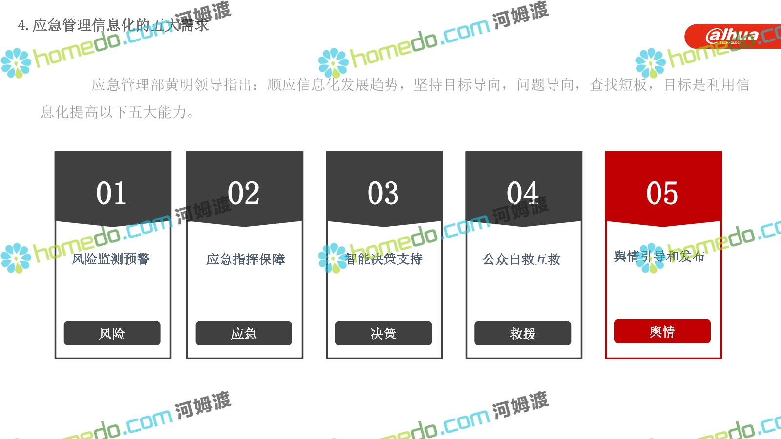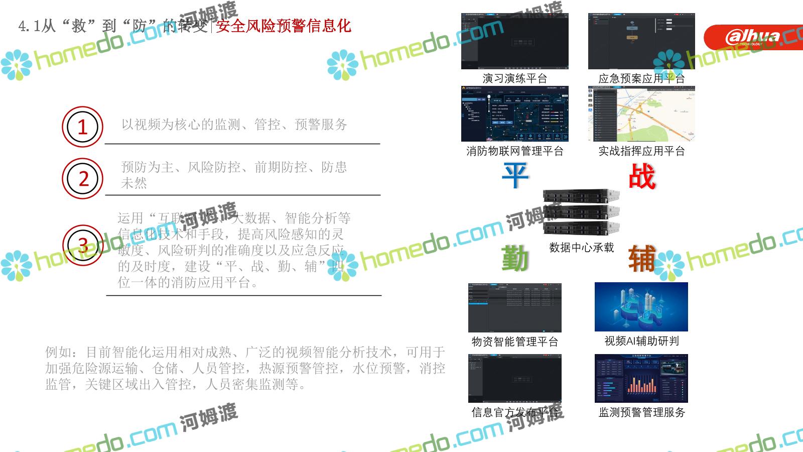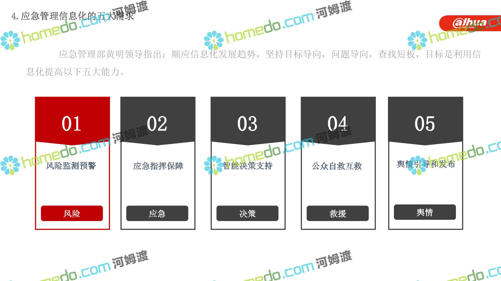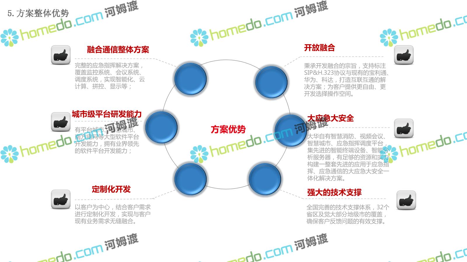 方案简介 构建一个平台:应急指挥调度平台 建设三个中心:应急指挥中心、分中心、移动指挥中心 整合应急资源:将现有各委办局数据充分利用, 全面对接,平战结合,统一调配