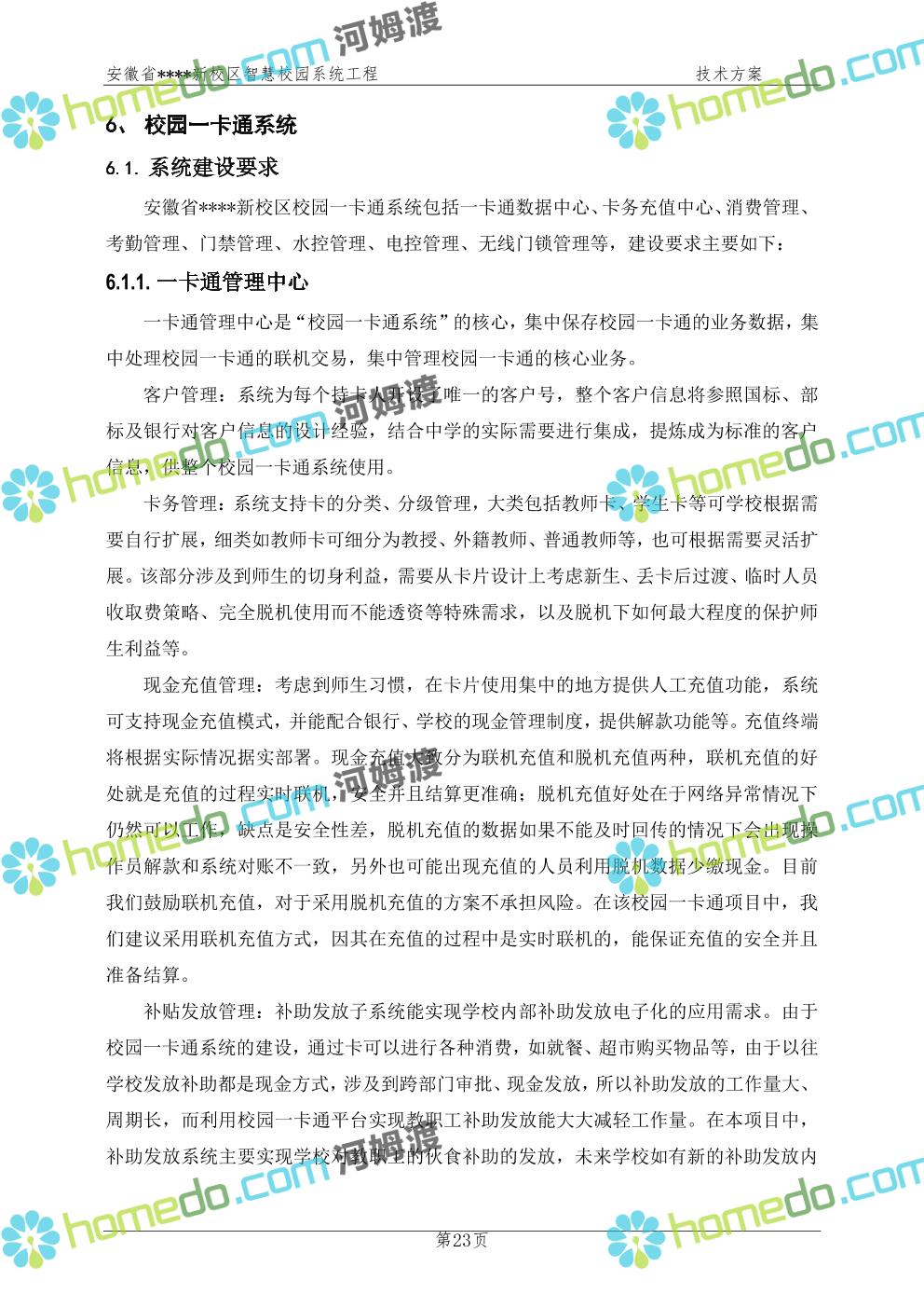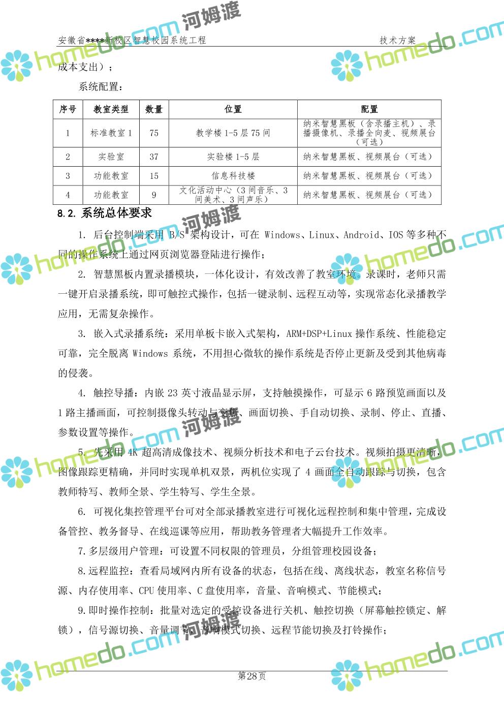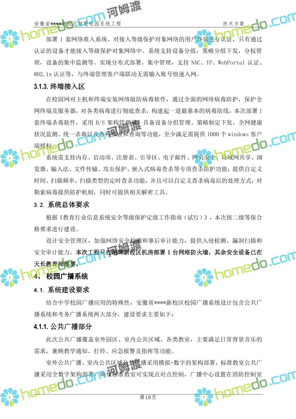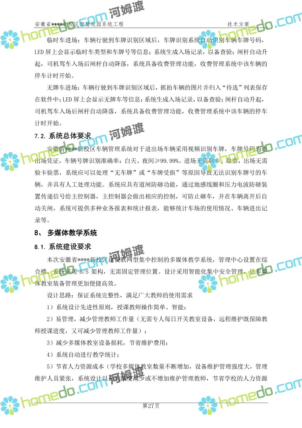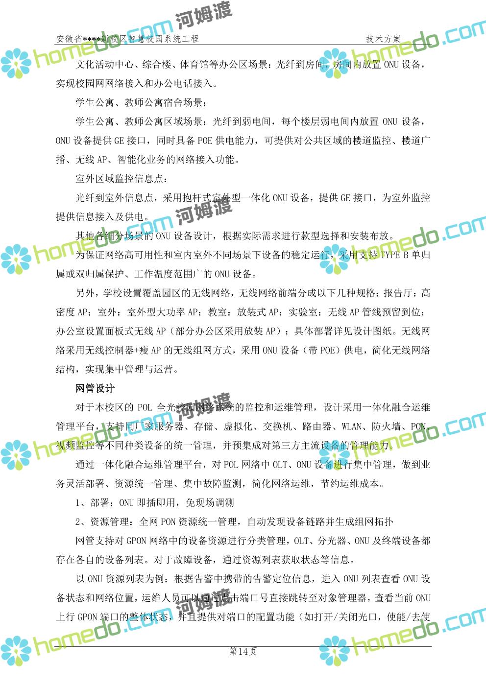 方案简介 通过智慧校园系统工程建设,为安徽省****新校区构造满足智慧校园应用长期持续发展的框架,通过稳定、可扩展的应用框架为校园应用系统建设提供良好的支撑和服务,充分支持新校区现有应用需求和未来发展。同时考虑项目投入性价比,采用先进的建设理念和思路,选用成熟主流、符合未来发展趋势的技术,运用现代系统工程和项目管理规范标准,科学合理的进行建设。