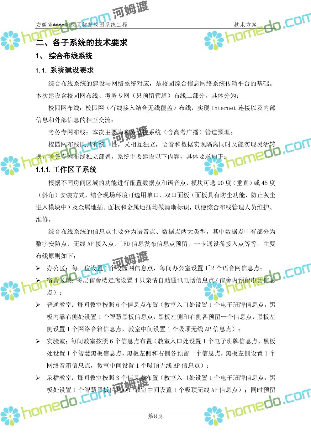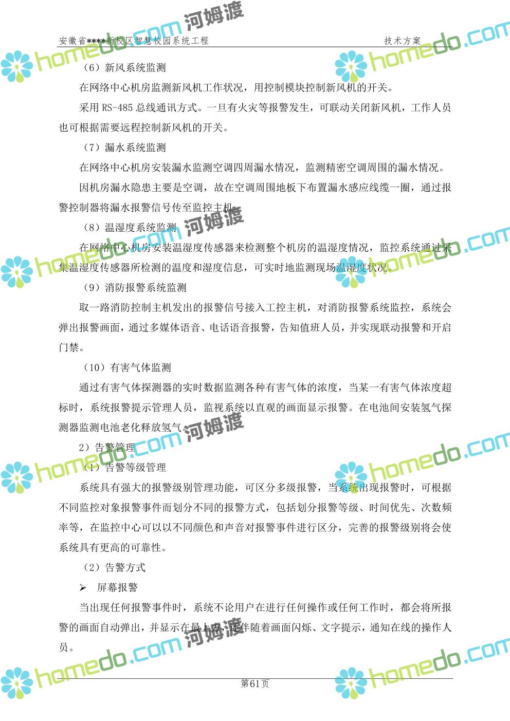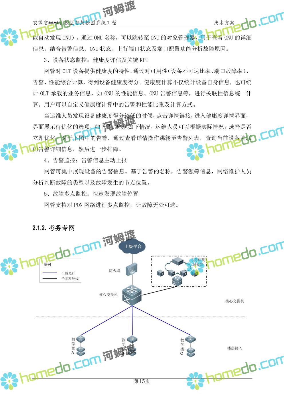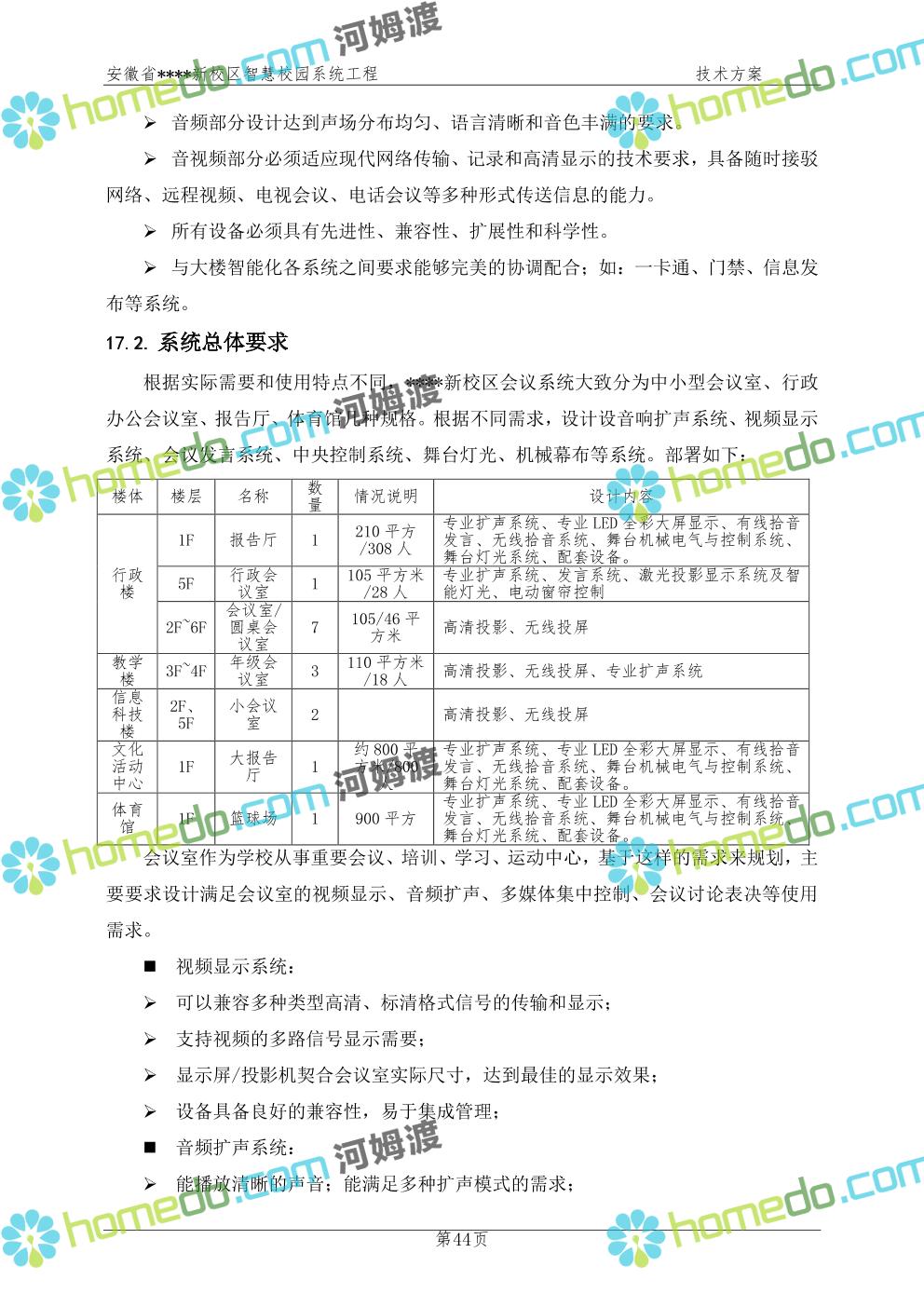 方案简介 通过智慧校园系统工程建设,为安徽省****新校区构造满足智慧校园应用长期持续发展的框架,通过稳定、可扩展的应用框架为校园应用系统建设提供良好的支撑和服务,充分支持新校区现有应用需求和未来发展。同时考虑项目投入性价比,采用先进的建设理念和思路,选用成熟主流、符合未来发展趋势的技术,运用现代系统工程和项目管理规范标准,科学合理的进行建设。
