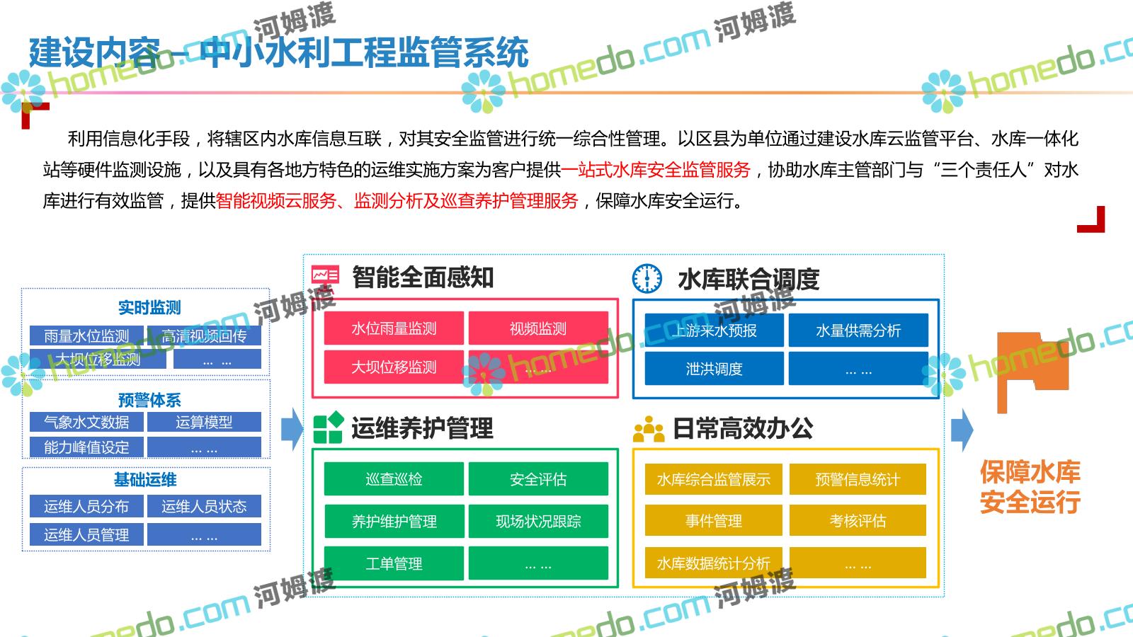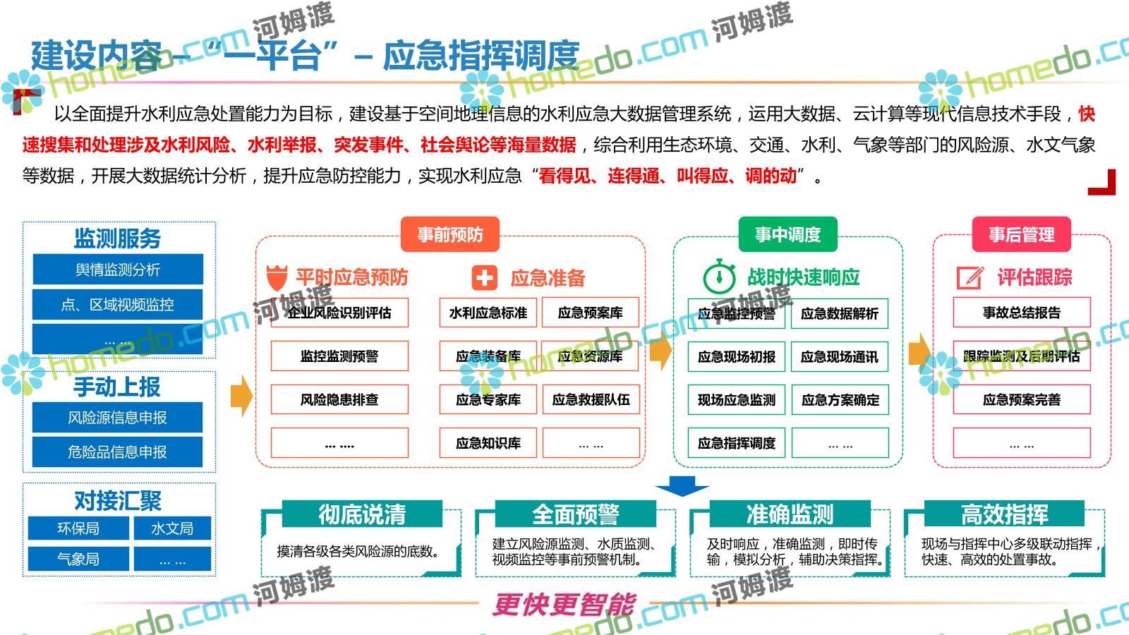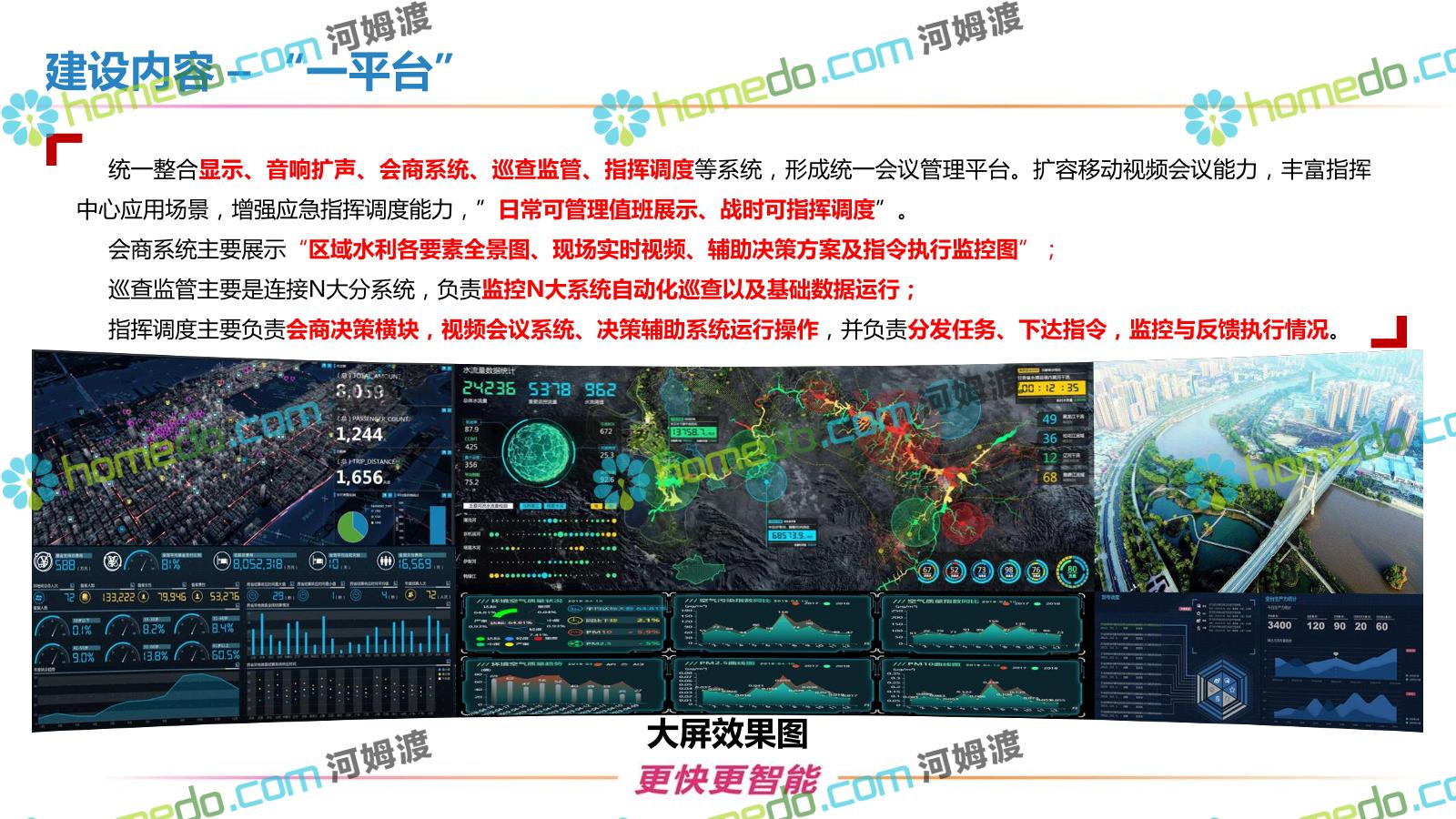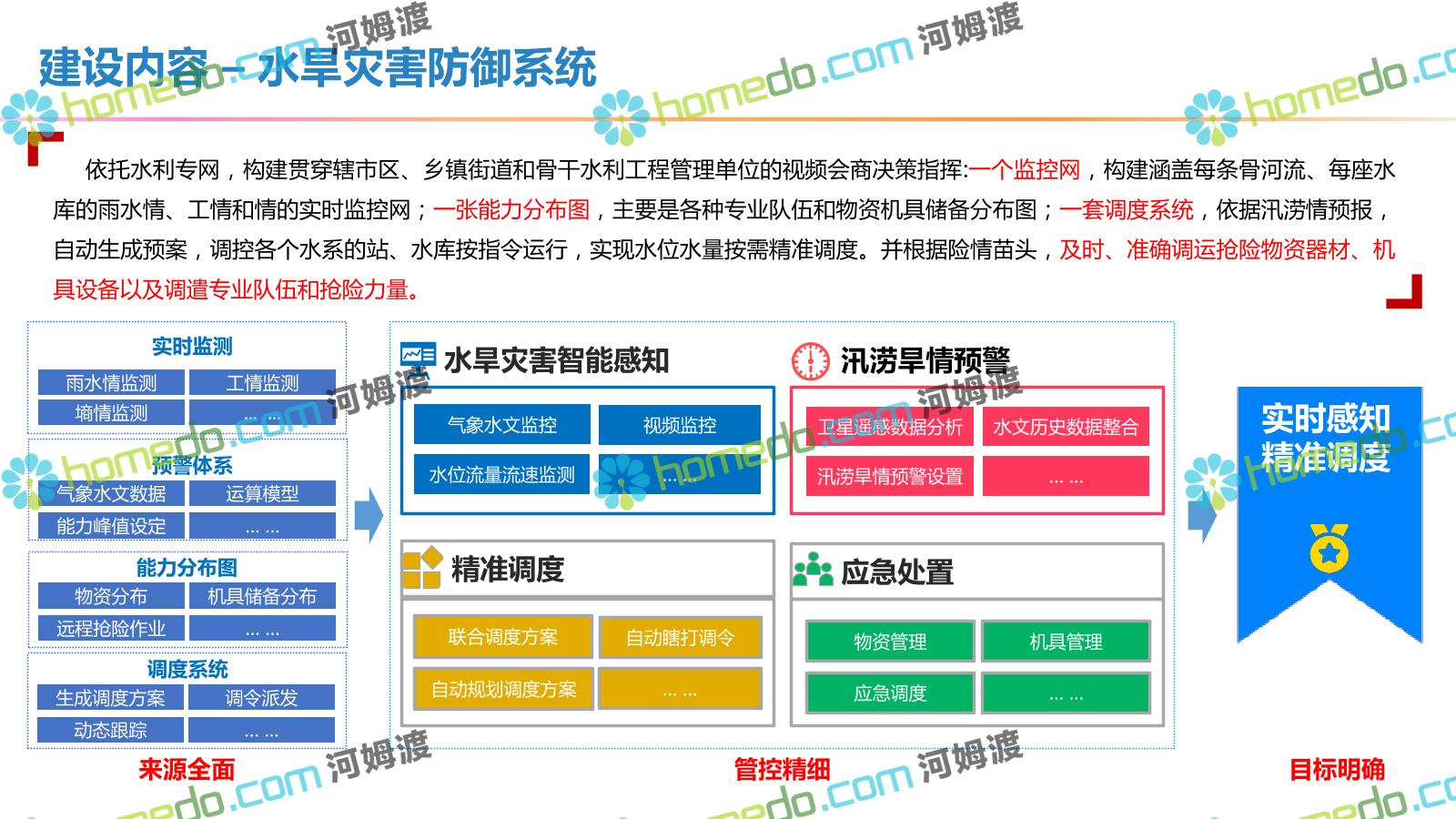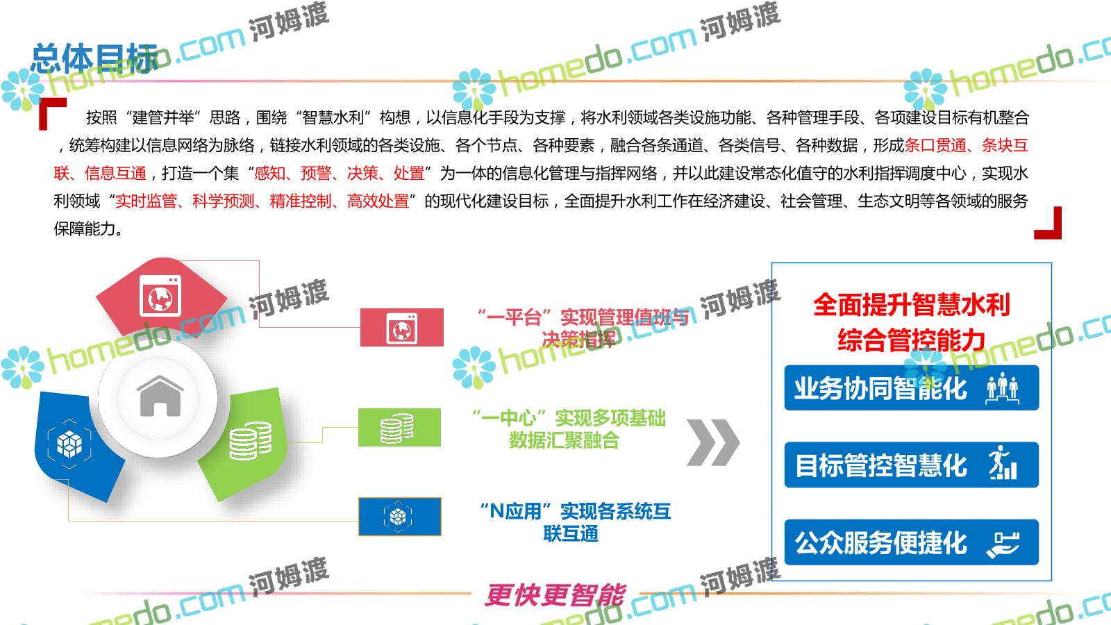 方案简介 按照“建管并举”思路,围绕“智慧水利”构想,以信息化手段为支撑,将水利领域各类设施功能、各种管理手段、各项建设目标有机整合,统筹构建以信息网络为脉络,链接水利领域的各类设施、各个节点、各种要素,融合各条通道、各类信号、各种数据,形成条口贯通、条块互联、信息互通,打造一个集“感知、预警、决策、处置”为一体的信息化管理与指挥网络,并以此建设常态化值守的水利指挥调度中心,实现水利领域“实时监管、科学预测、精准控制、高效处置”的现代化建设目标,全面提升水利工作在经济建设、社会管理、生态文明等各领域的服务保障能力。