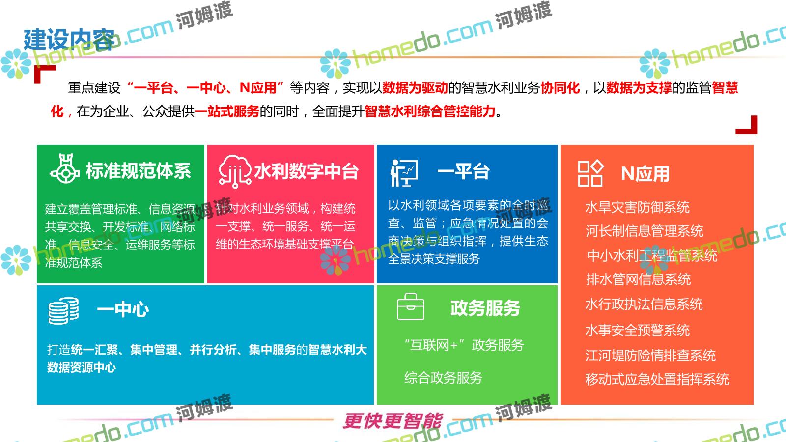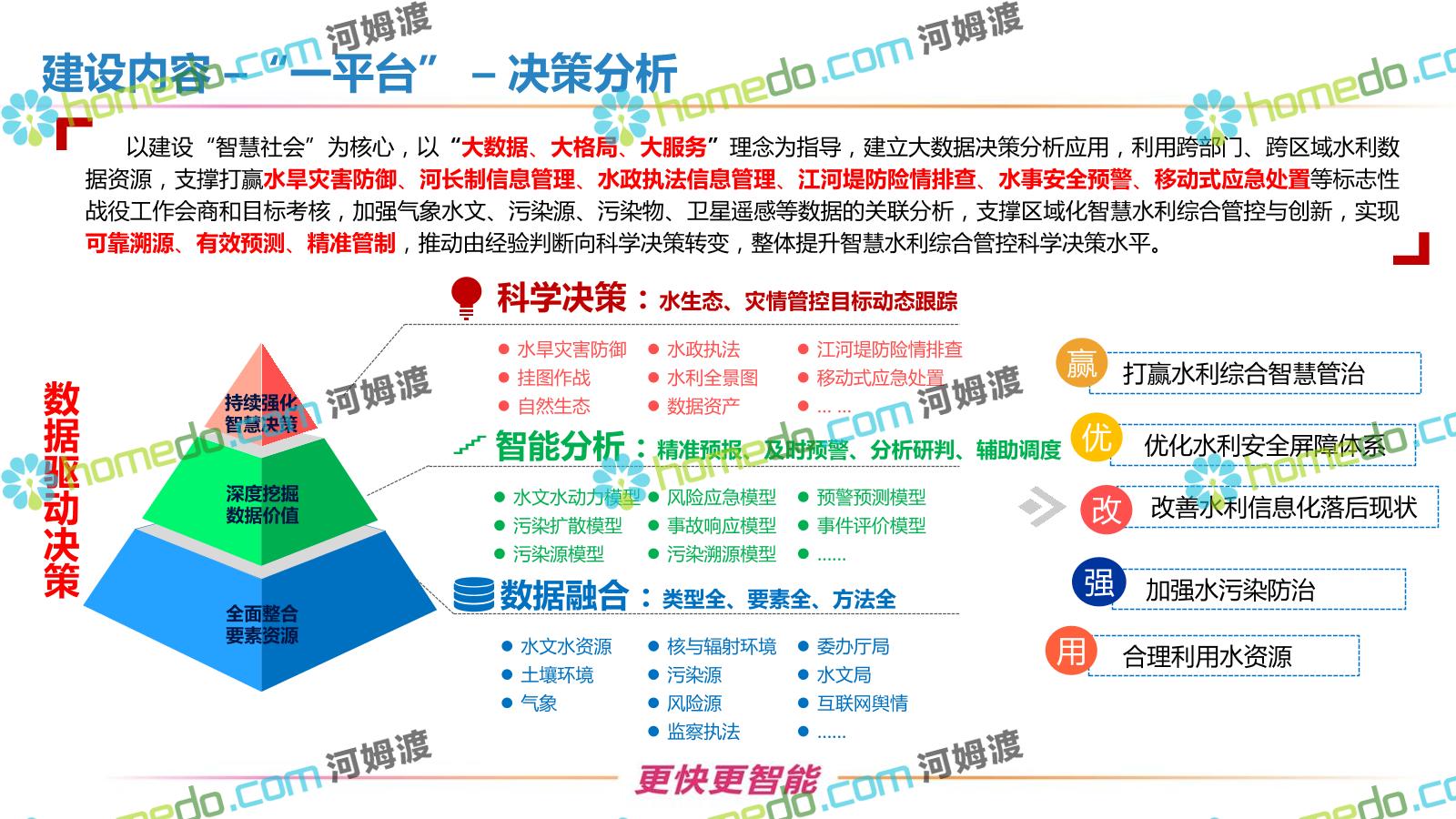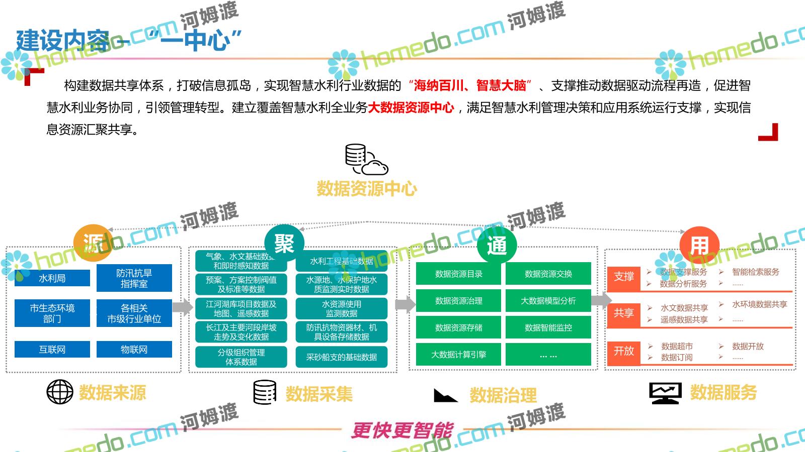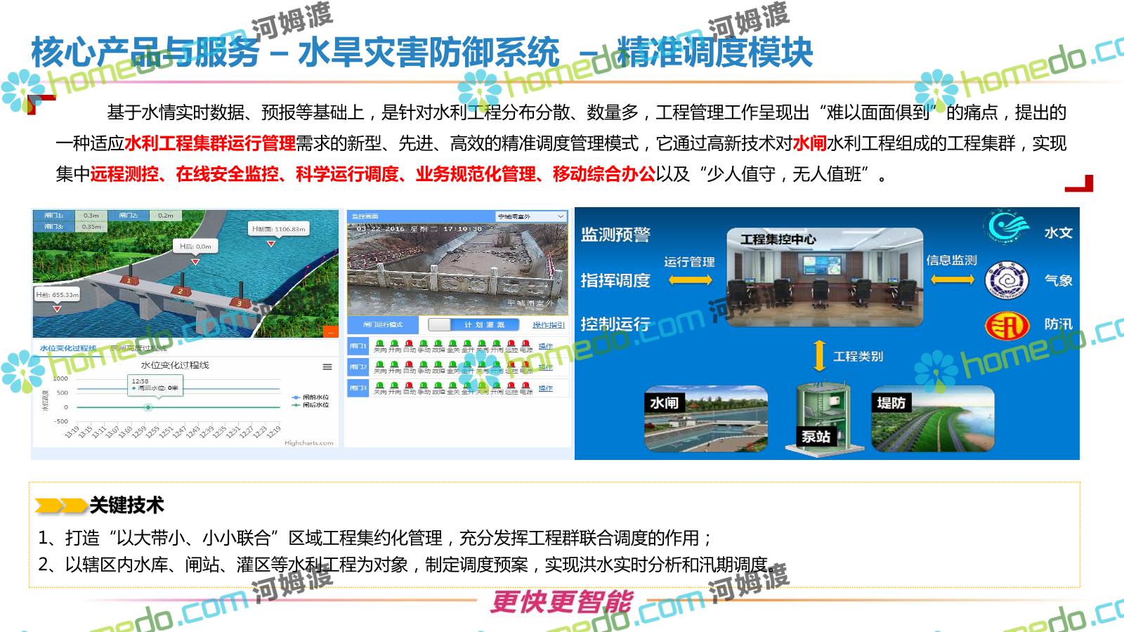 方案简介 按照“建管并举”思路,围绕“智慧水利”构想,以信息化手段为支撑,将水利领域各类设施功能、各种管理手段、各项建设目标有机整合,统筹构建以信息网络为脉络,链接水利领域的各类设施、各个节点、各种要素,融合各条通道、各类信号、各种数据,形成条口贯通、条块互联、信息互通,打造一个集“感知、预警、决策、处置”为一体的信息化管理与指挥网络,并以此建设常态化值守的水利指挥调度中心,实现水利领域“实时监管、科学预测、精准控制、高效处置”的现代化建设目标,全面提升水利工作在经济建设、社会管理、生态文明等各领域的服务保障能力。