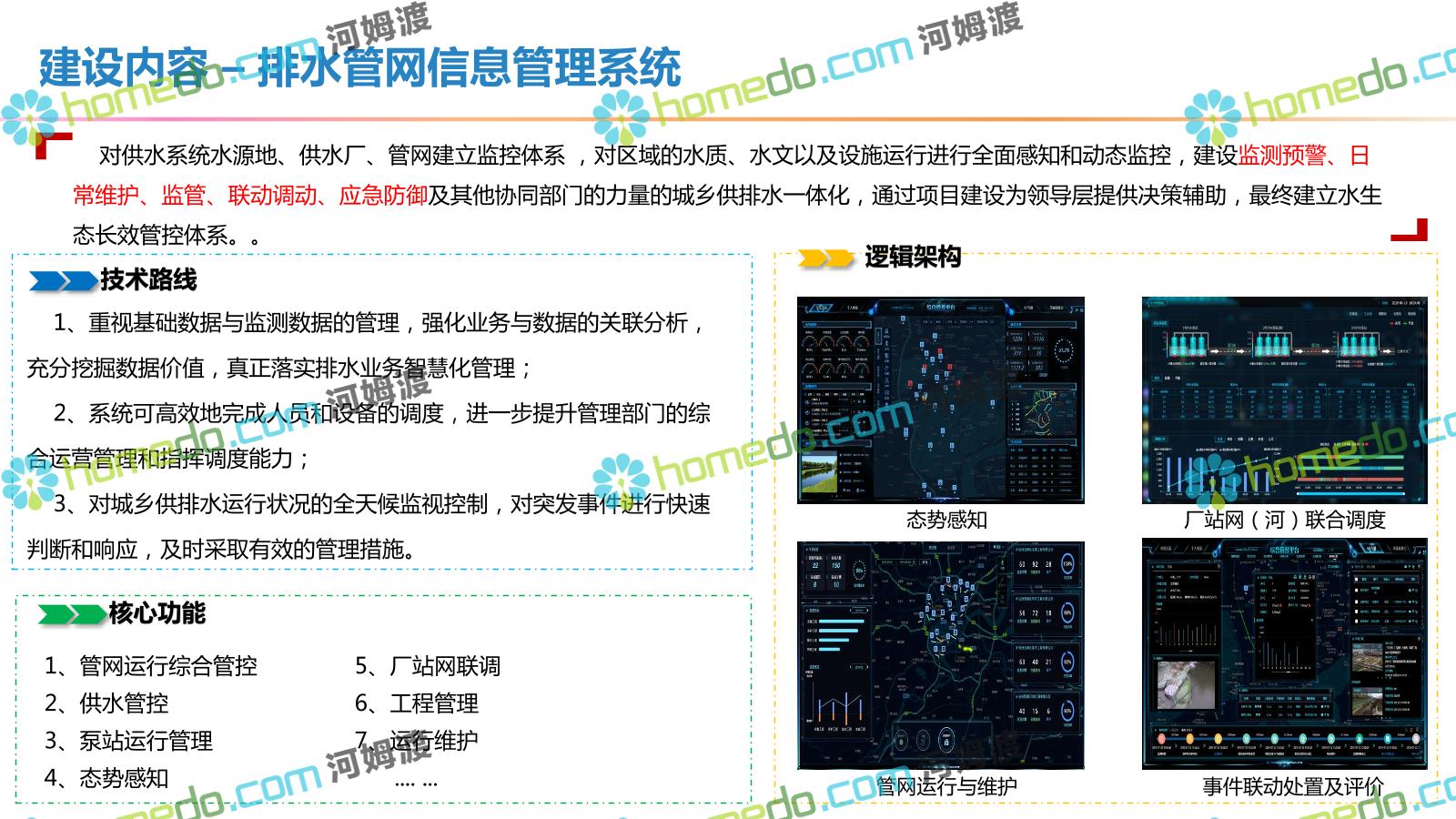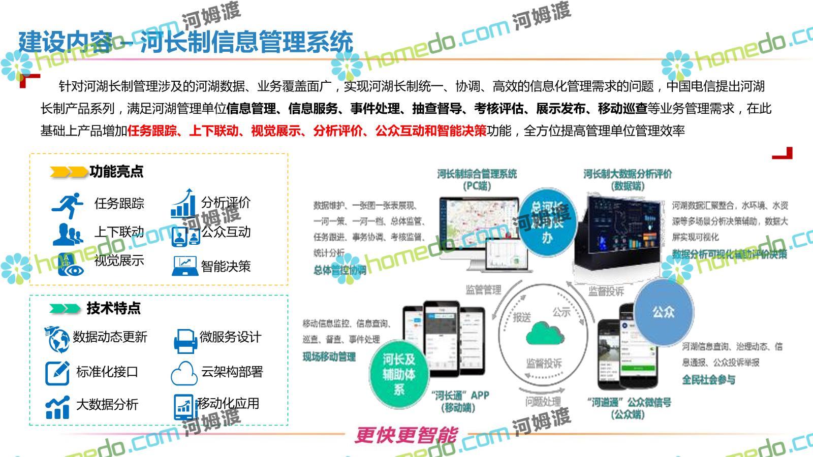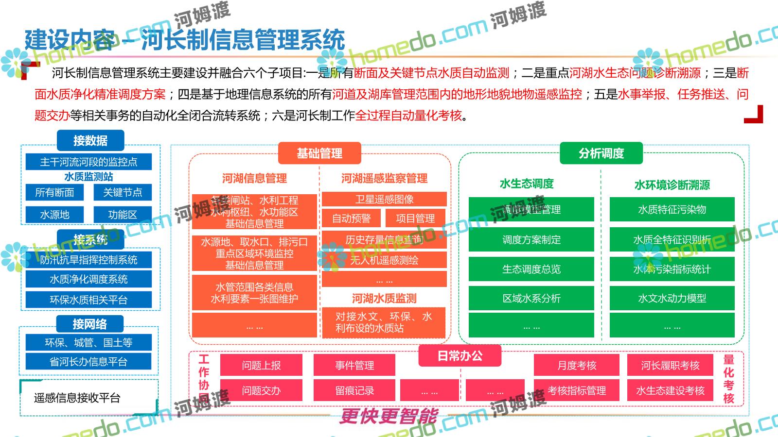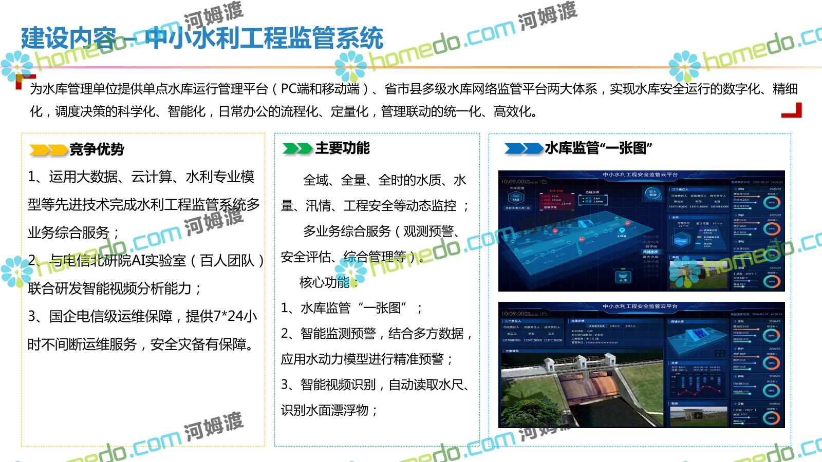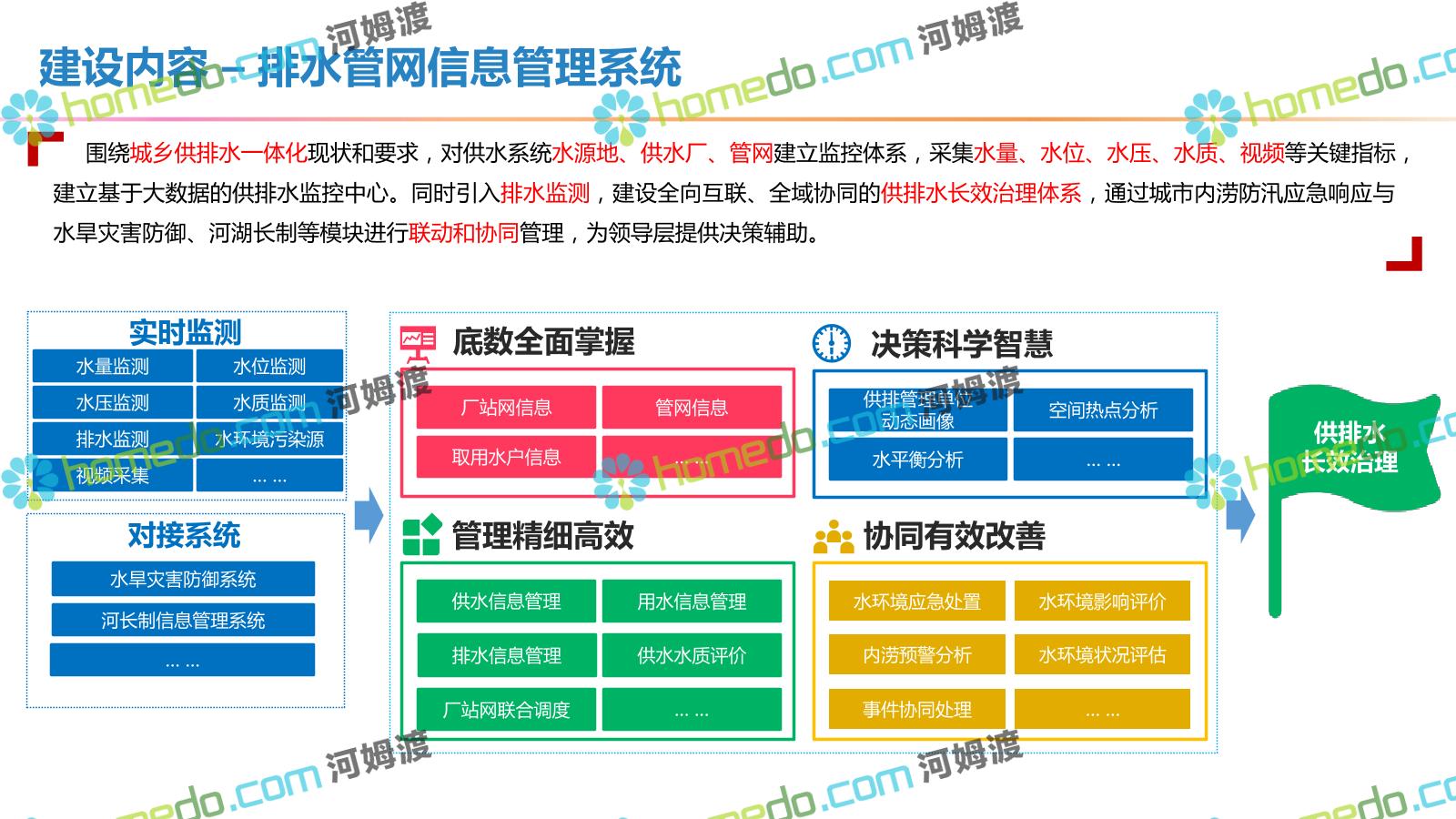方案简介 按照“建管并举”思路,围绕“智慧水利”构想,以信息化手段为支撑,将水利领域各类设施功能、各种管理手段、各项建设目标有机整合,统筹构建以信息网络为脉络,链接水利领域的各类设施、各个节点、各种要素,融合各条通道、各类信号、各种数据,形成条口贯通、条块互联、信息互通,打造一个集“感知、预警、决策、处置”为一体的信息化管理与指挥网络,并以此建设常态化值守的水利指挥调度中心,实现水利领域“实时监管、科学预测、精准控制、高效处置”的现代化建设目标,全面提升水利工作在经济建设、社会管理、生态文明等各领域的服务保障能力。
