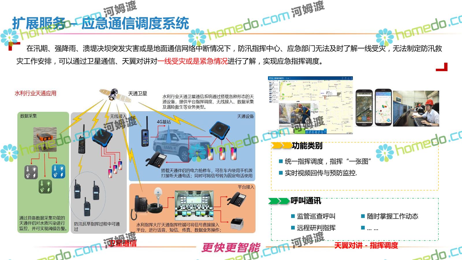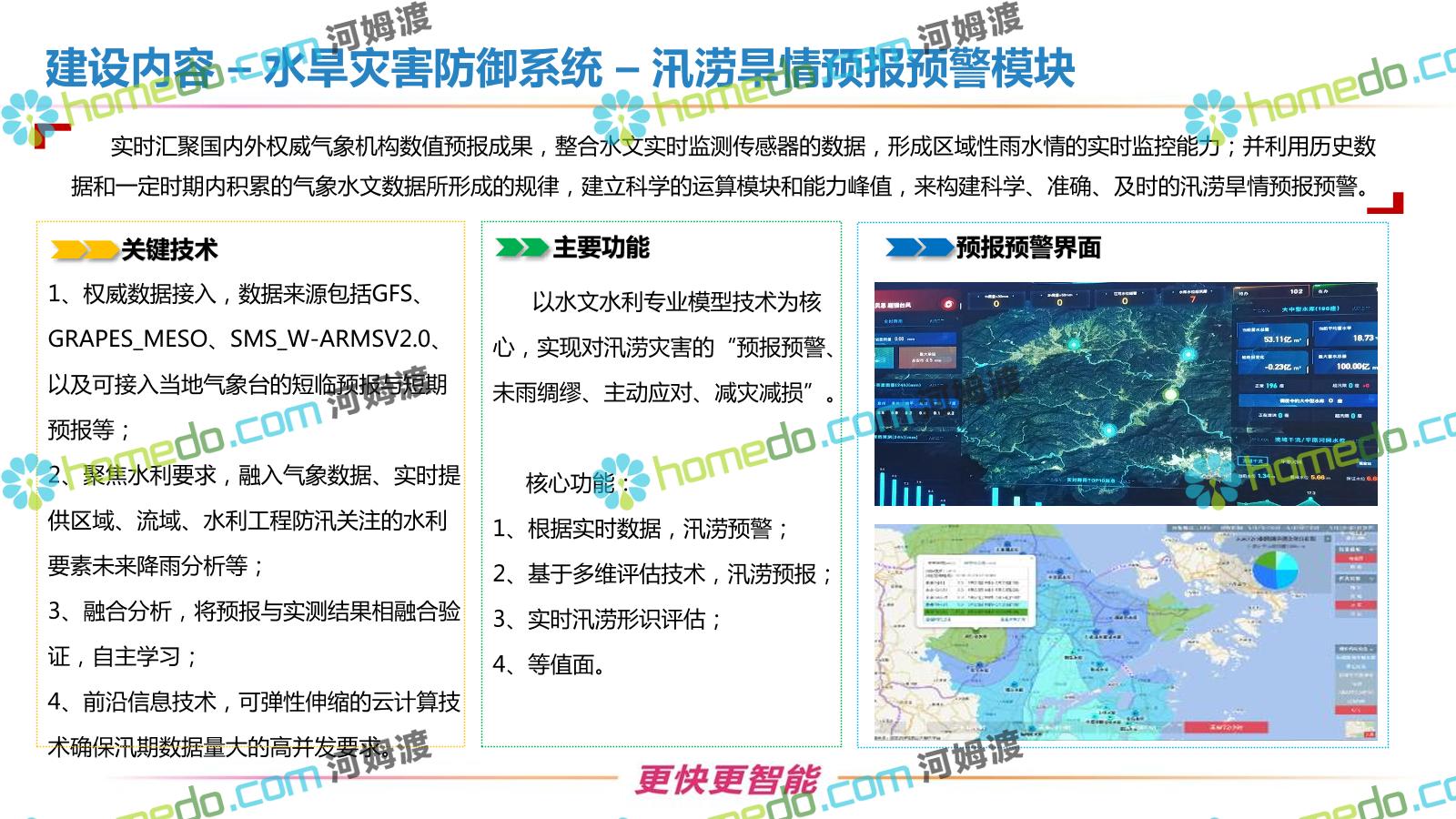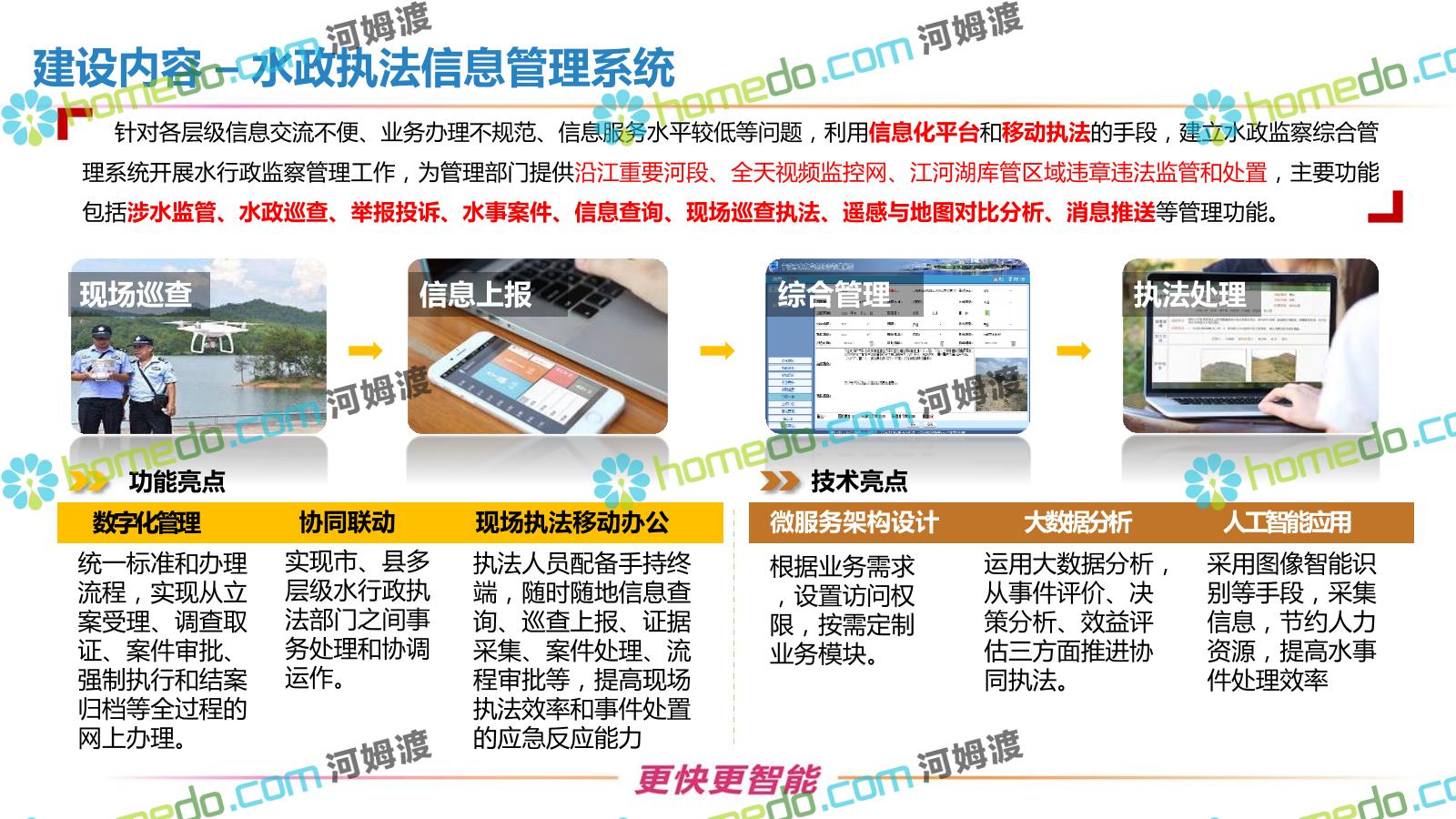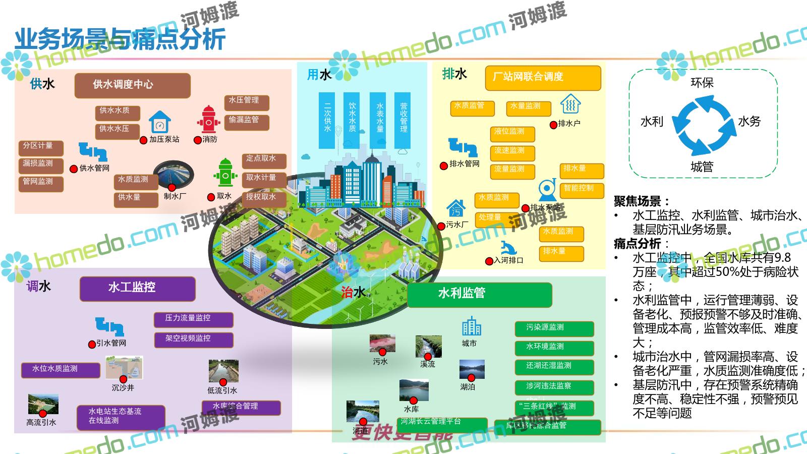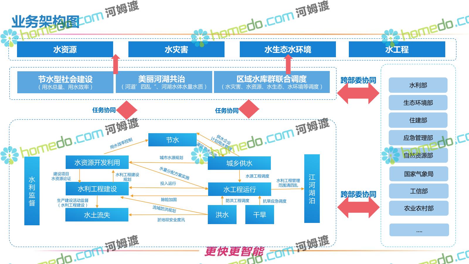 方案简介 按照“建管并举”思路,围绕“智慧水利”构想,以信息化手段为支撑,将水利领域各类设施功能、各种管理手段、各项建设目标有机整合,统筹构建以信息网络为脉络,链接水利领域的各类设施、各个节点、各种要素,融合各条通道、各类信号、各种数据,形成条口贯通、条块互联、信息互通,打造一个集“感知、预警、决策、处置”为一体的信息化管理与指挥网络,并以此建设常态化值守的水利指挥调度中心,实现水利领域“实时监管、科学预测、精准控制、高效处置”的现代化建设目标,全面提升水利工作在经济建设、社会管理、生态文明等各领域的服务保障能力。
