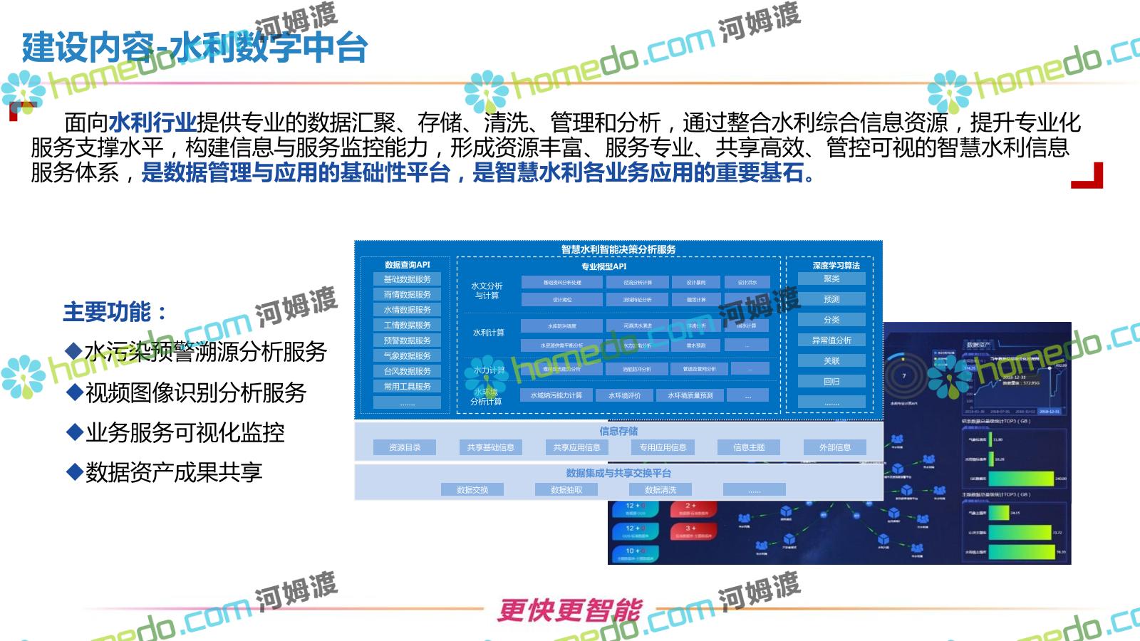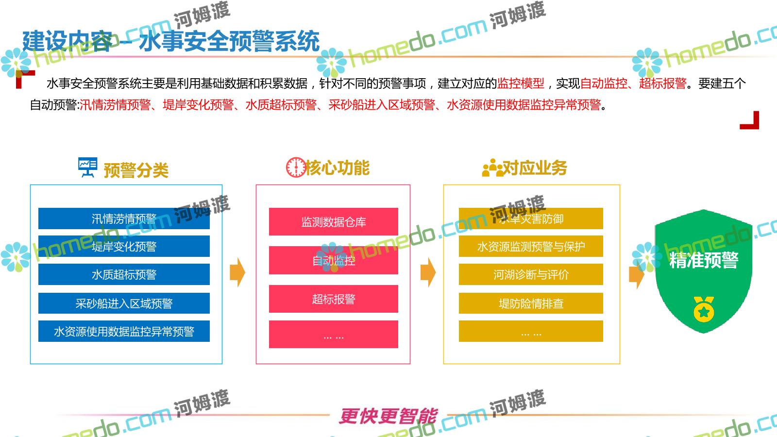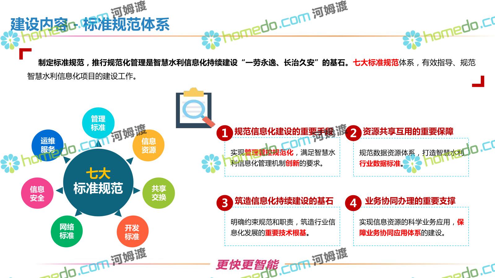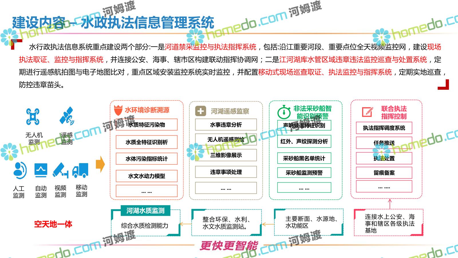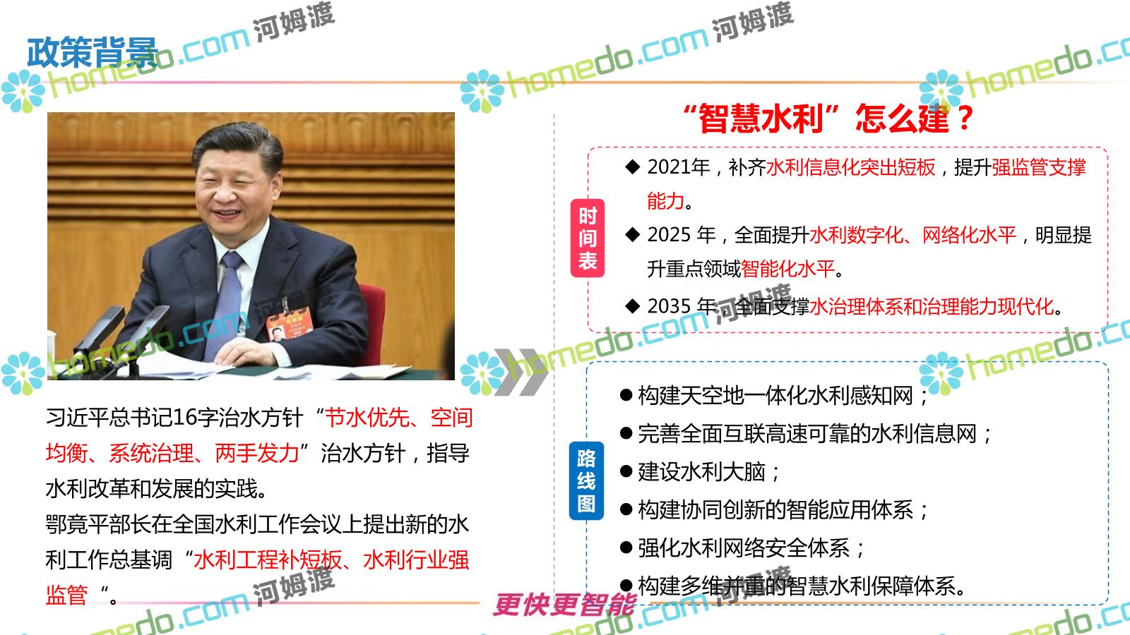 方案简介 按照“建管并举”思路,围绕“智慧水利”构想,以信息化手段为支撑,将水利领域各类设施功能、各种管理手段、各项建设目标有机整合,统筹构建以信息网络为脉络,链接水利领域的各类设施、各个节点、各种要素,融合各条通道、各类信号、各种数据,形成条口贯通、条块互联、信息互通,打造一个集“感知、预警、决策、处置”为一体的信息化管理与指挥网络,并以此建设常态化值守的水利指挥调度中心,实现水利领域“实时监管、科学预测、精准控制、高效处置”的现代化建设目标,全面提升水利工作在经济建设、社会管理、生态文明等各领域的服务保障能力。